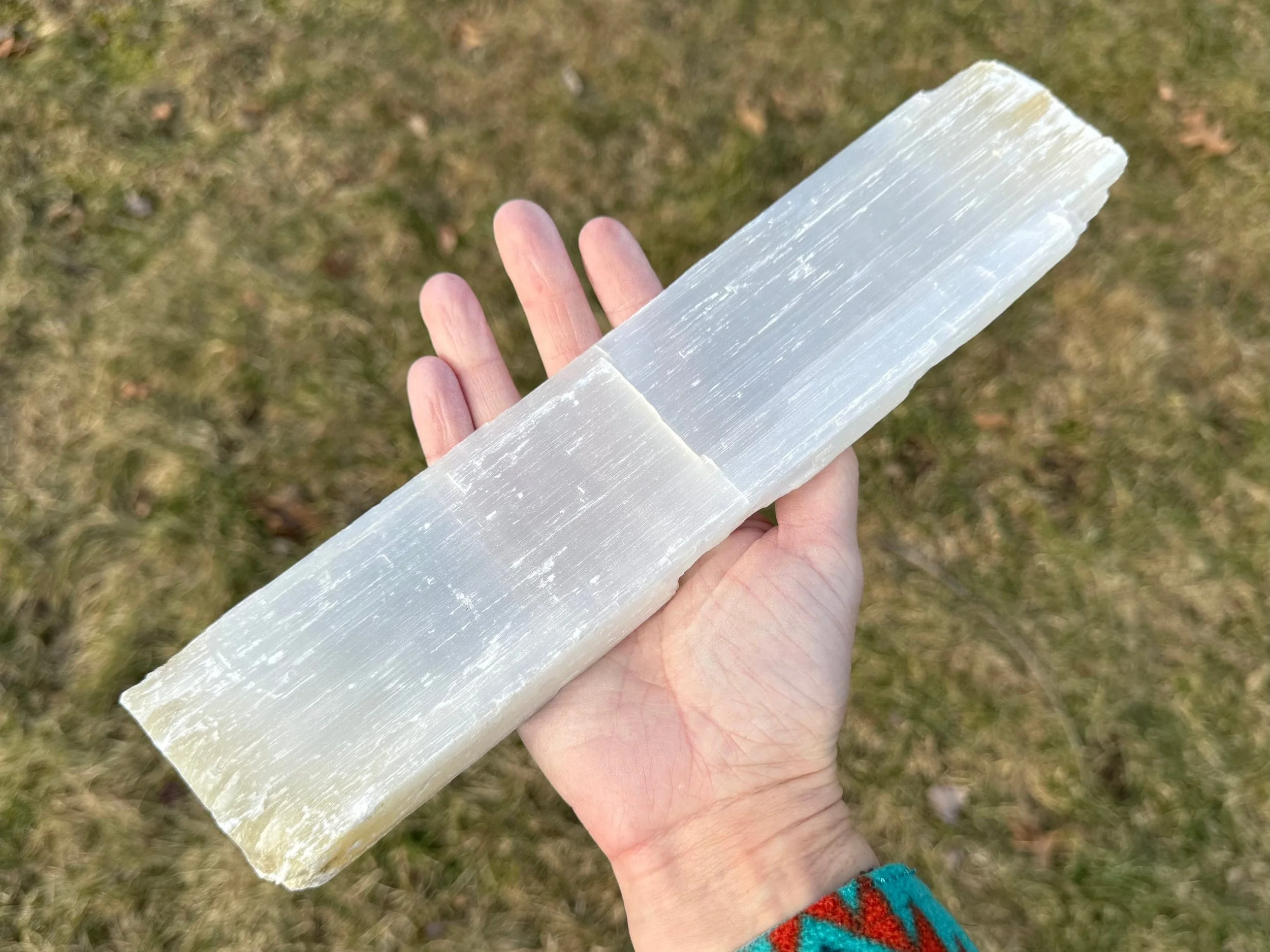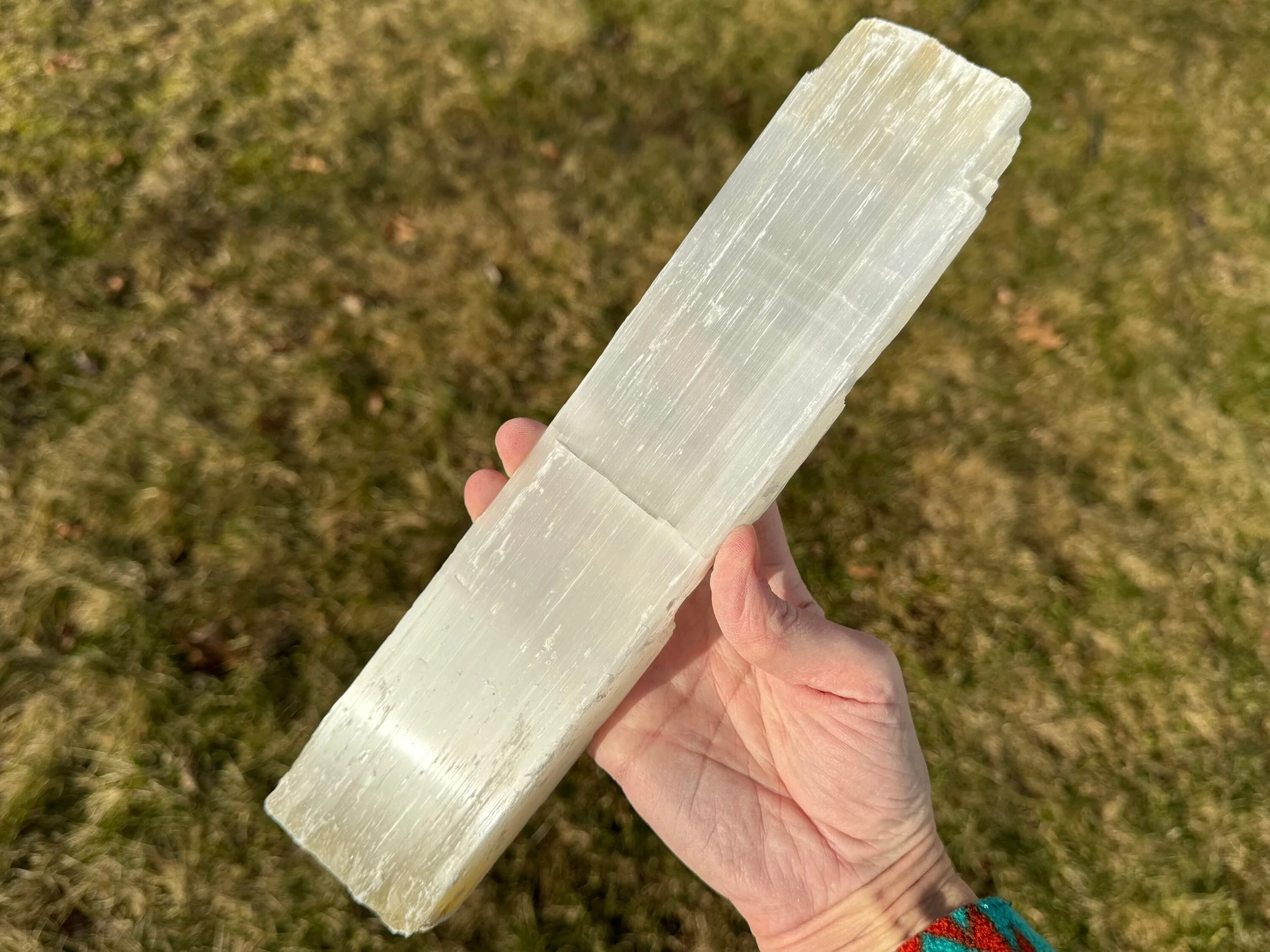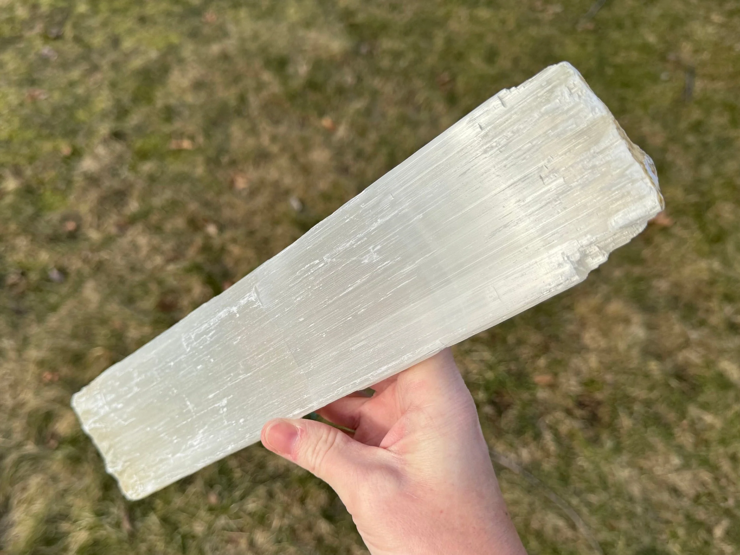 This is a large, raw stick of Satin Spar Selenite from Morocco.