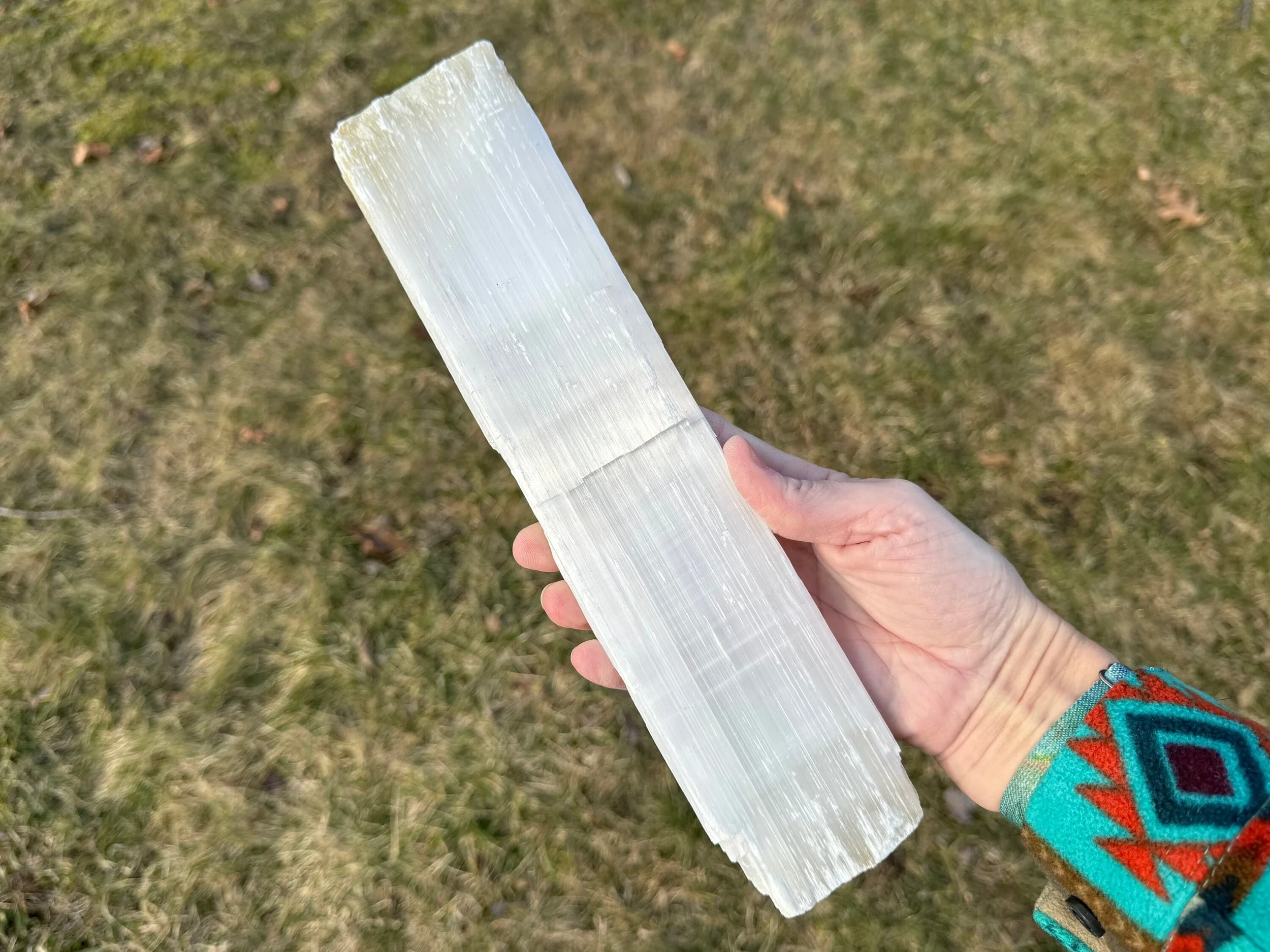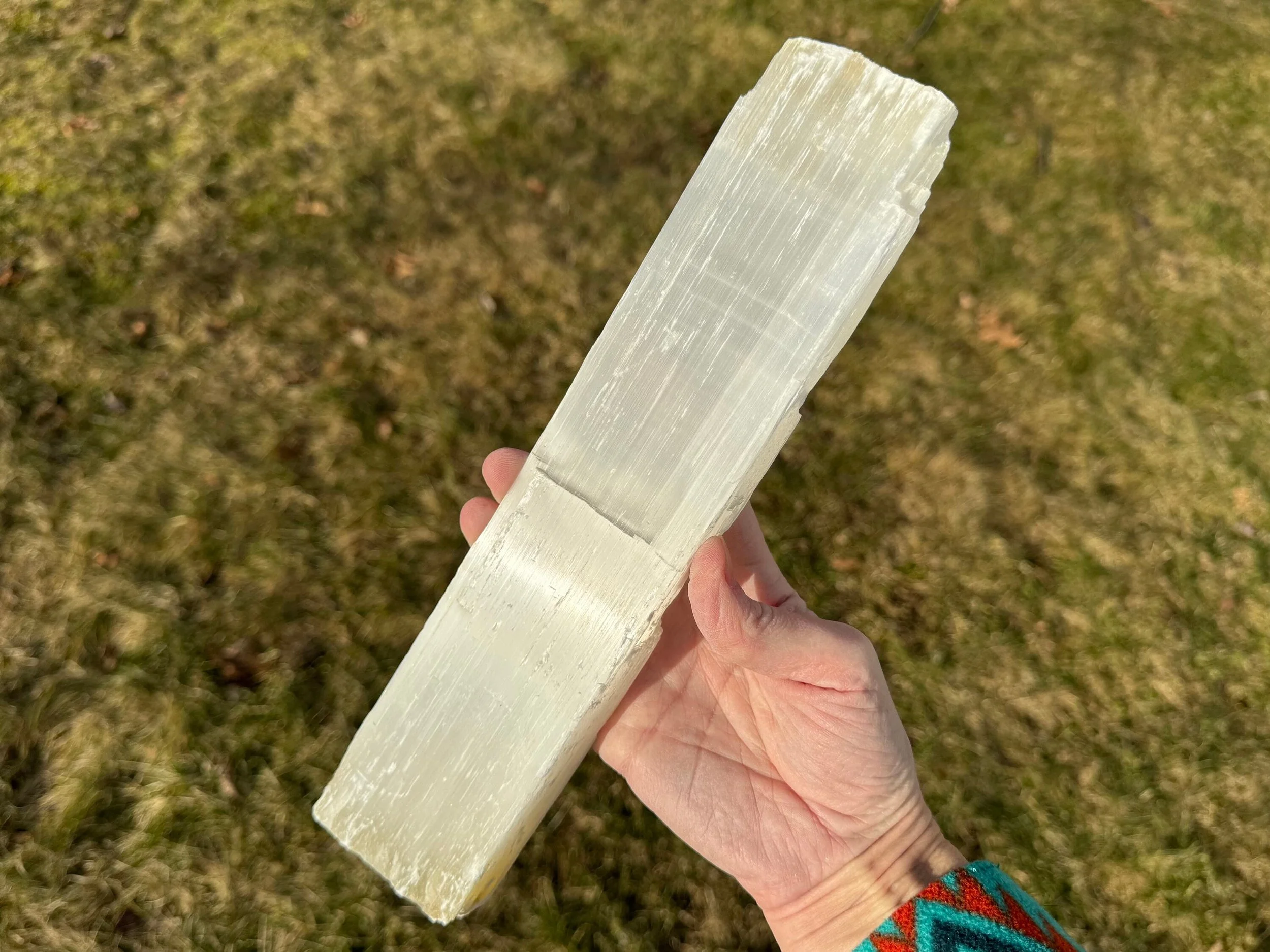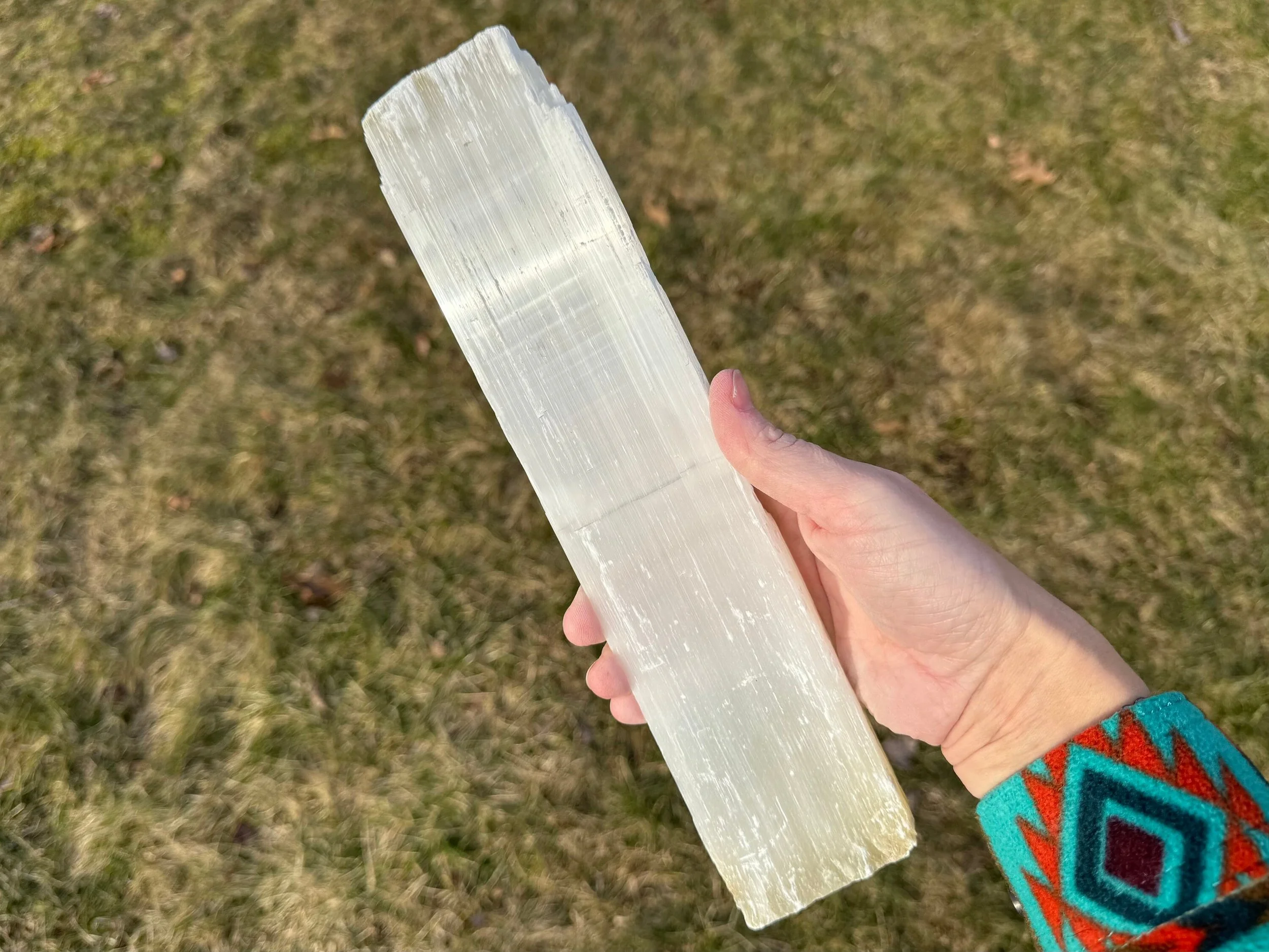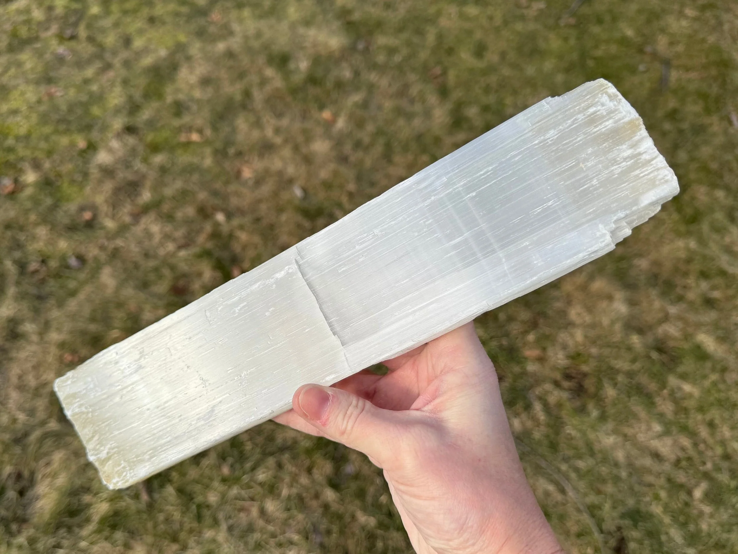 This is a large, raw stick of Satin Spar Selenite from Morocco.