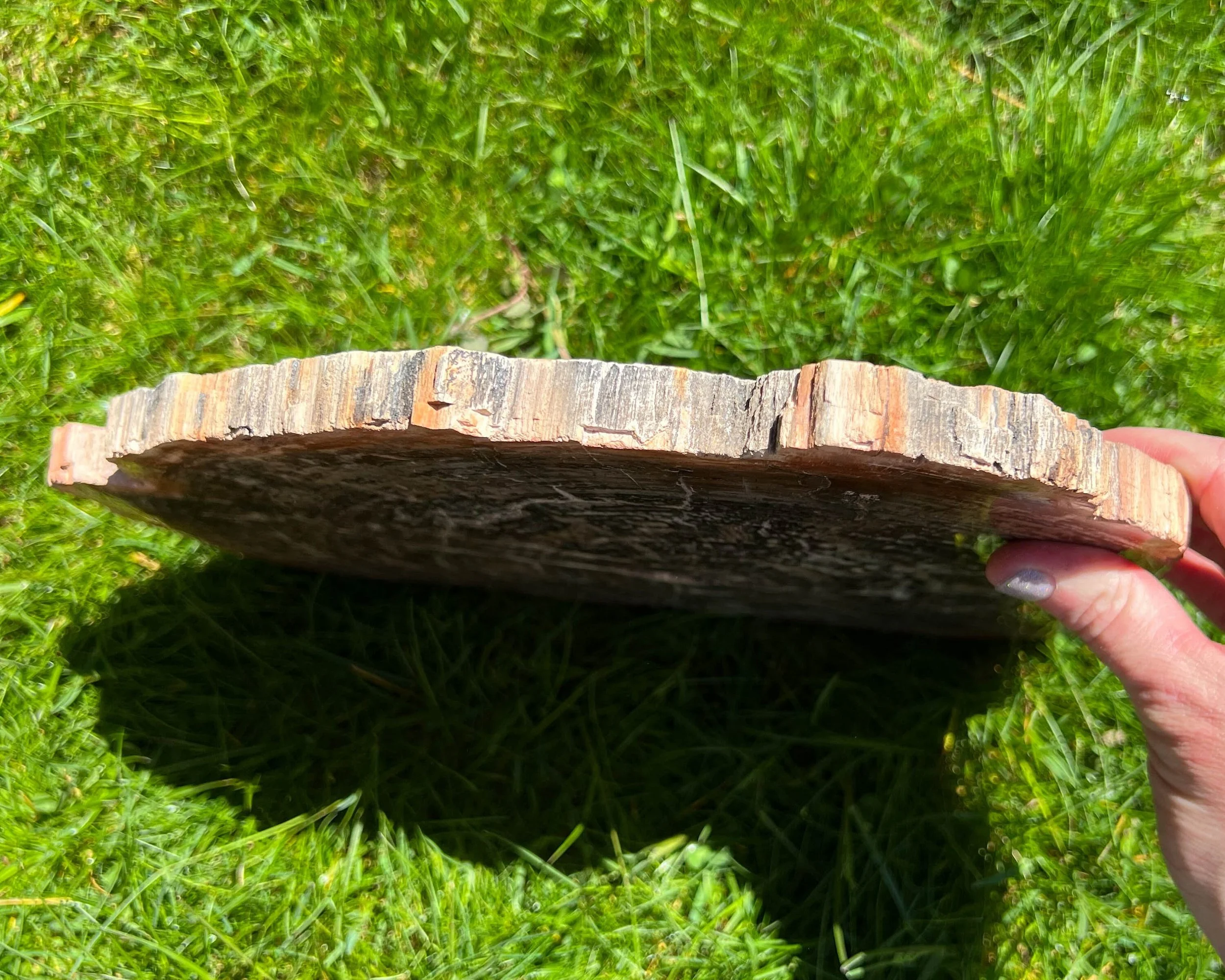 This is a beautiful very large Petrified Wood slab from Madagascar. It has sparkly druzy Quartz in it and lots of crystal Quartz veins. It is polished on both sides with the edges left natural. This one has beautiful black, browns, dark browns, caramels, and light beiges with white sparkling Quartz. The color and patterns are lovely.
