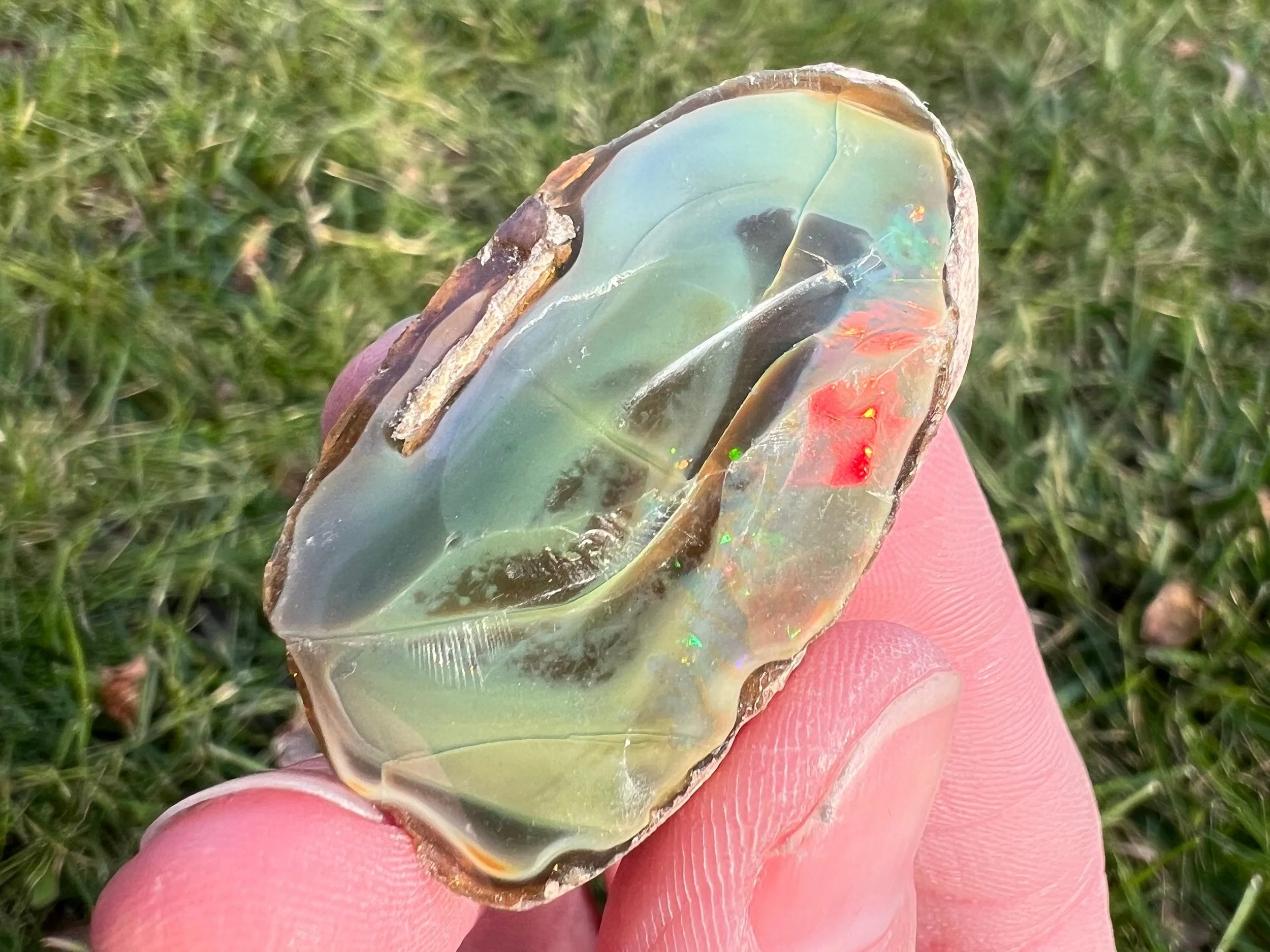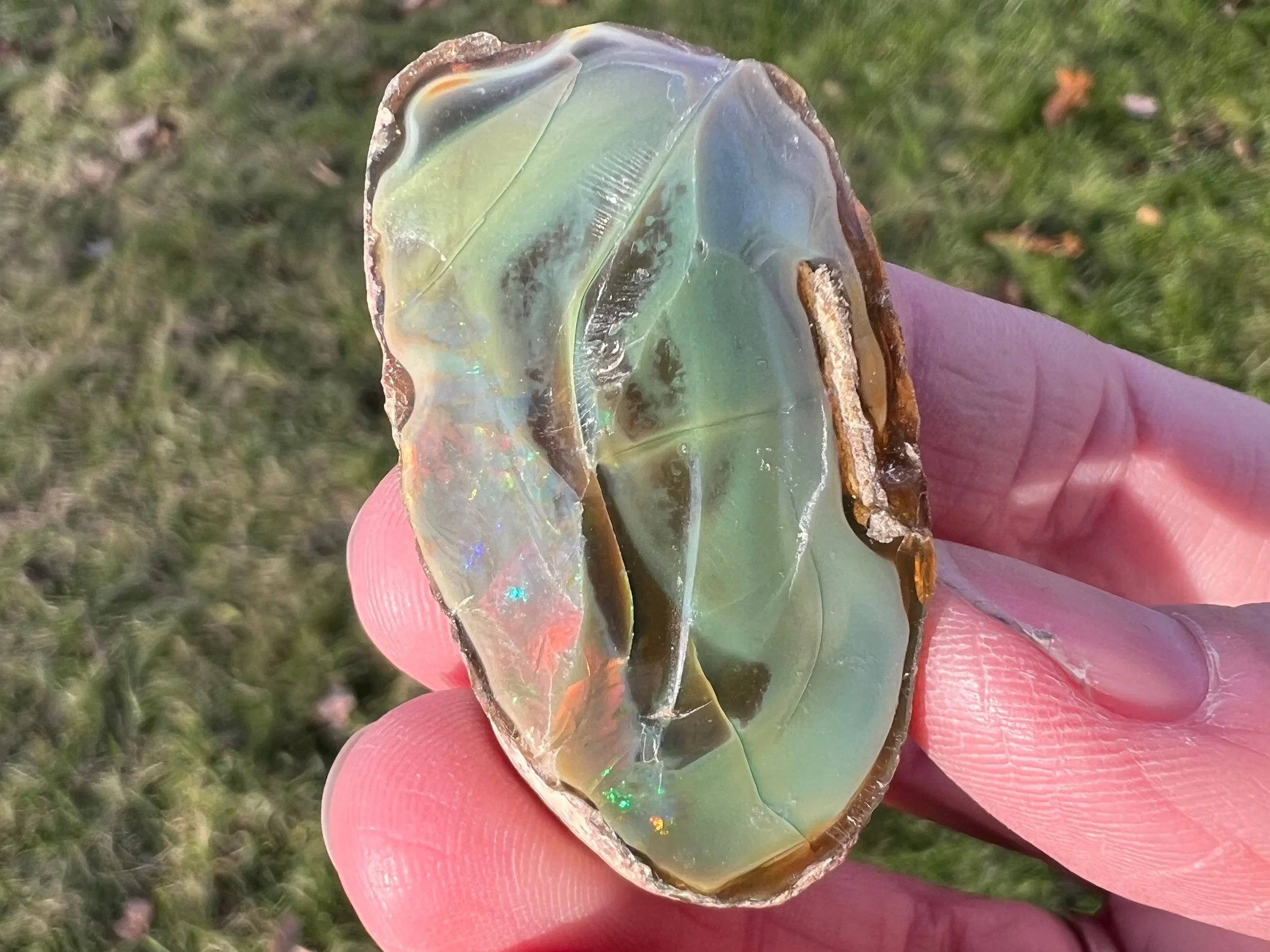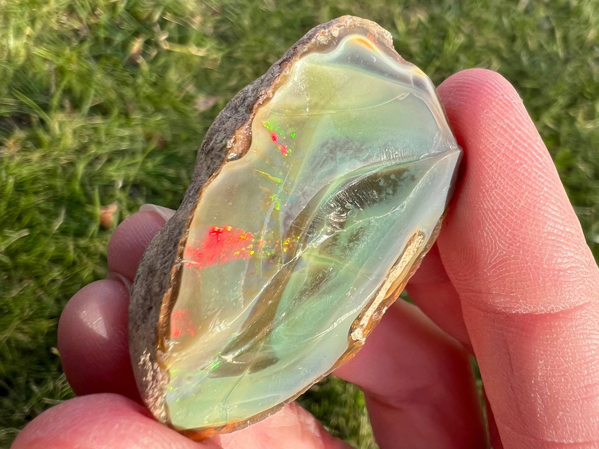 This is a large, flashy, rough blue Ethiopian Welo Opal. It is an opaque naturally blue opal with bright rainbow fire in a section of the opal. The bluest part of the opal isn't flashy but has a beautiful color to it. On the back there is another section that has the tiniest sparkles of rainbow flash in it, similarly along one side of the area, so small you can't even see it on camera but they are there and very cute and pretty!