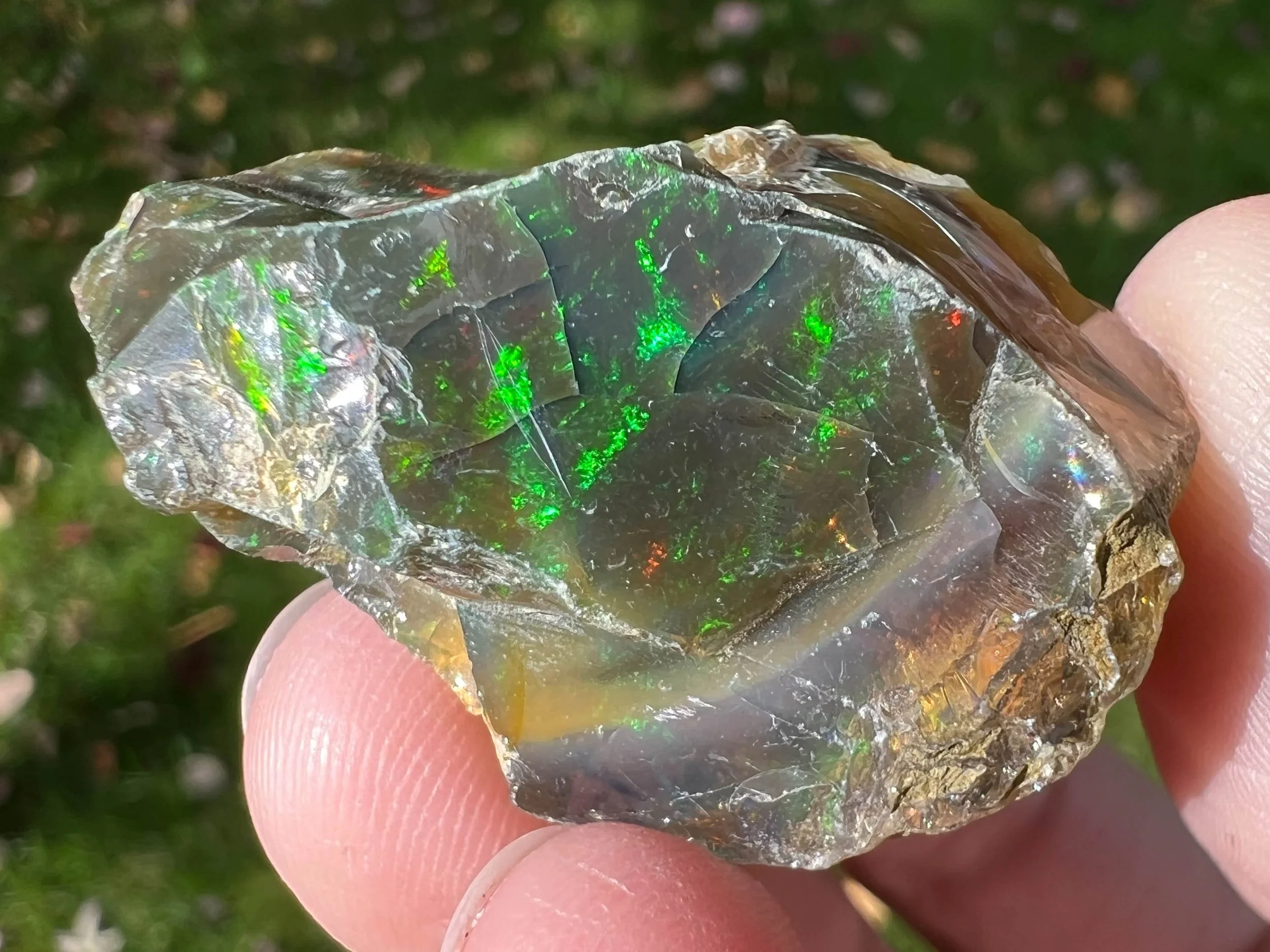 This is a flashy, large rough Ethiopian Welo Opal. It is a black to gray opal with rainbow flash all over. Some parts are darker, some lighter gray with one end having a caramel color and then clear opal. One small side is light gray. It has flash in every part, even where you can't really see it in the photos - many different angles and sides and they've all got flash! Completely raw, rough, and natural.