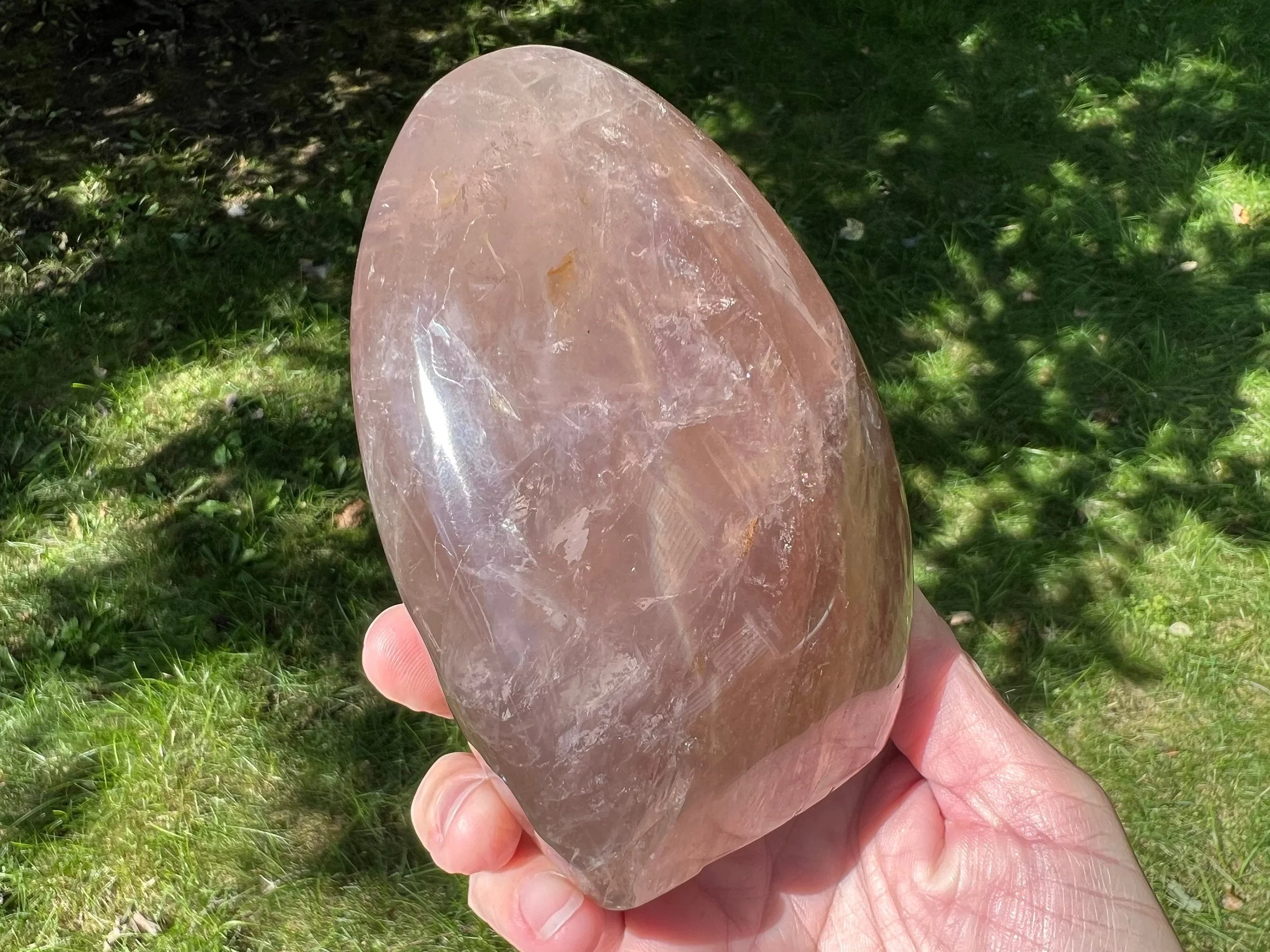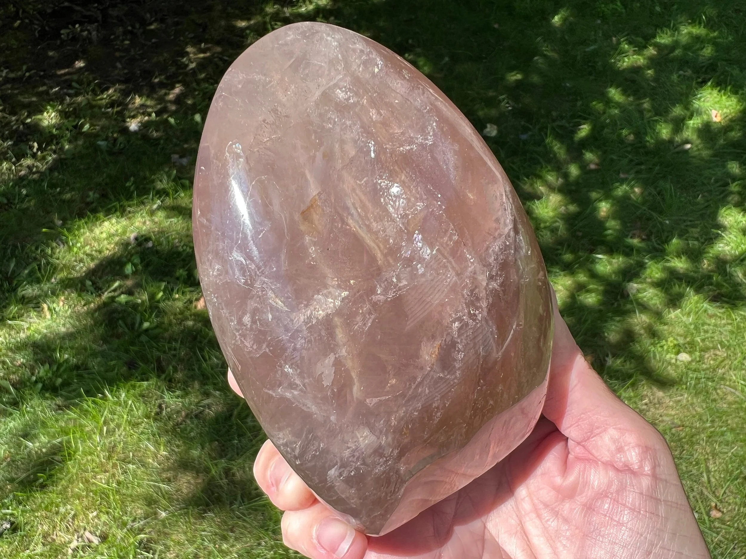 This is a self standing crystal freeform of Star Rose Quartz. It is polished with a flat base. It is translucent, and has strong star lines that move through it in the light. Brighter the light, the more they show. The six lines meet to make a star or asterisk along the rounded top, and where it's less rounded they can flatten out into larger sections of sheen too, which is very pretty. It has some nice rainbows in it and a little Hematite too. Beautiful deep pink gemstone decor piece.