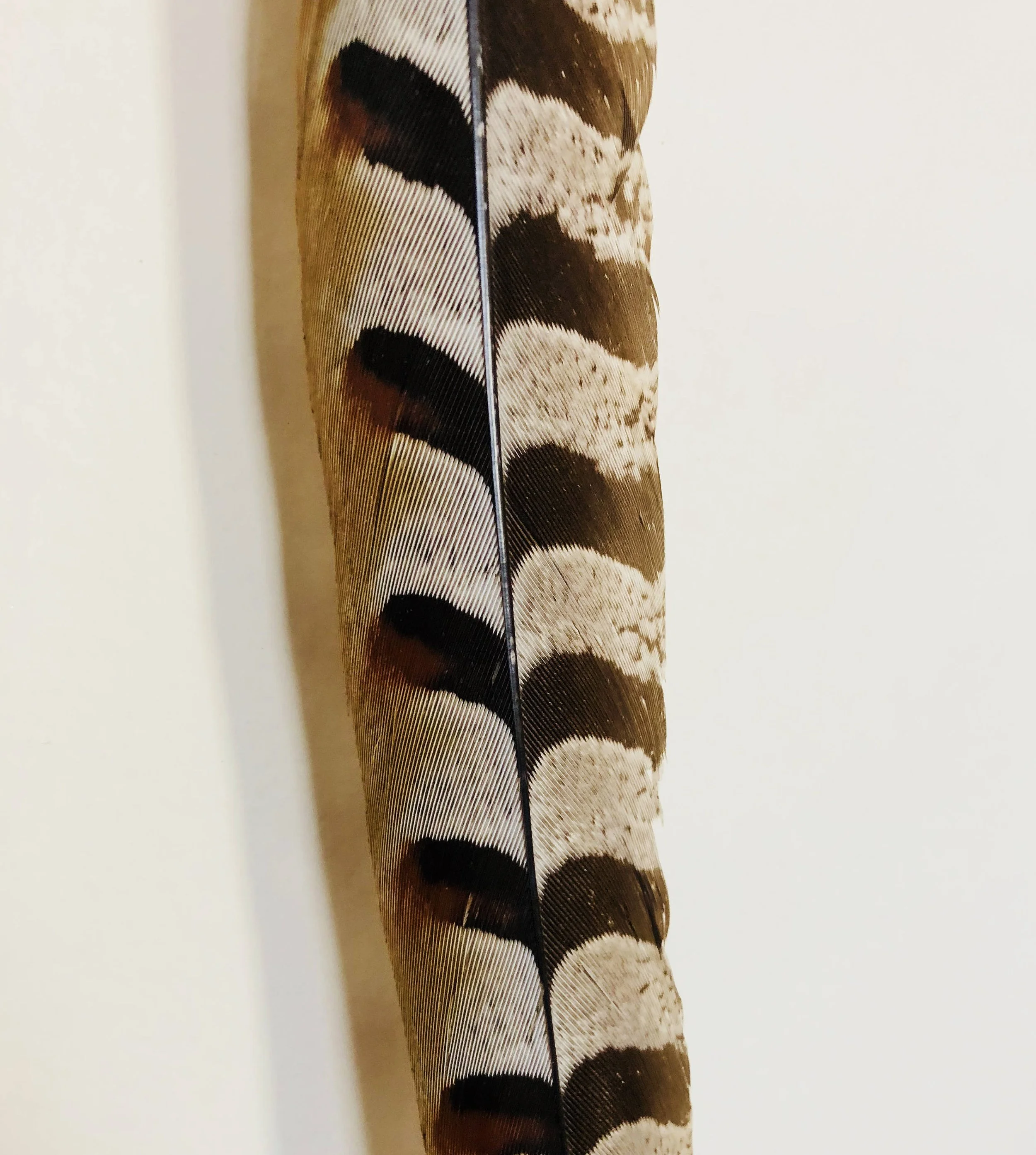There are 3 long, natural and vibrantly striped Reeves Venery Pheasant feathers hanging from the bottom of the vine. Their color and contrast is just gorgeous.