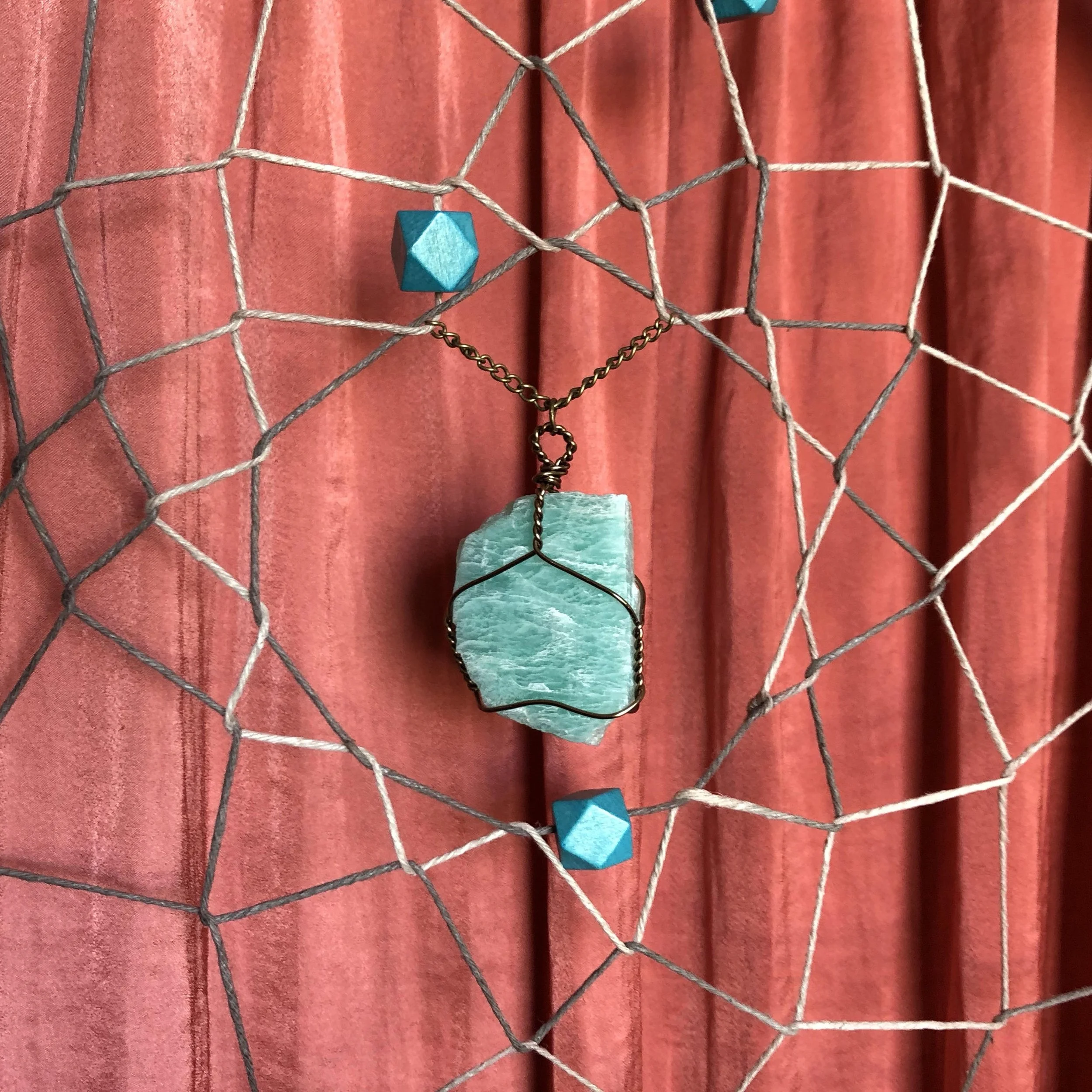 In the center of the web is a raw piece of vibrant blue Ammonite, which I simply wire wrapped in bronze colored wire. There are geometric blue wooden beads woven into the web itself.