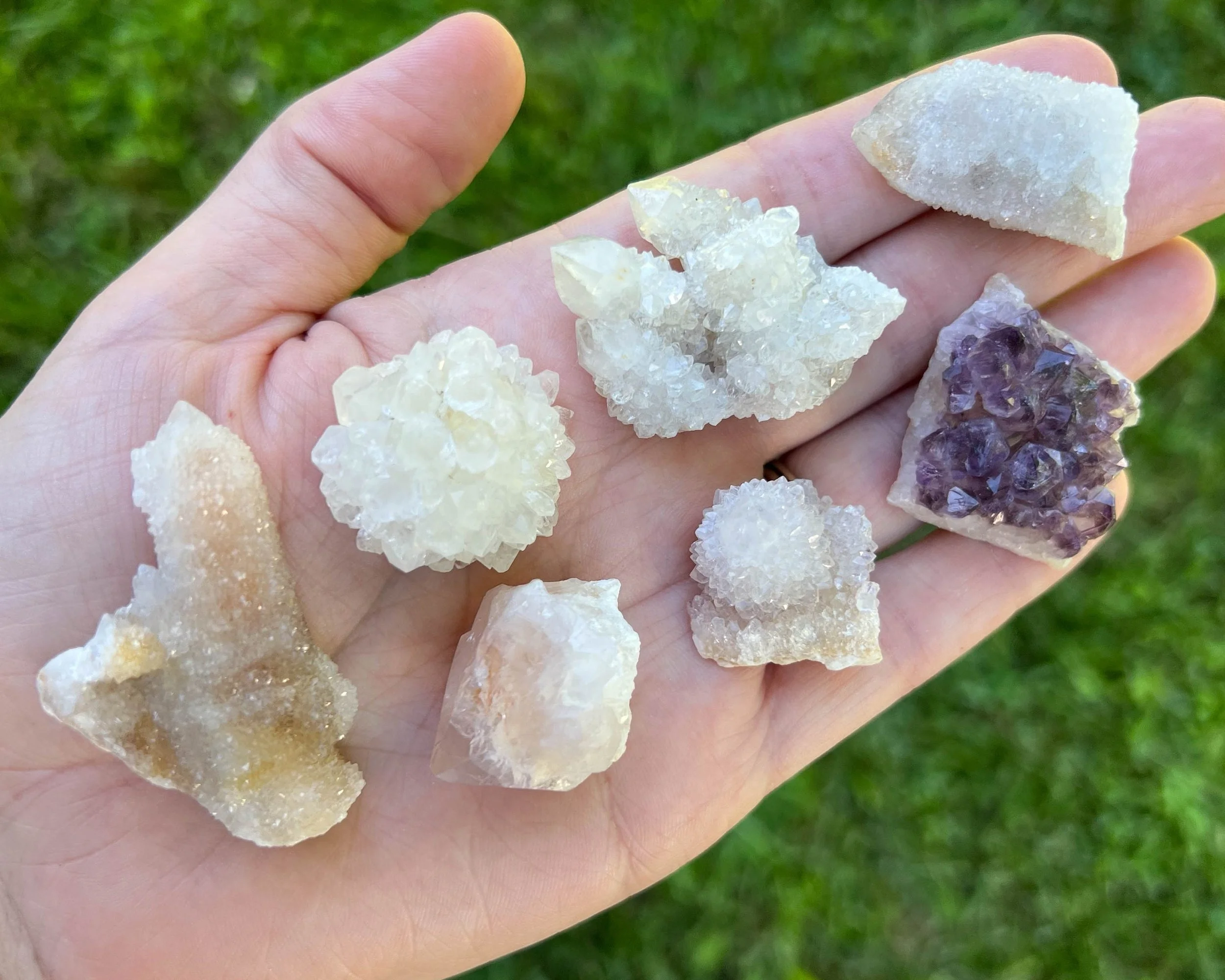 This is a crystal lot or set of seven small Spirit Quartz from South Africa. They are white and purple and have some orange iron coloring. There are points and clusters. And they are sparkly and awesome! <3 They make great pieces for jewelry making, home decor, altars, crystal grids, party favors, or a gift for anyone who loves crystals - including yourself :)