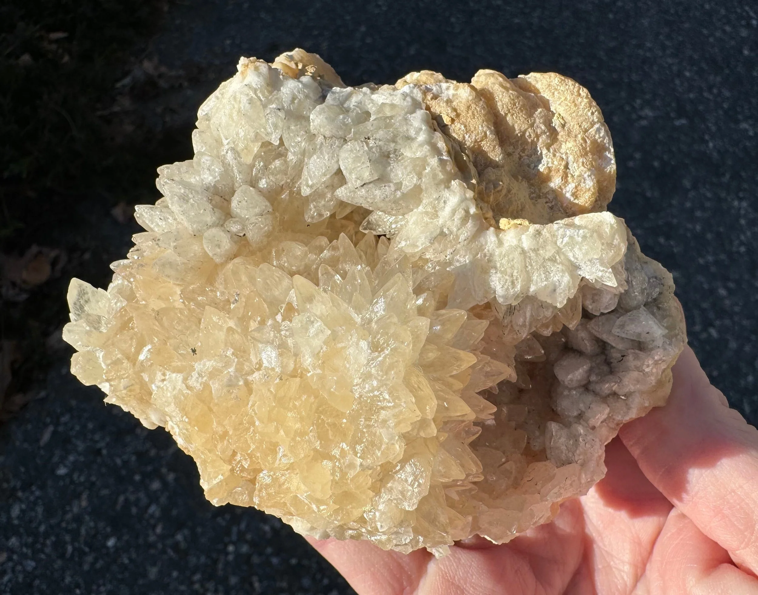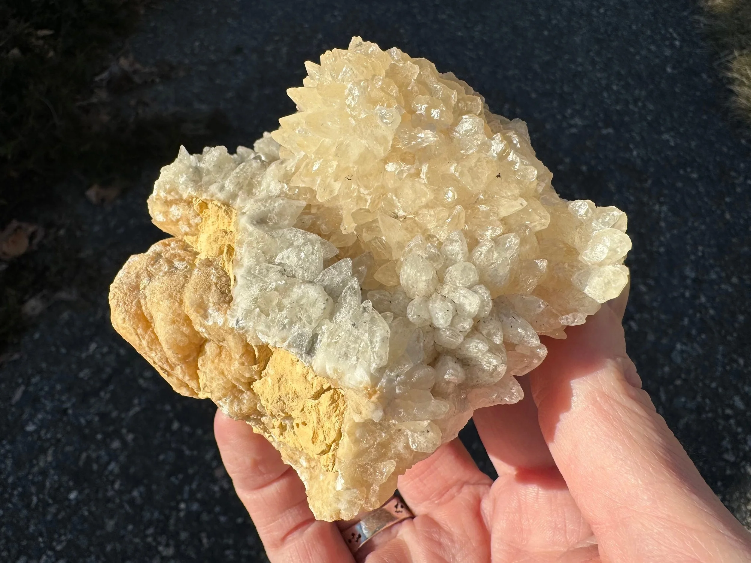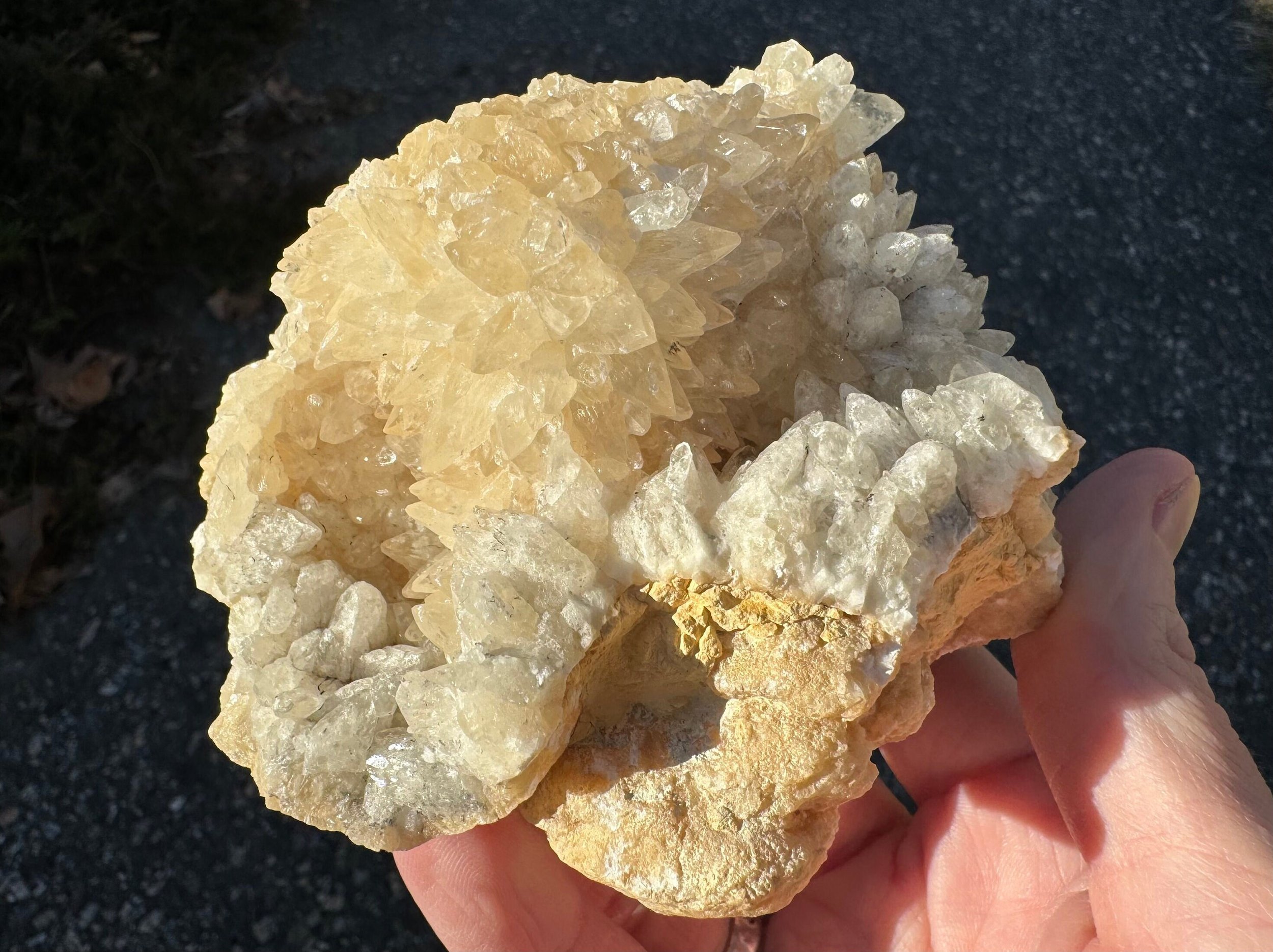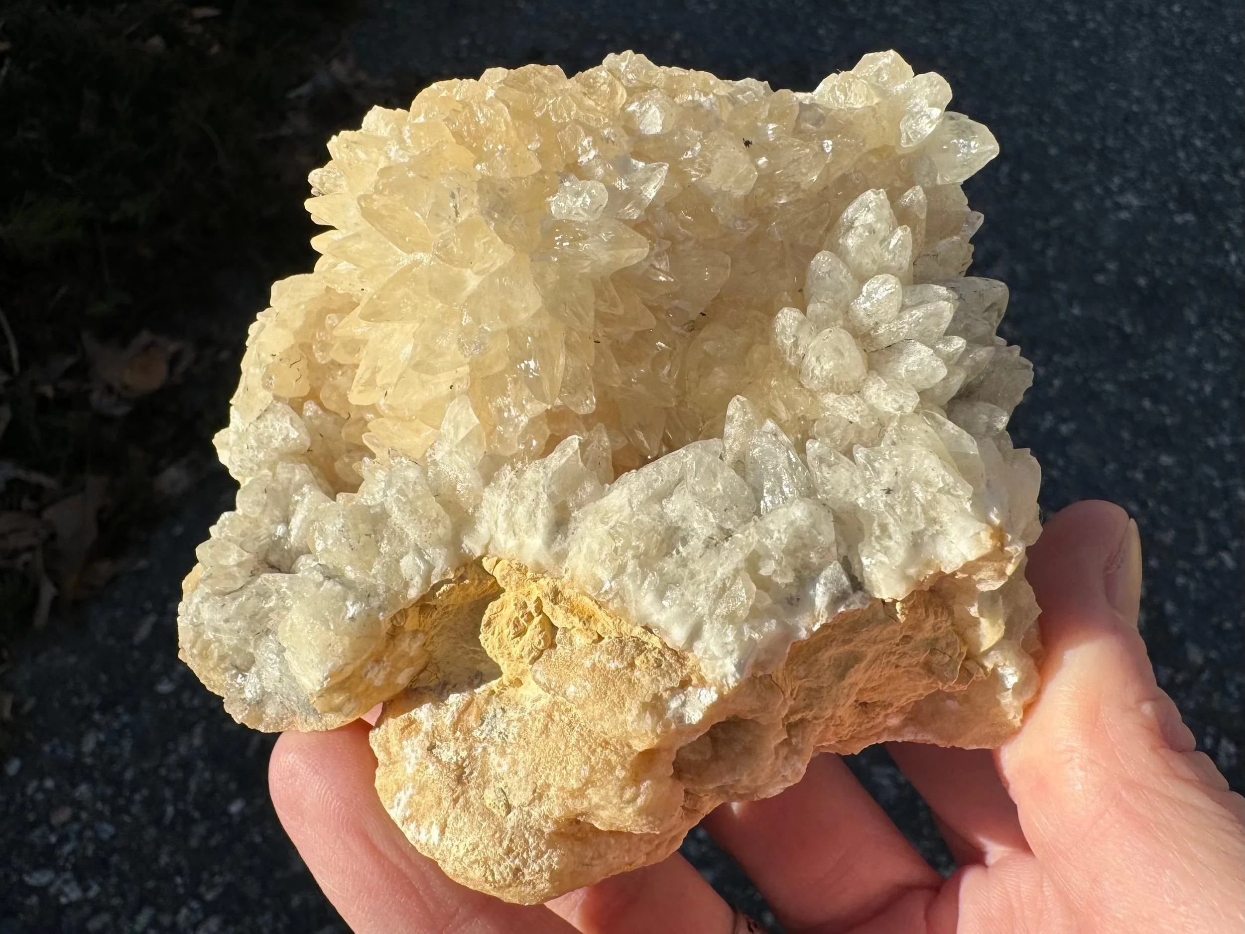 This is a beautiful cluster of lustrous dogtooth Calcite crystals. The crystals are sharp, lustrous and clear and yellow. Some have tiny black dendrites. A cool and pretty piece of a geode from Morocco that makes a lovely piece of decor.