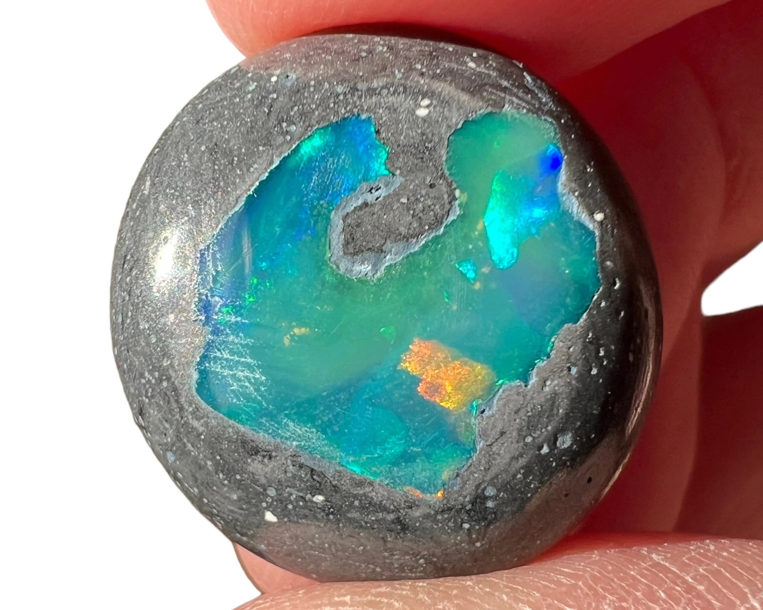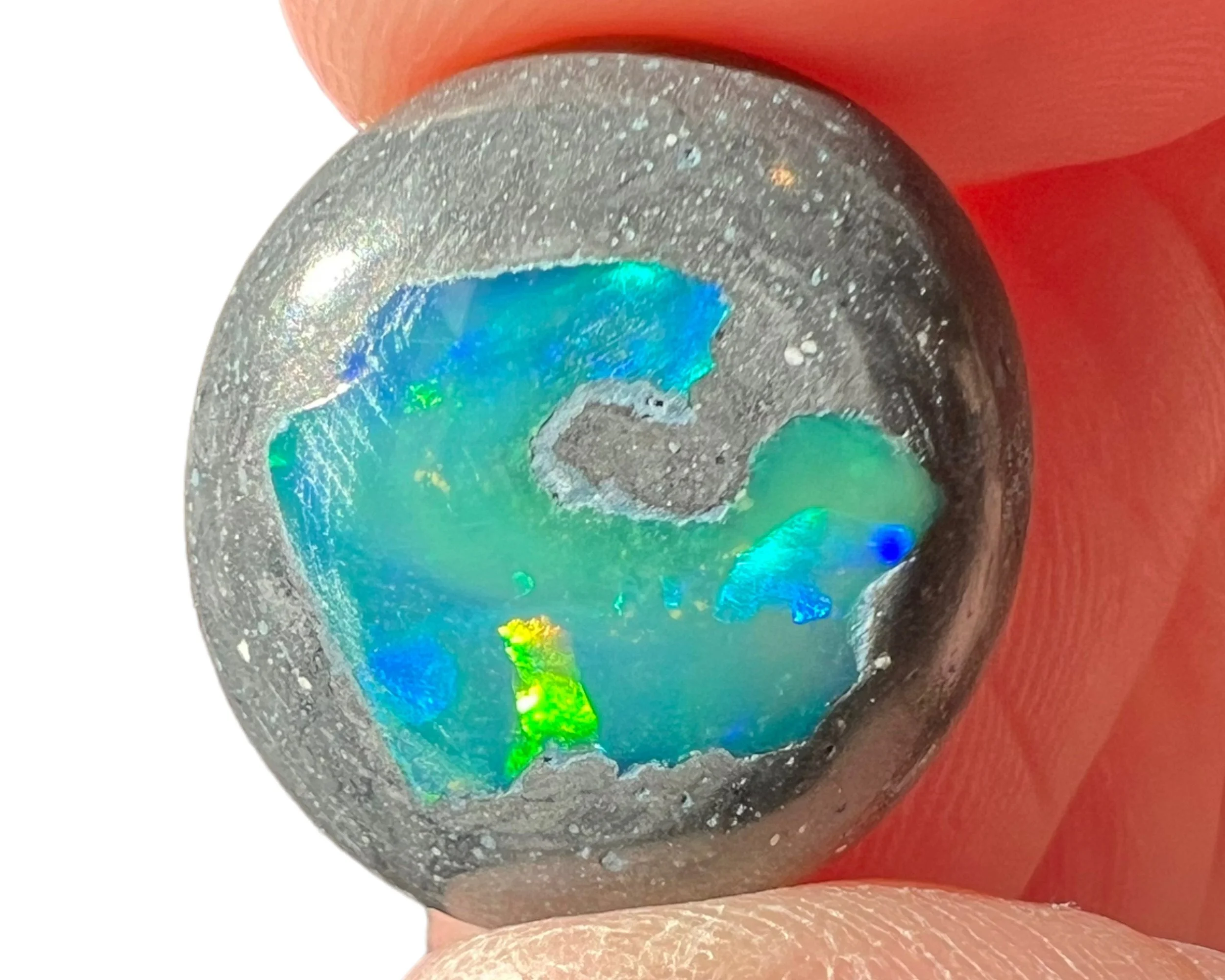 This is a natural, flashy opal in a faux / manmade black matrix from Mexico. The opal is real, but it is set into false matrix stone to look like a matrix opal. The matrix is dark gray , the opal is mostly blue but has red, orange and green flash too. It is raound, flat on the back and dome shaped top for setting in jewelry. Large ring or small pendant / necklace size.