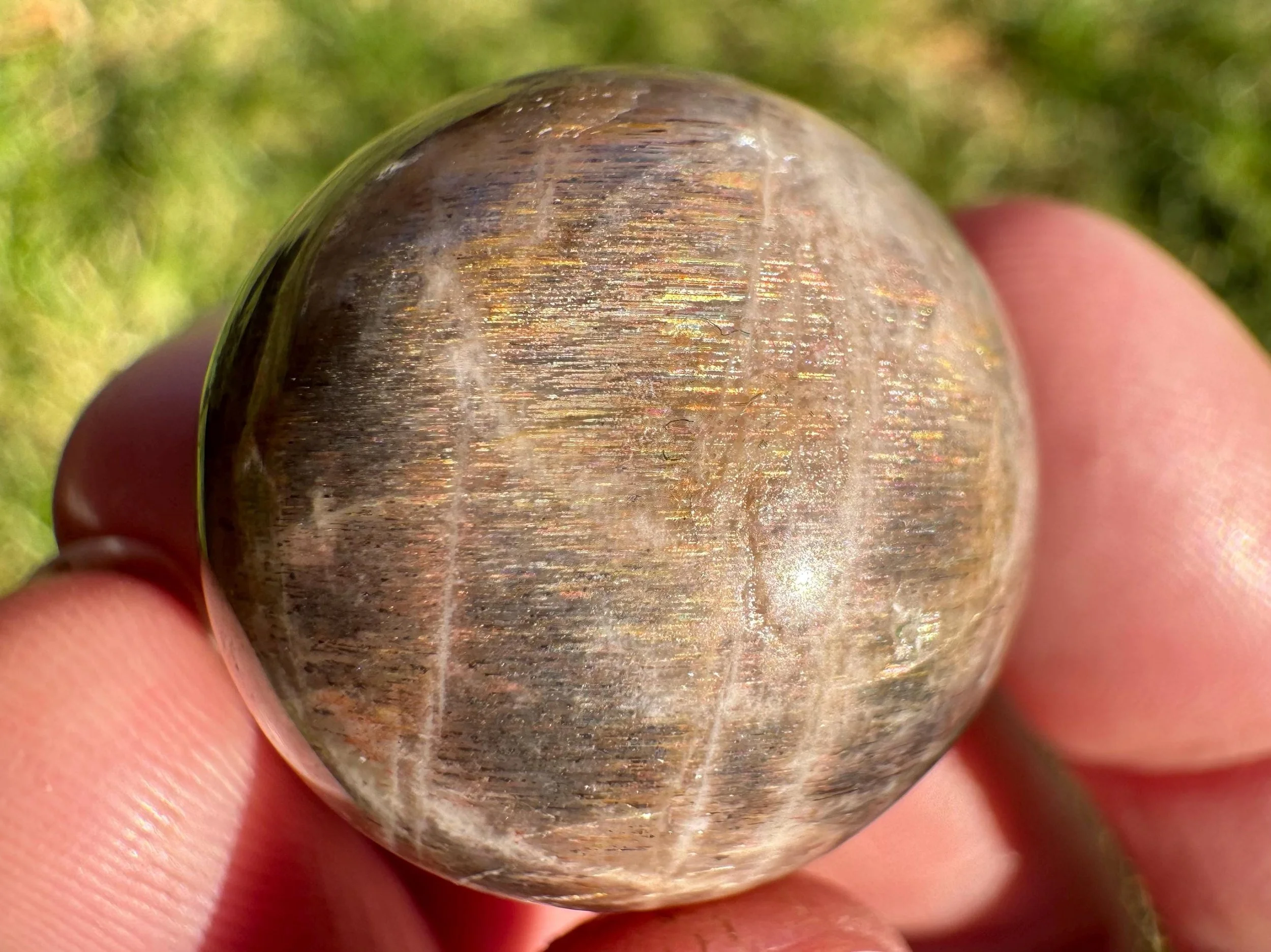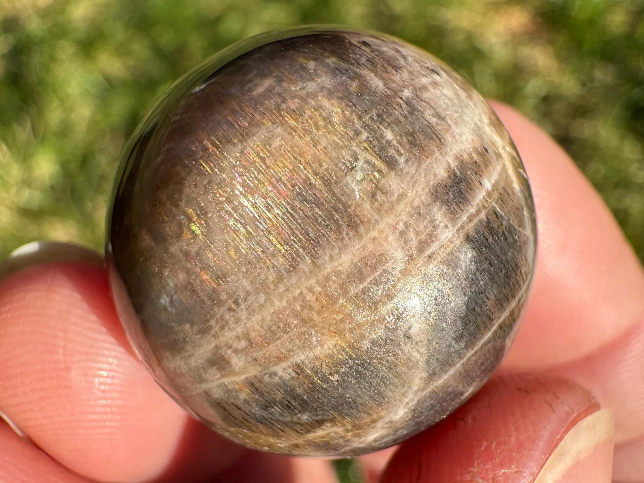This is a lovely mini Black Moonstone with Rainbow Sunstone sphere that shimmers with thin stripes of flashy rainbow Hematite, golden schiller and a silvery blue adularescence or flash. Every angle has more magical beauty inside!