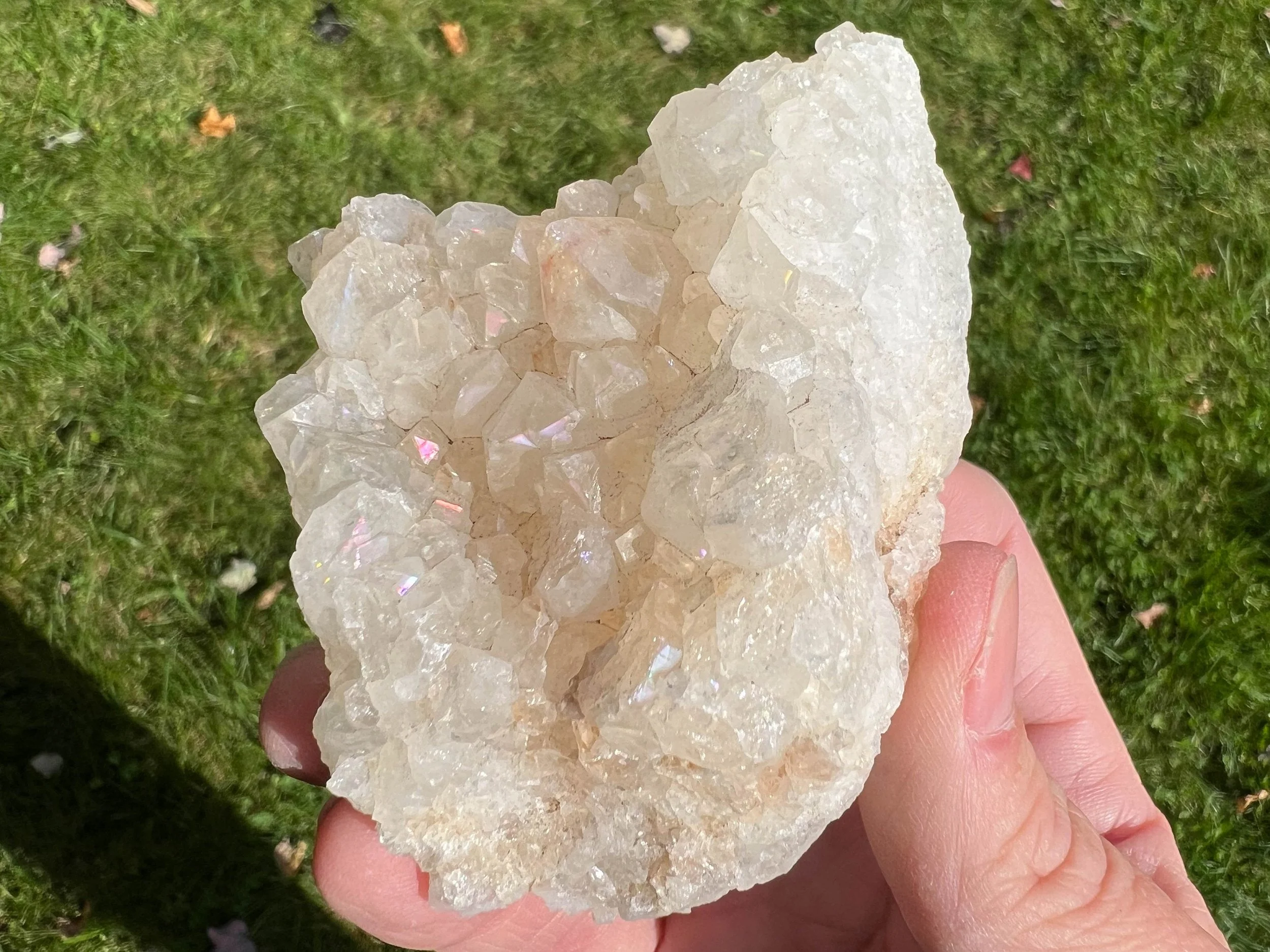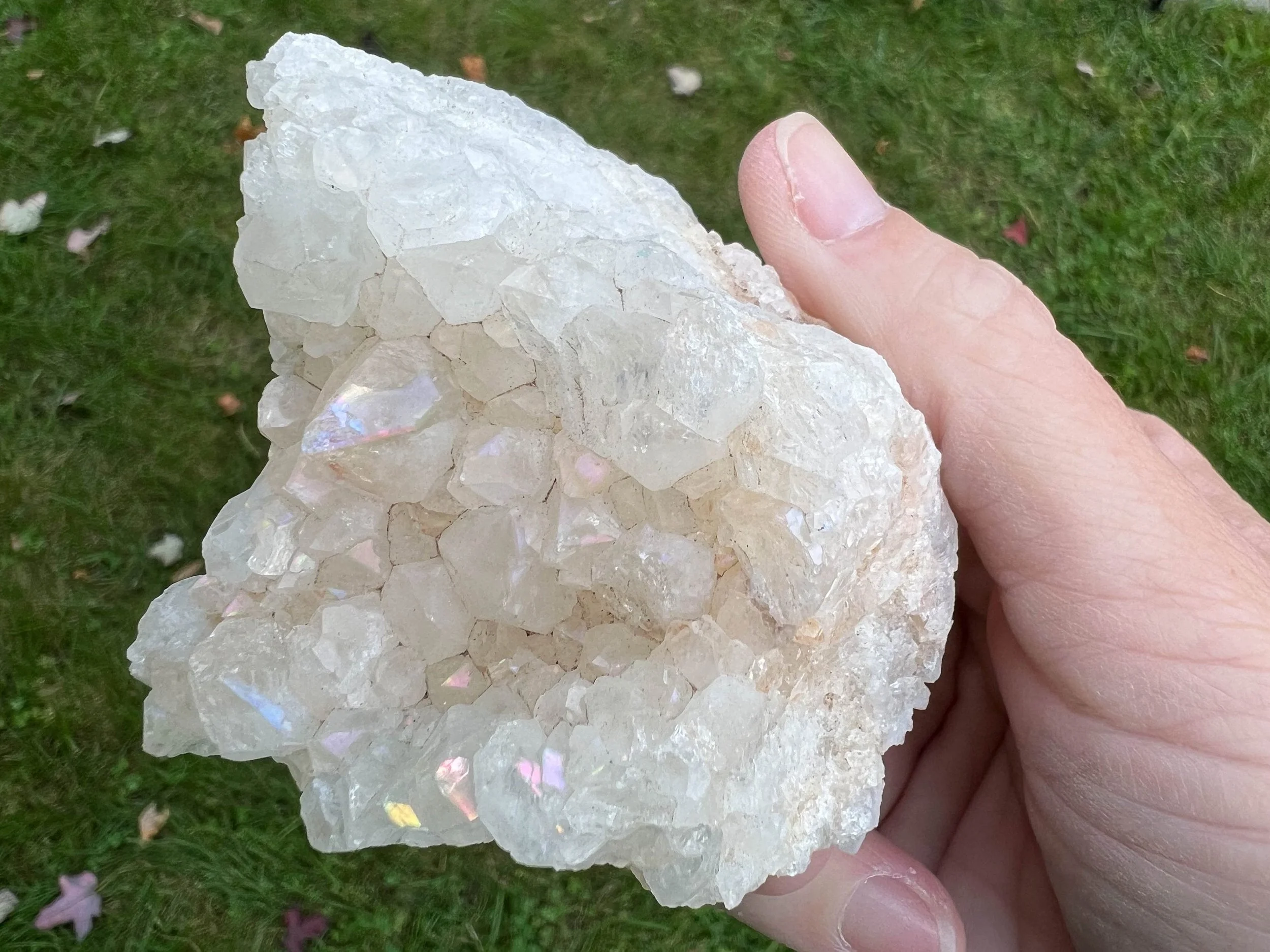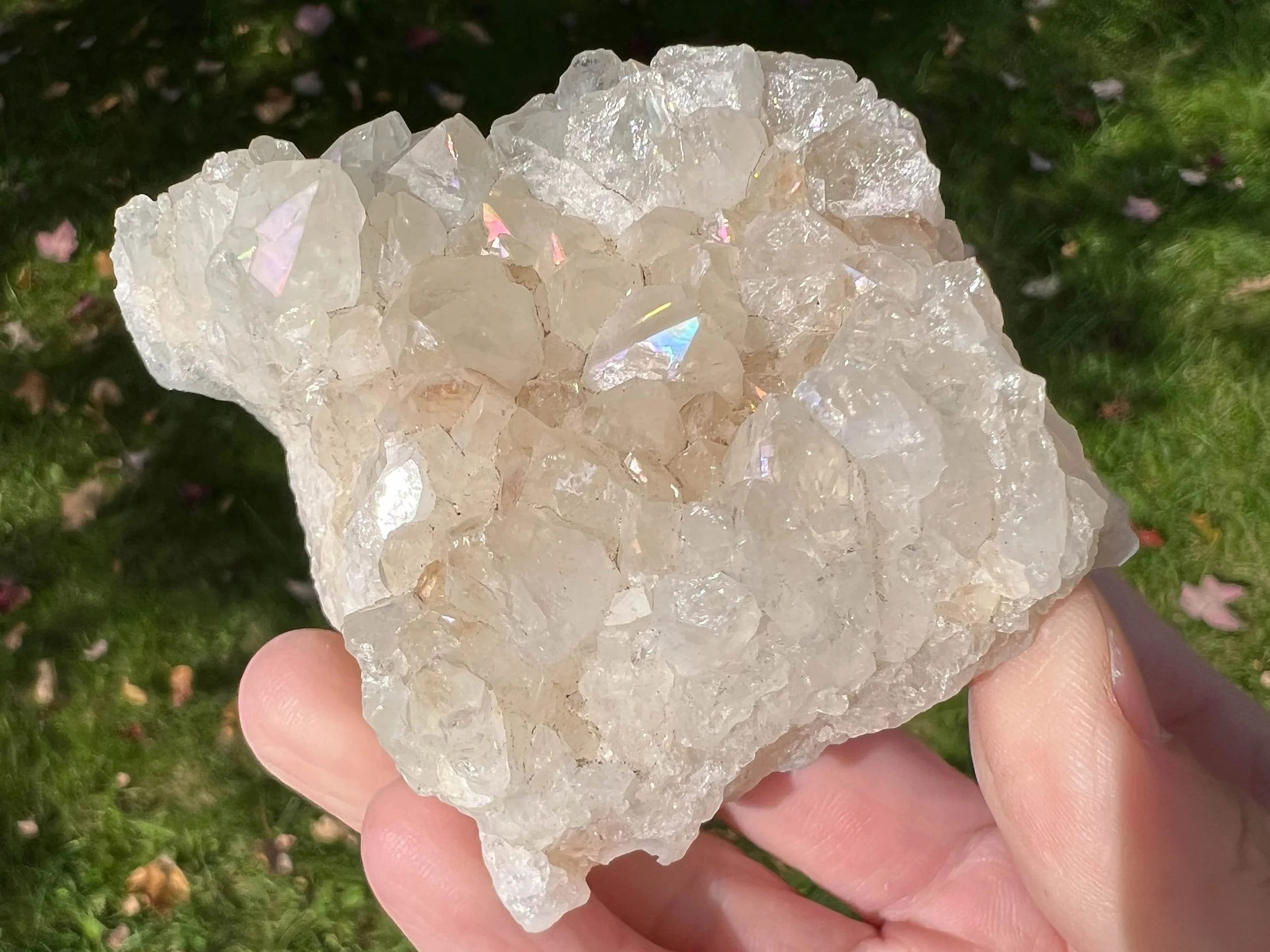 Anandalite is also known as Rainbow Quartz, Aurora Quartz, and Iris Quartz. It is completely natural crystal Quartz, usually forming in clusters of short, thick crystal points and often in stalactite or rosette formations, it has a natural iridescence to it, of natural rainbow flash that shows up on the faces of the Quartz crystals, thought to be caused by Rhodium. This type of Quartz occurs in India. It is similar to Angel Aura Quartz, though it is 100% natural, untreated and often a little more subtle in color. Its way better in person for sure!