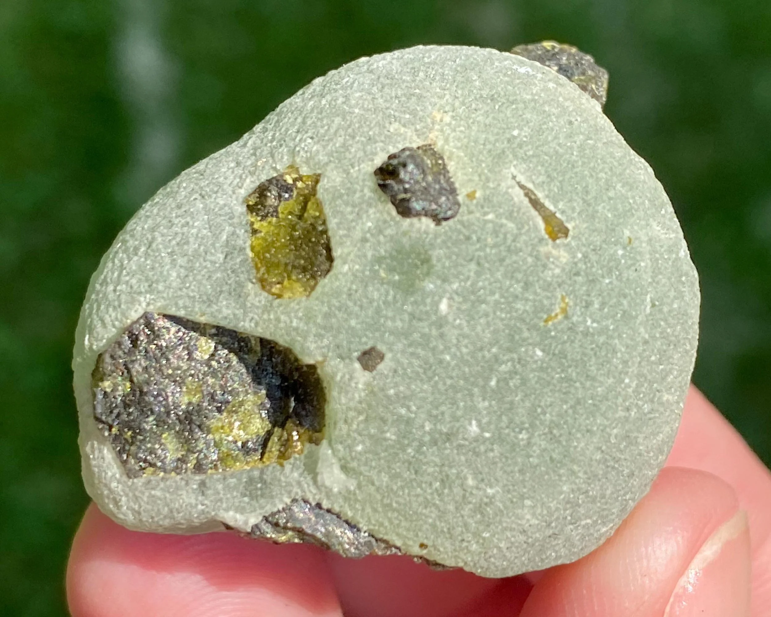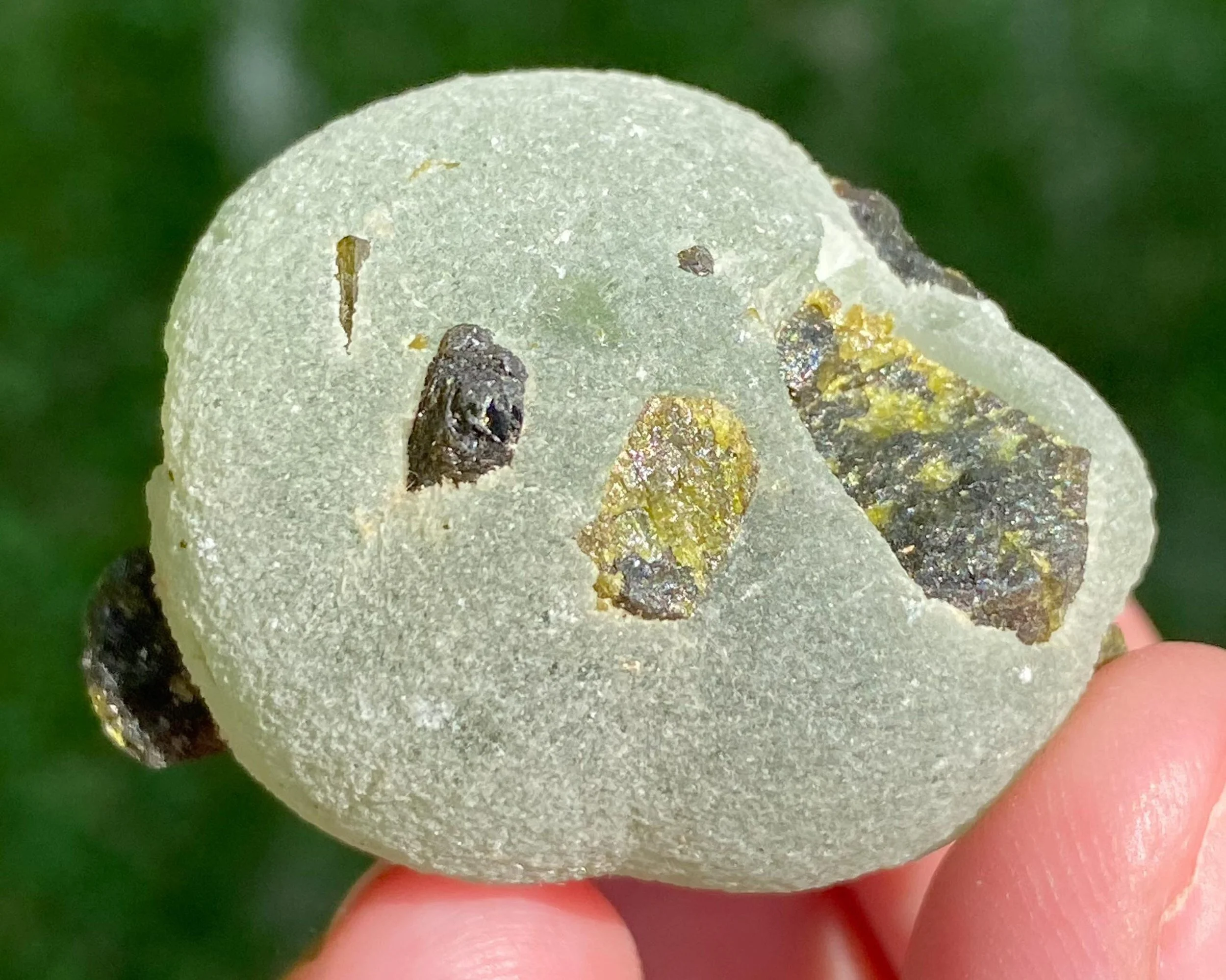 This is a specimen of bright green Prehnite with lustrous dark green Epidote crystals in it. It is a natural stone from Mali in West Africa. These are really beautiful little collector's pieces.