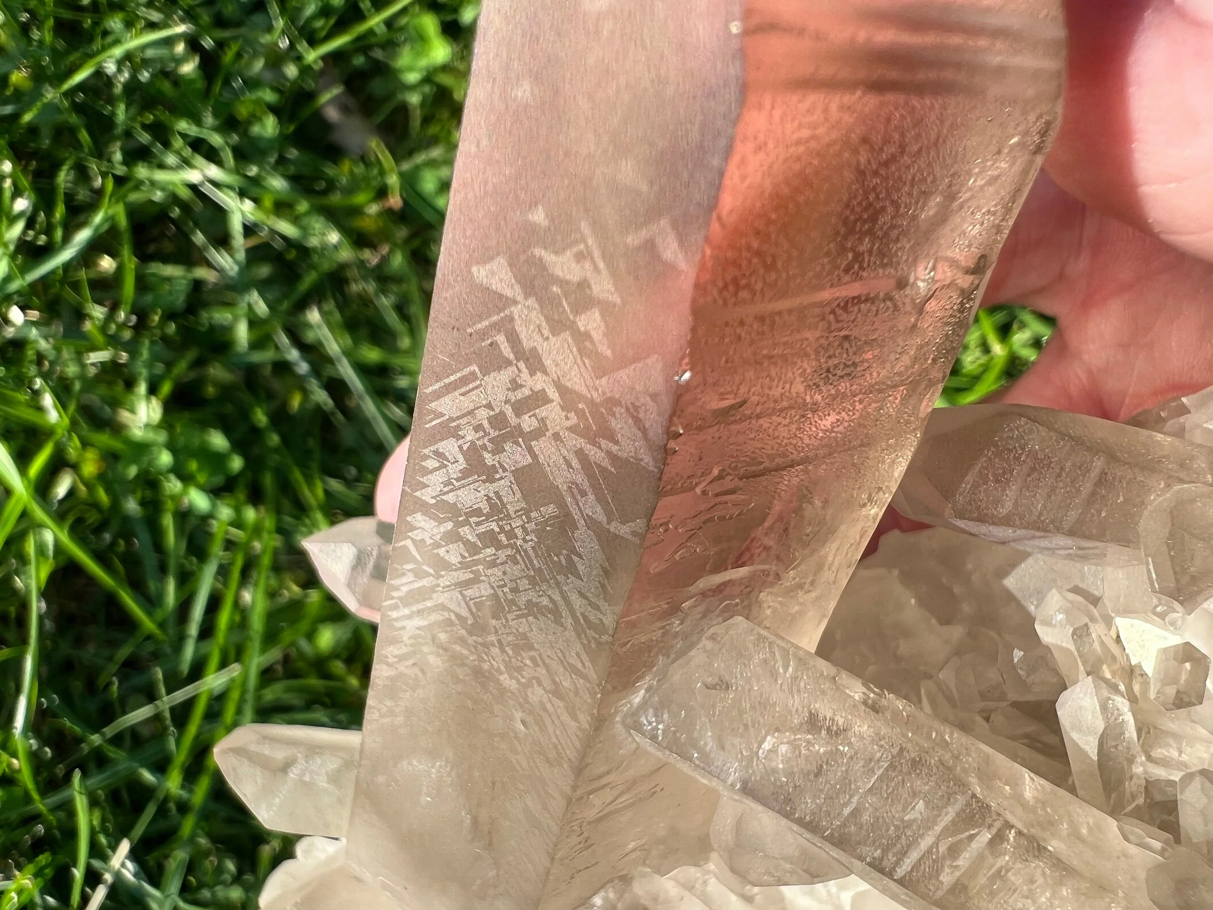 A lovely and aesthetic natural Smoky Quartz cluster with several transparent to translucent crystals in great condition. It has really cool triangular patterns along the side of the biggest crystal and record keepers on the termination too. These appear to be Lemurian as well by the clarity of the stones and the formation and nice striations along some of the sides. An eye pleasing piece with beautiful light gray crystals that would be a nice addition to your collection or home decor, or be an awesome and unique gift :)