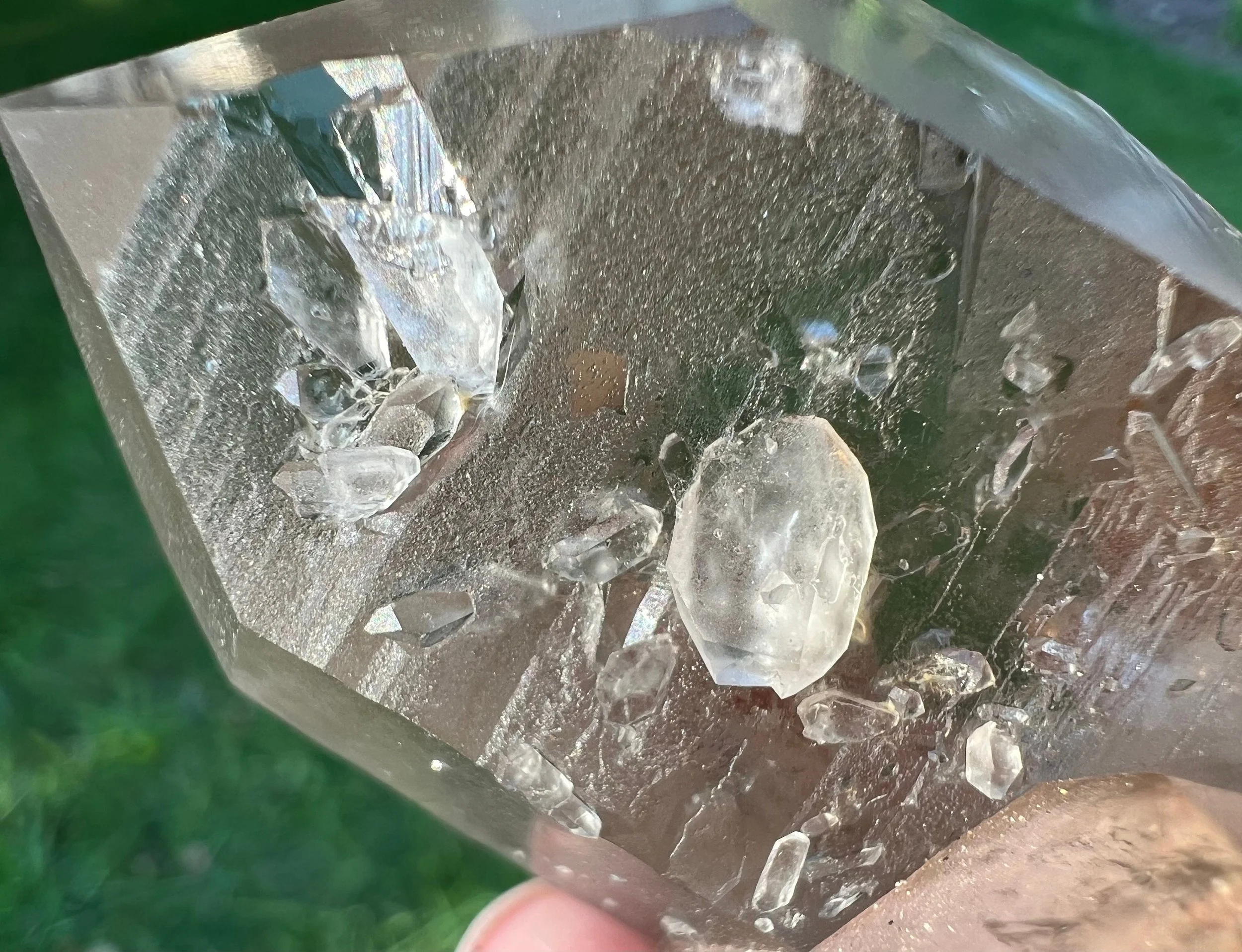 This is a gorgeous natural Smoky Quartz crystal cluster. It is from Brazil and look like a Lemurian seed with great ladder line striations and optical clarity. It has a bunch of little penetrator crystals, including double terminated ones. It has a light gray to light brown and glows a beautiful honey color in sunlight like the video. It is an aesthetic cluster, raw / rough real Smoky Quartz, and very pretty.