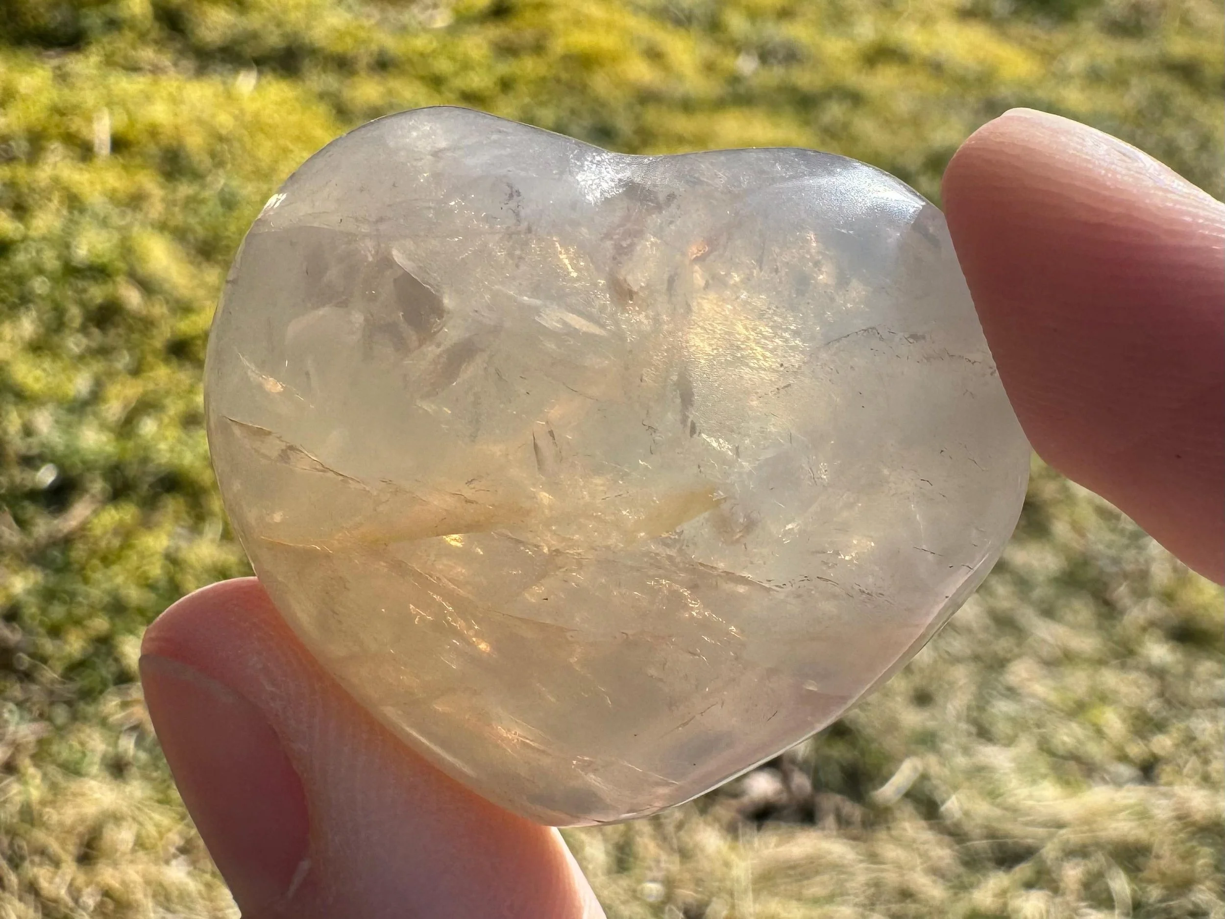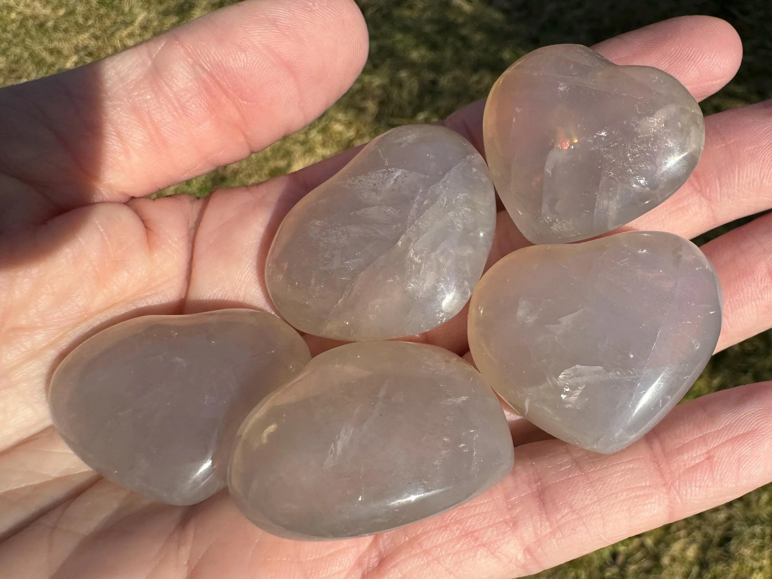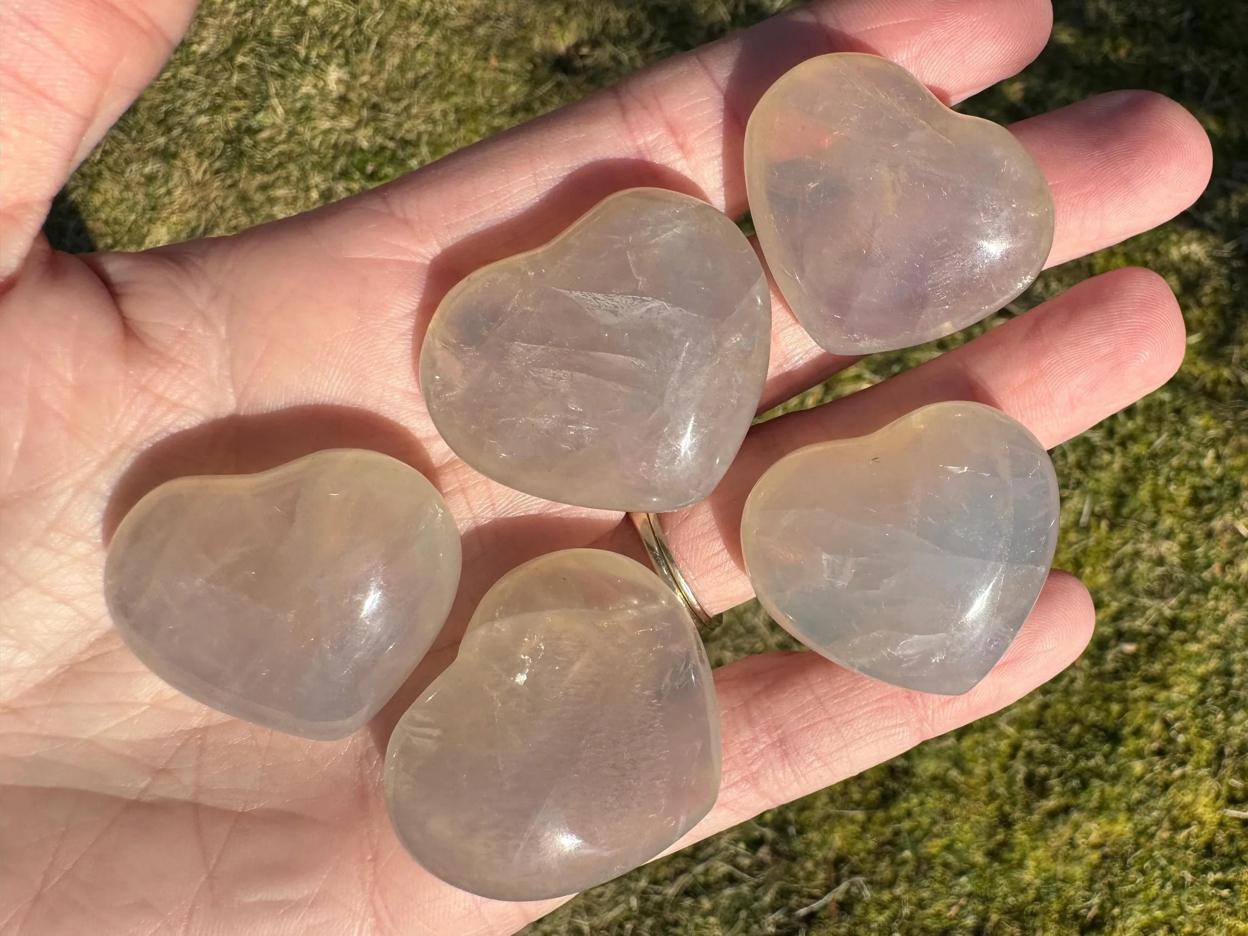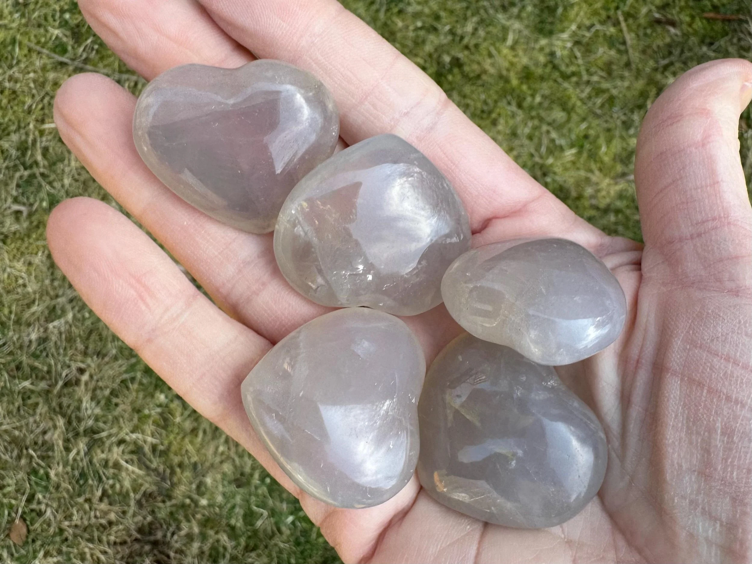 These are lovely small gemstone hearts made of natural Star Blue Rose Quartz, which is Rose Quartz that has a blue glow to it, especially in the light. It is also Star Rose Quartz, which has asterism, or lines that move through it in the light caused by an inclusion of nano fibers of a mineral that is similar to dumortierite. They have lots of light and shimmer and little rainbows in some. The lines are best seen in strong light.