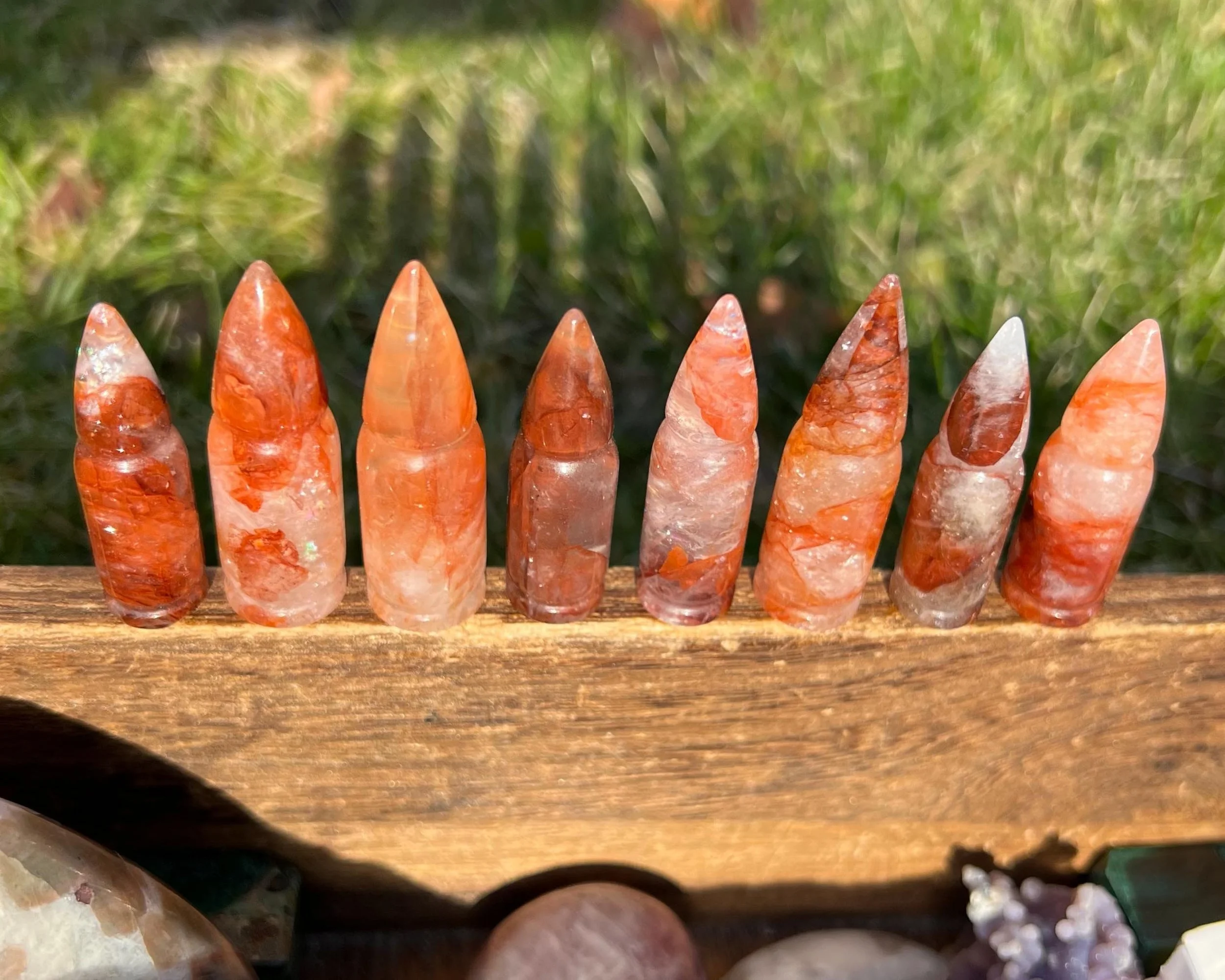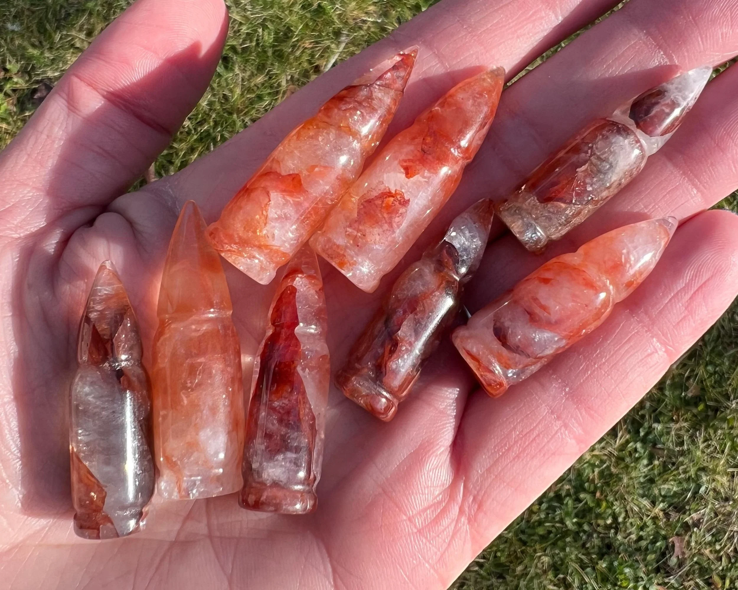 These are bullet carvings made of Hematoid Quartz, also called Fire Quartz. They have red Hematite inclusions in them. They are self standing. You will receive one at random, but you can choose more light/pink or more dark/red colored.