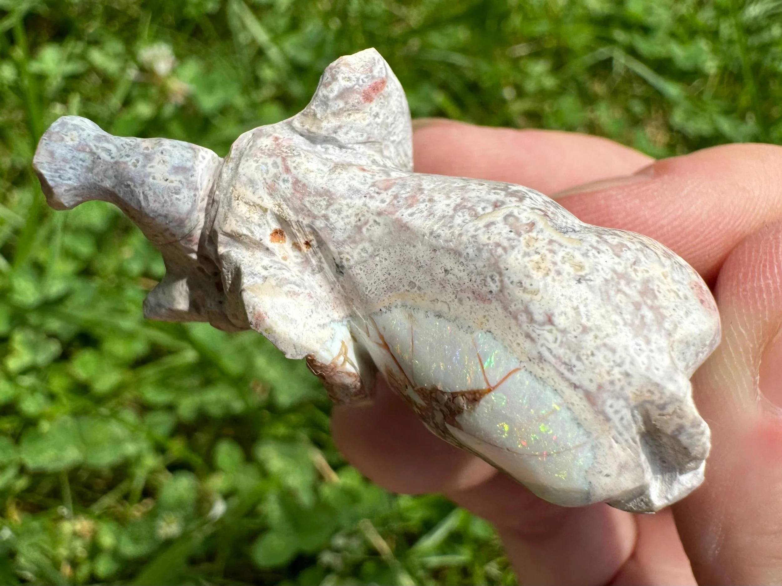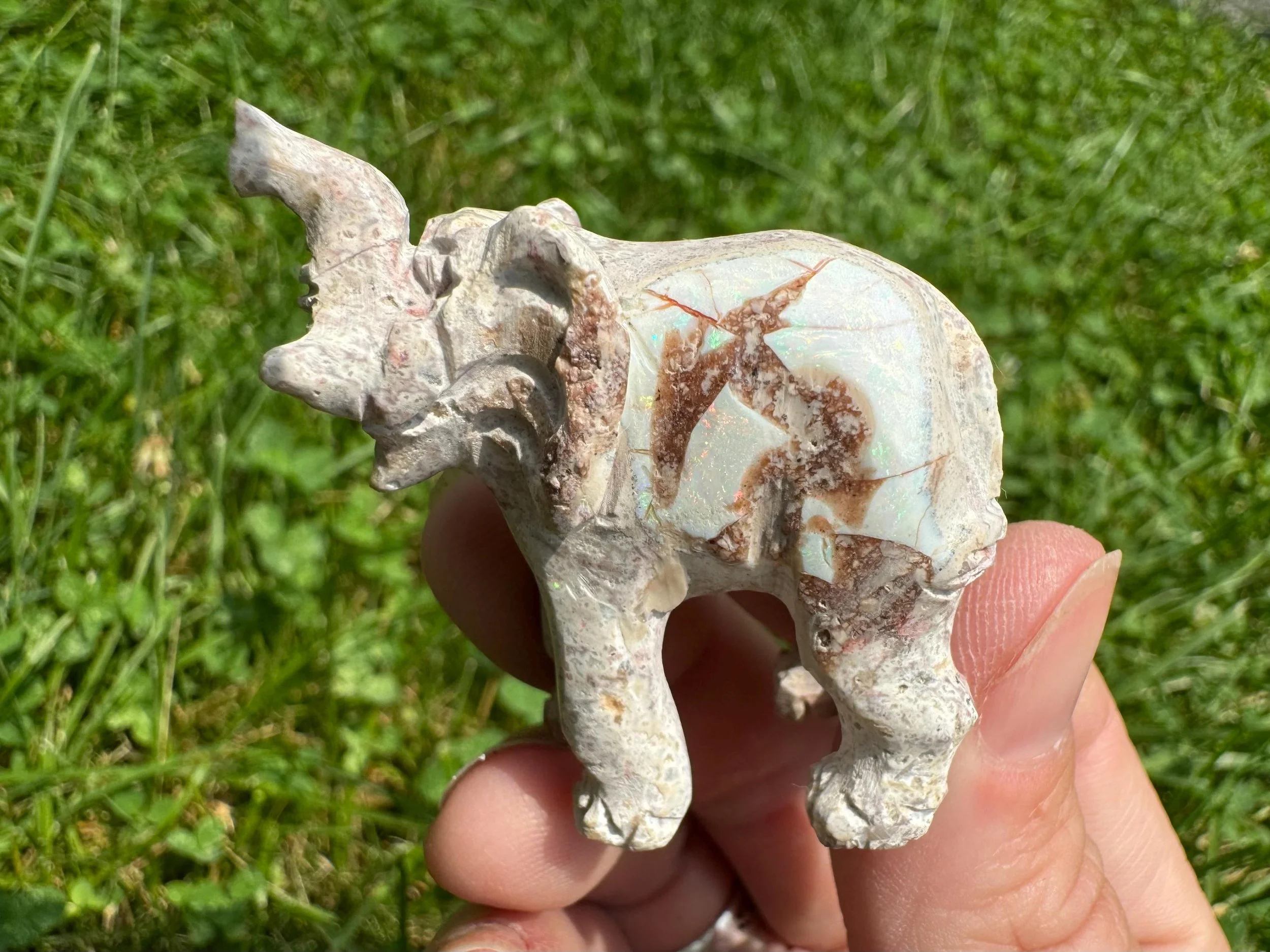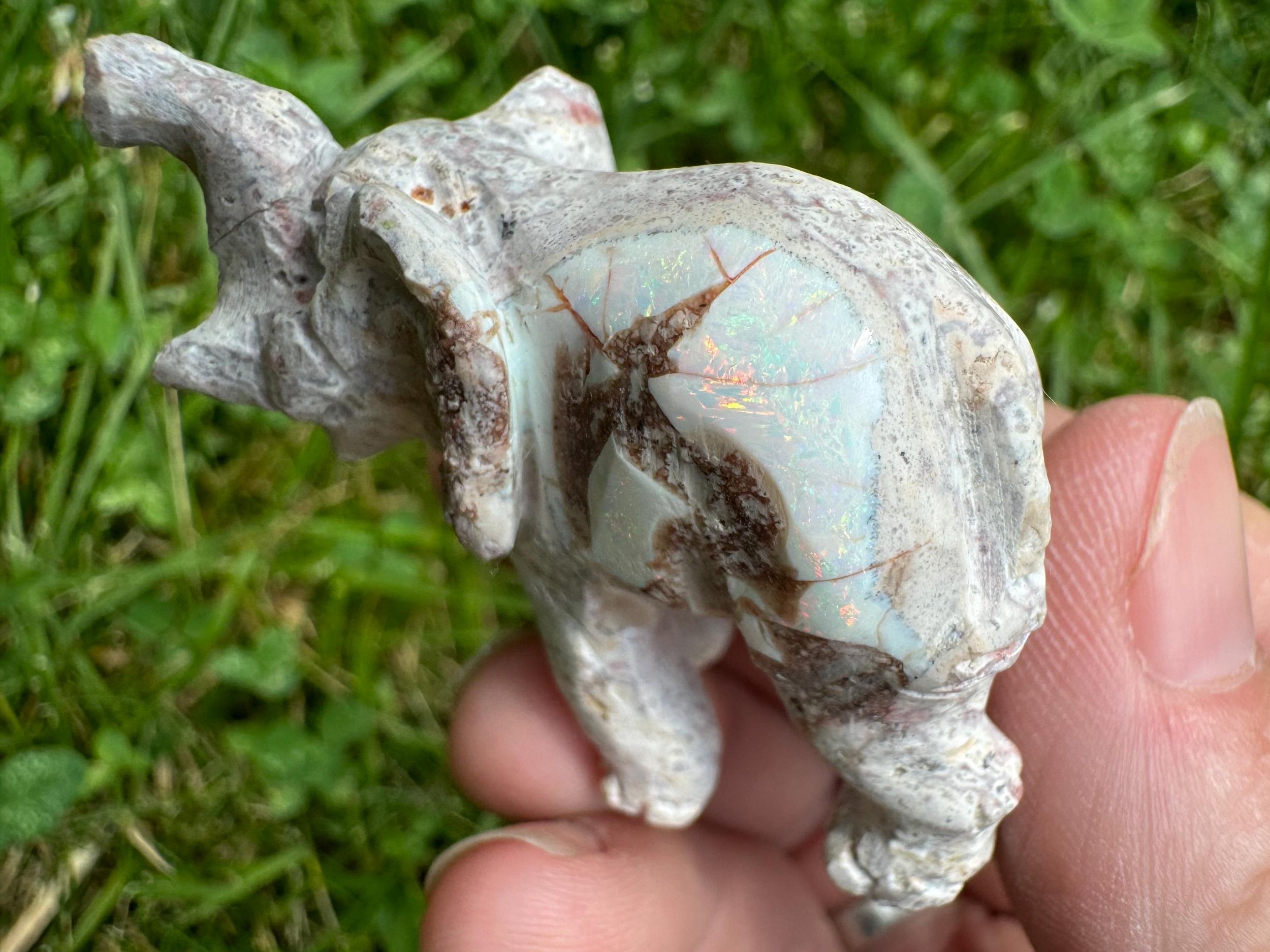 This is a hand carved elephant figurine carved in Mexican Opal in its' matrix. The white opal is full of rainbow flash - much better in person! Great gift for any elephant lover.