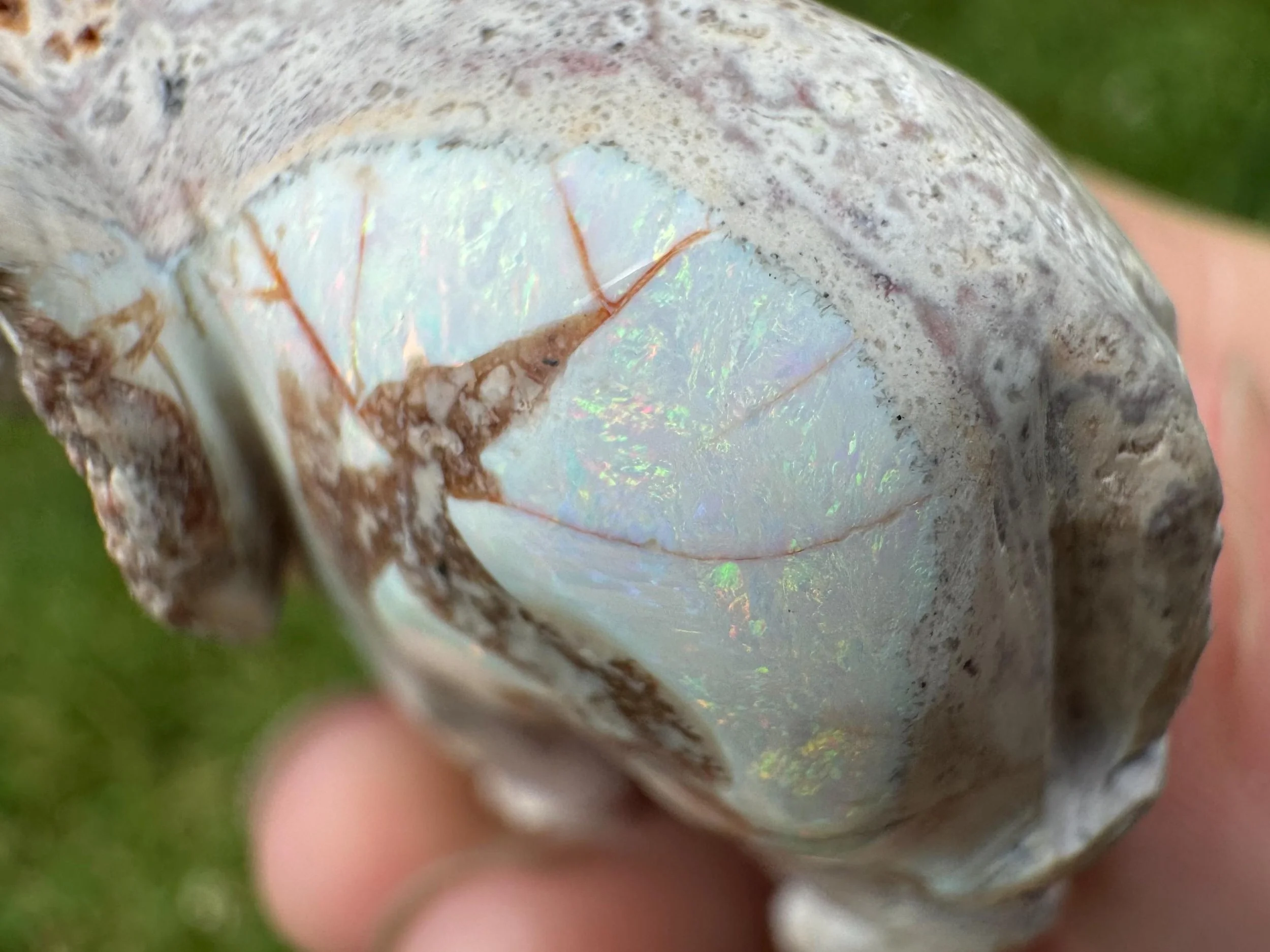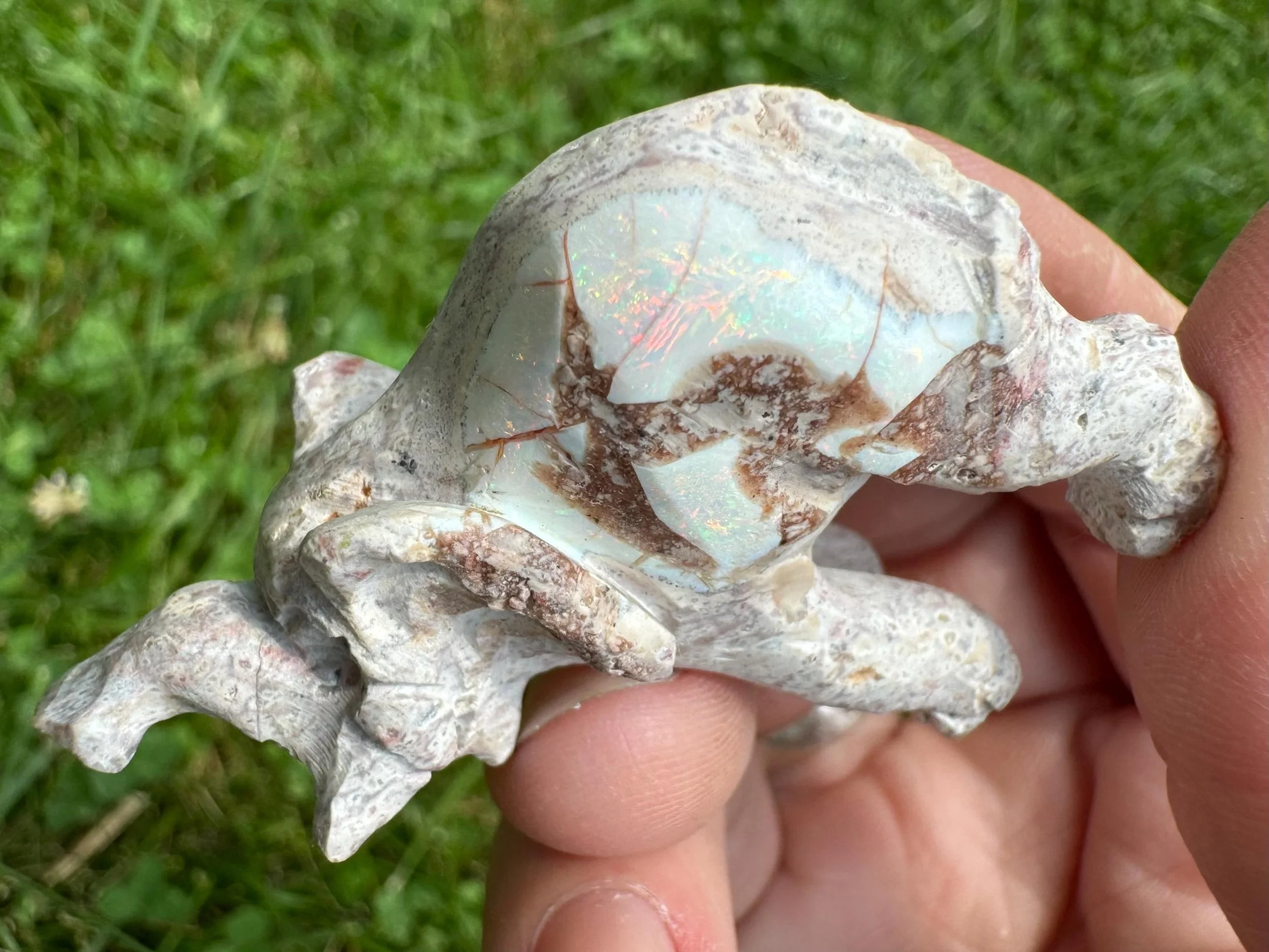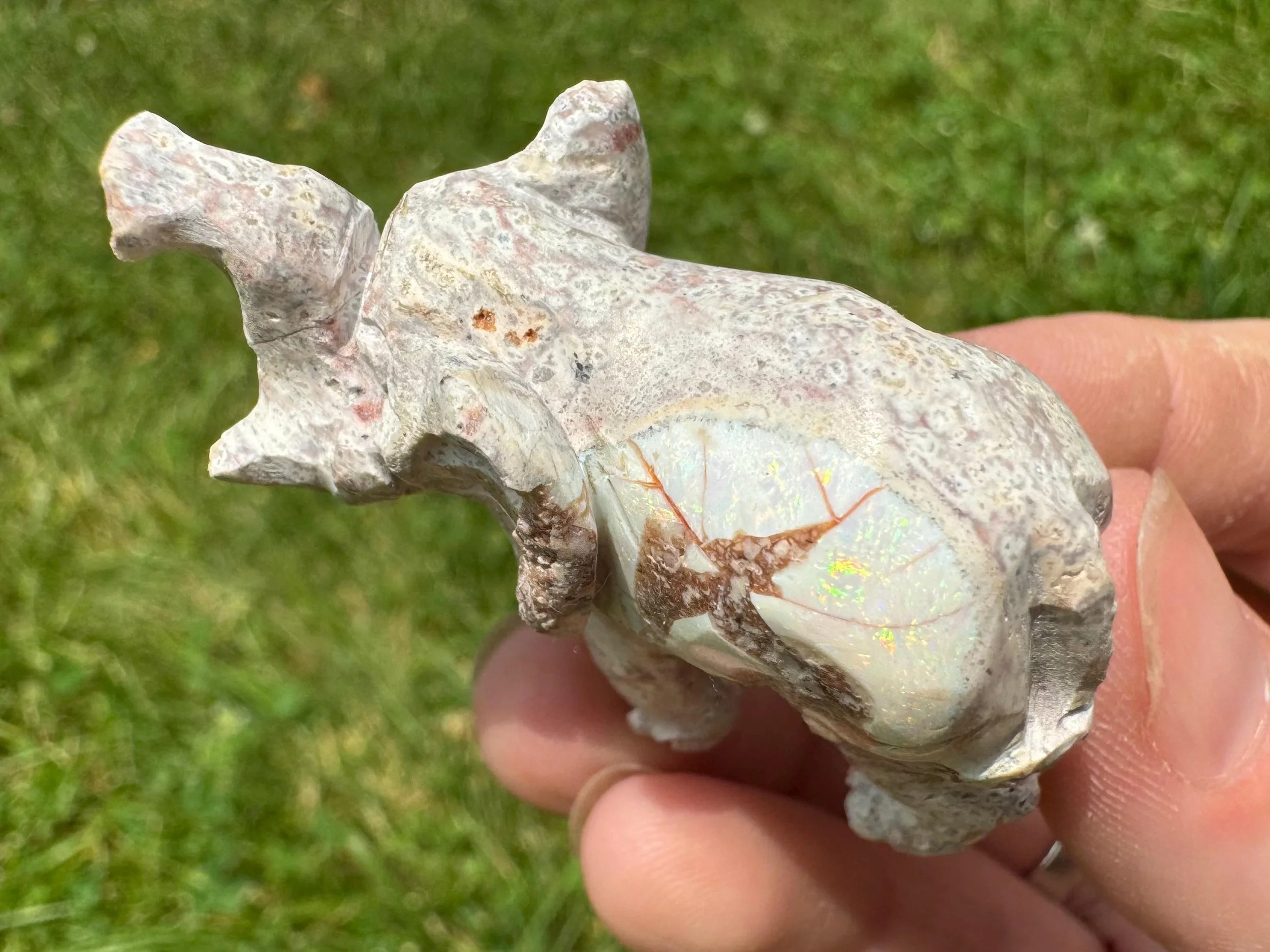 This is a hand carved elephant figurine carved in Mexican Opal in its' matrix. The white opal is full of rainbow flash - much better in person! Great gift for any elephant lover.