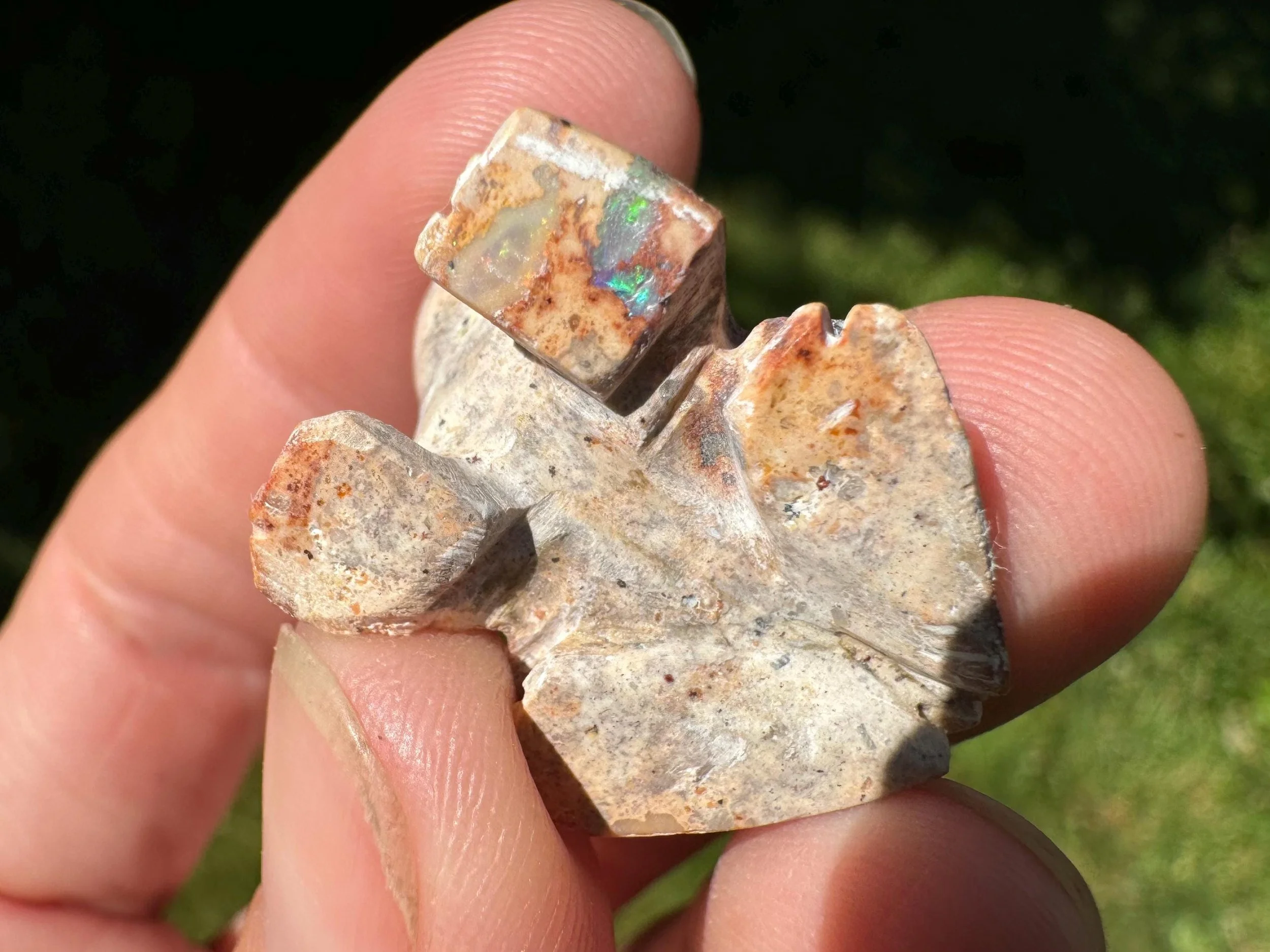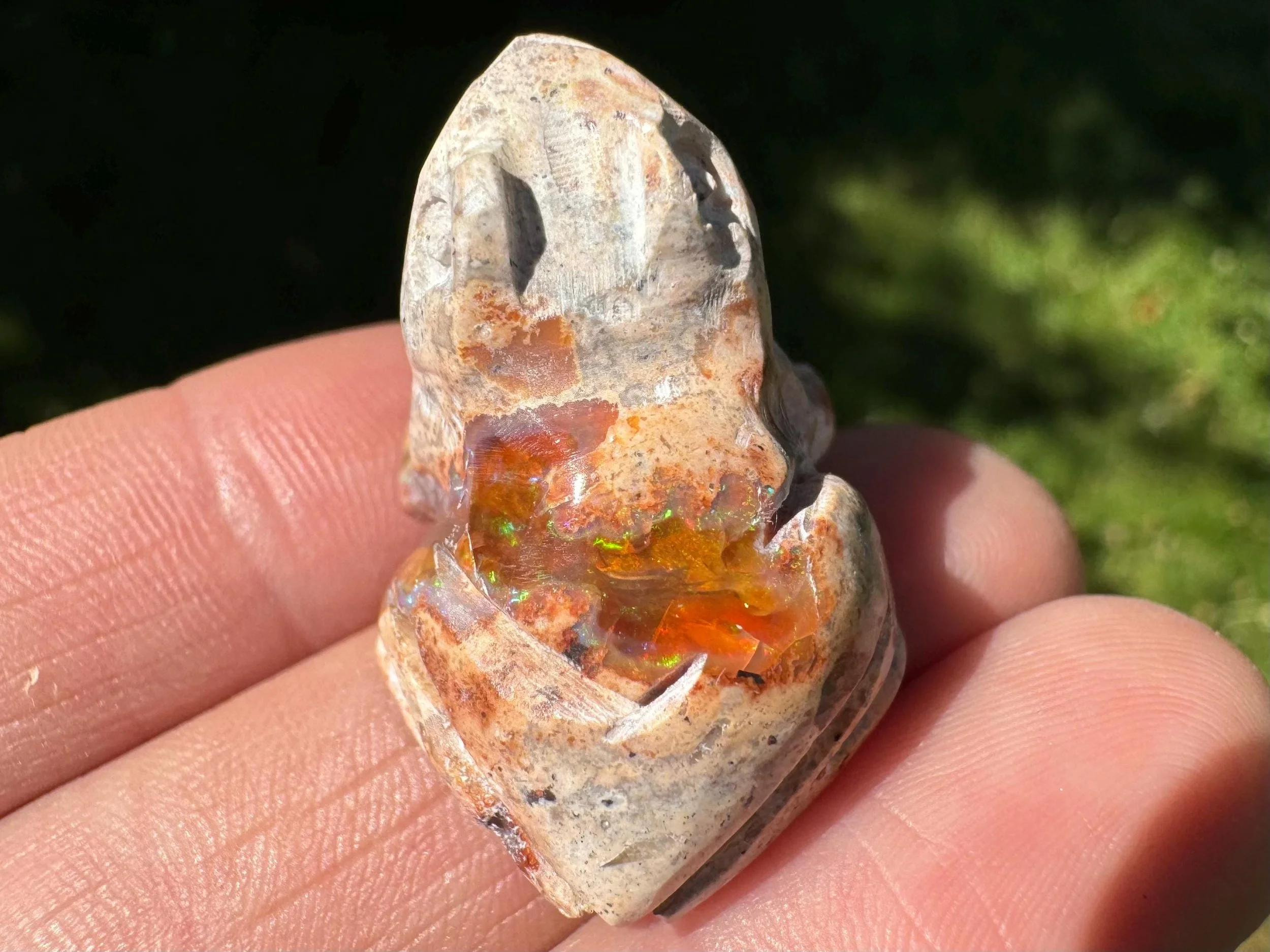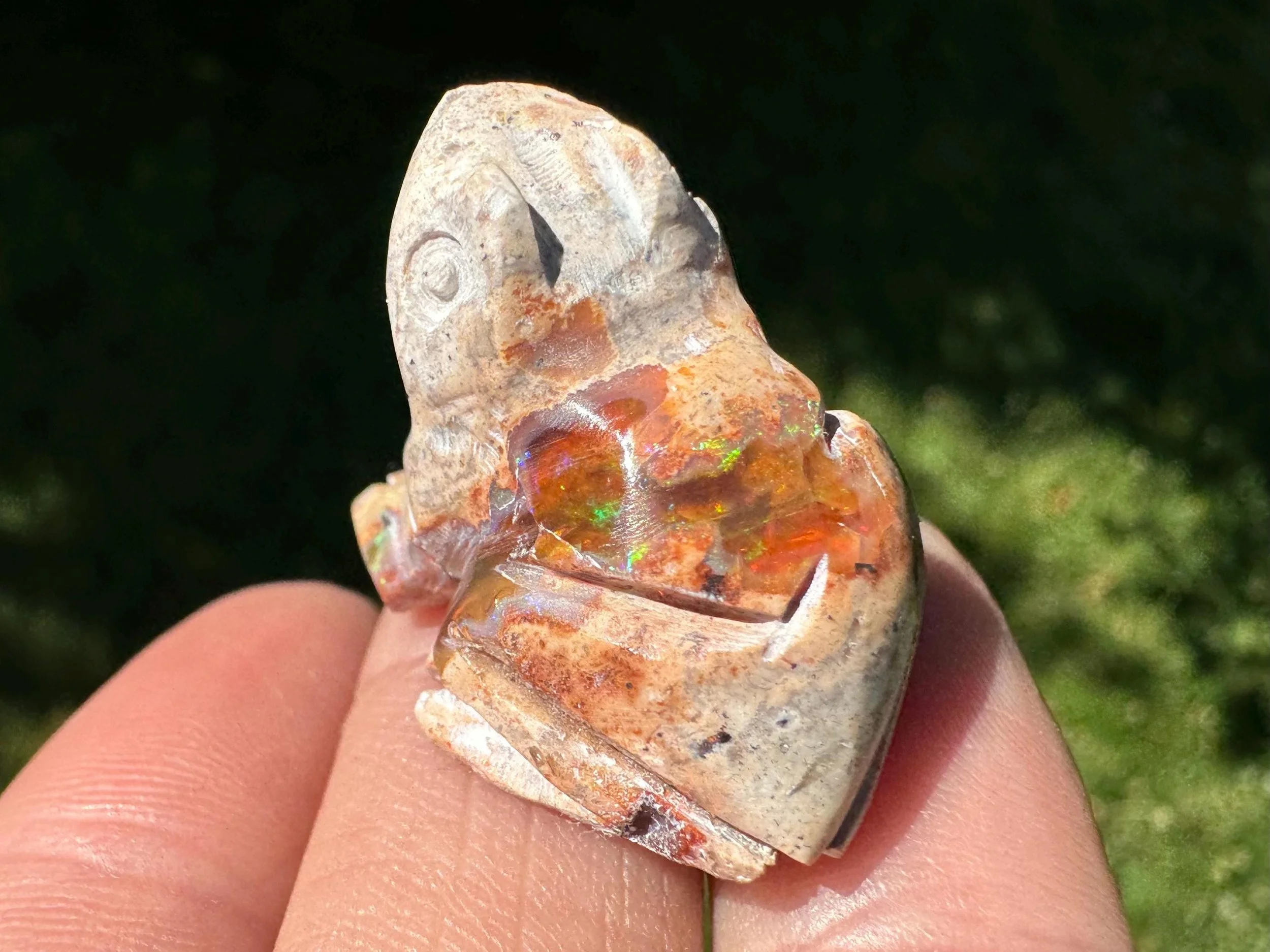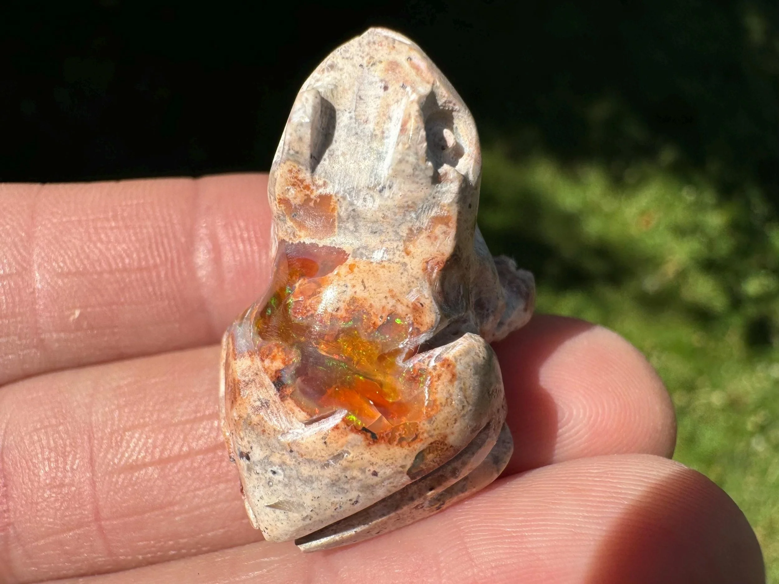This is a hand carved frog figurine made of flashy Mexican Opal in its' matrix. This one has both amber colored fire opal and white opal - both with great flash. The opal has full rainbow flash that doesn't look as great in photos but is wonderful in person!