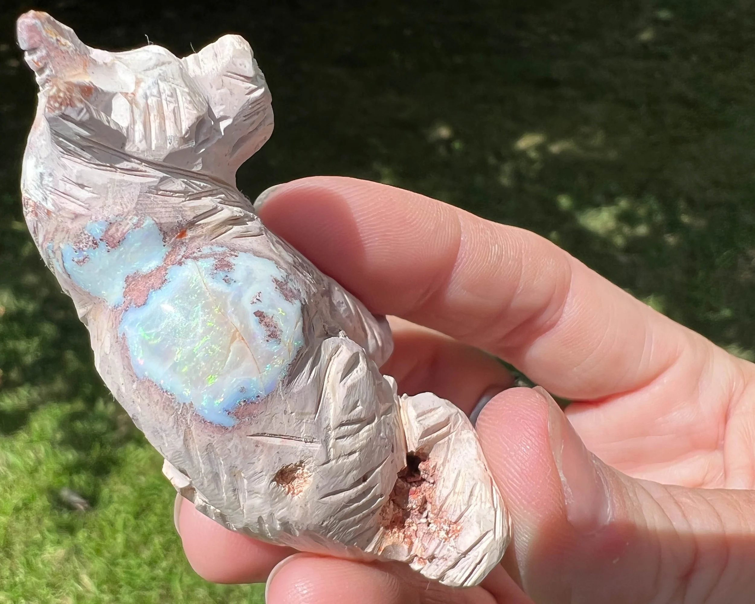 This is a hand carved wolf (or dog) figurine made with flashy Mexican Fire Opal and its' matrix. The opal has beautiful flash that is much better in person. Very detailed and great for any wolf or canine lover. Could also be dog or coyote figurine.