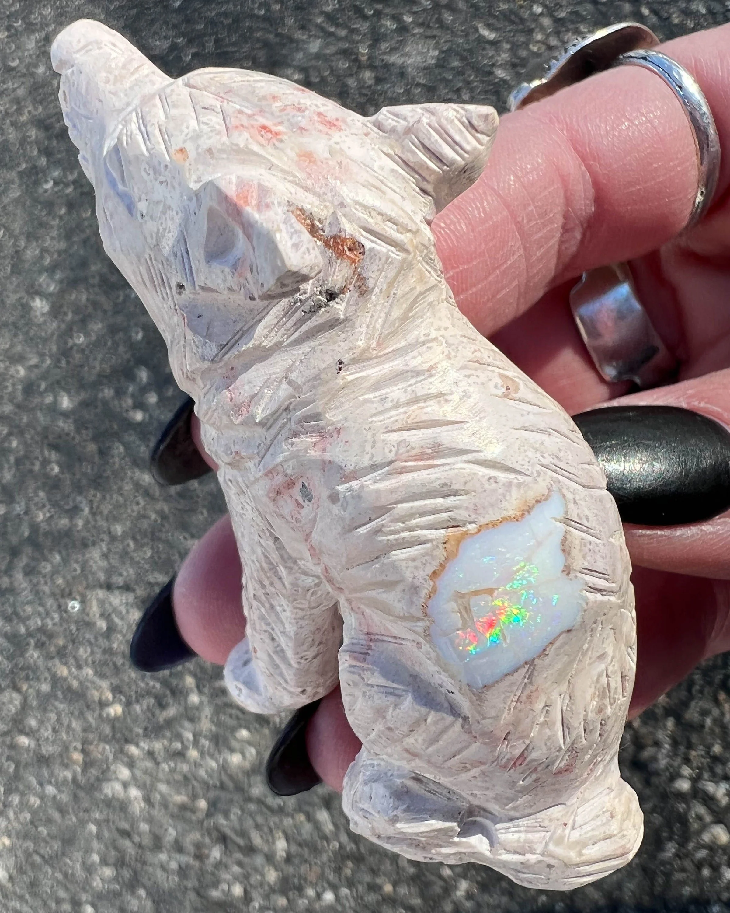 This is a hand carved howling wolf figurine made with flashy Mexican Opal and its' matrix. The opal has full rainbow flash that doesn't look as great in photos but is wonderful in person!