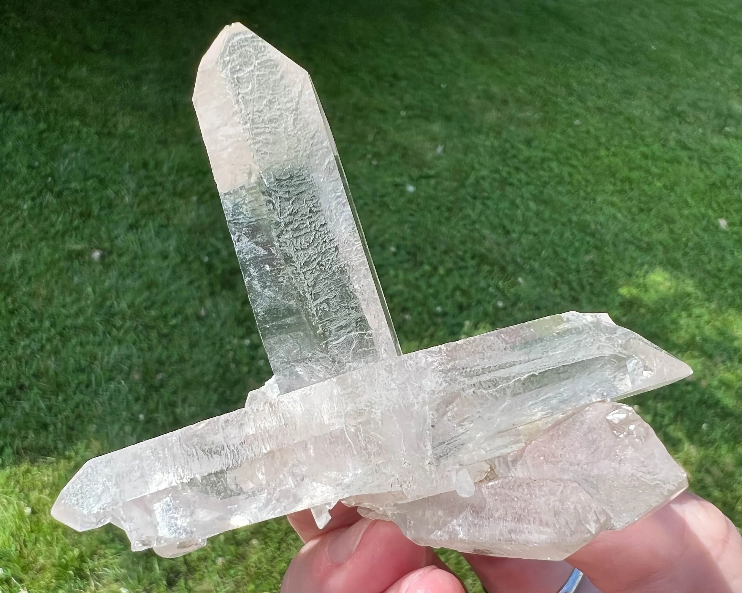 This is a beautiful and funky Quartz cluster from Brazil. It is water clear, or optical Quartz crystals, many are self healed, have multiple terminations, crystals going into other crystals, and even a little bit of Lodolite inclusions. This piece does stand upright and displays nicely. The formation is funky but aesthetic, the crystals are beautiful and you can catch some little rainbows in there too.