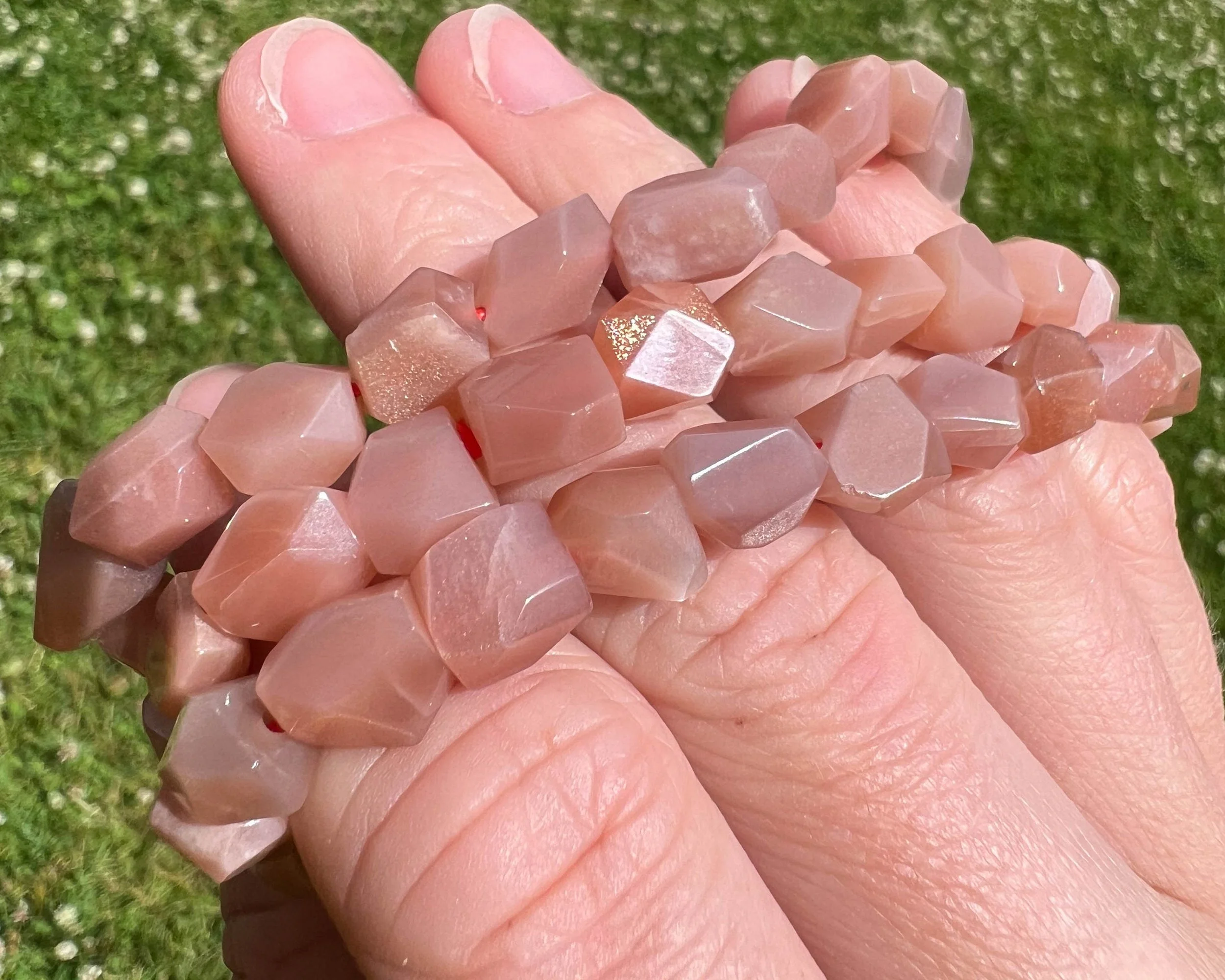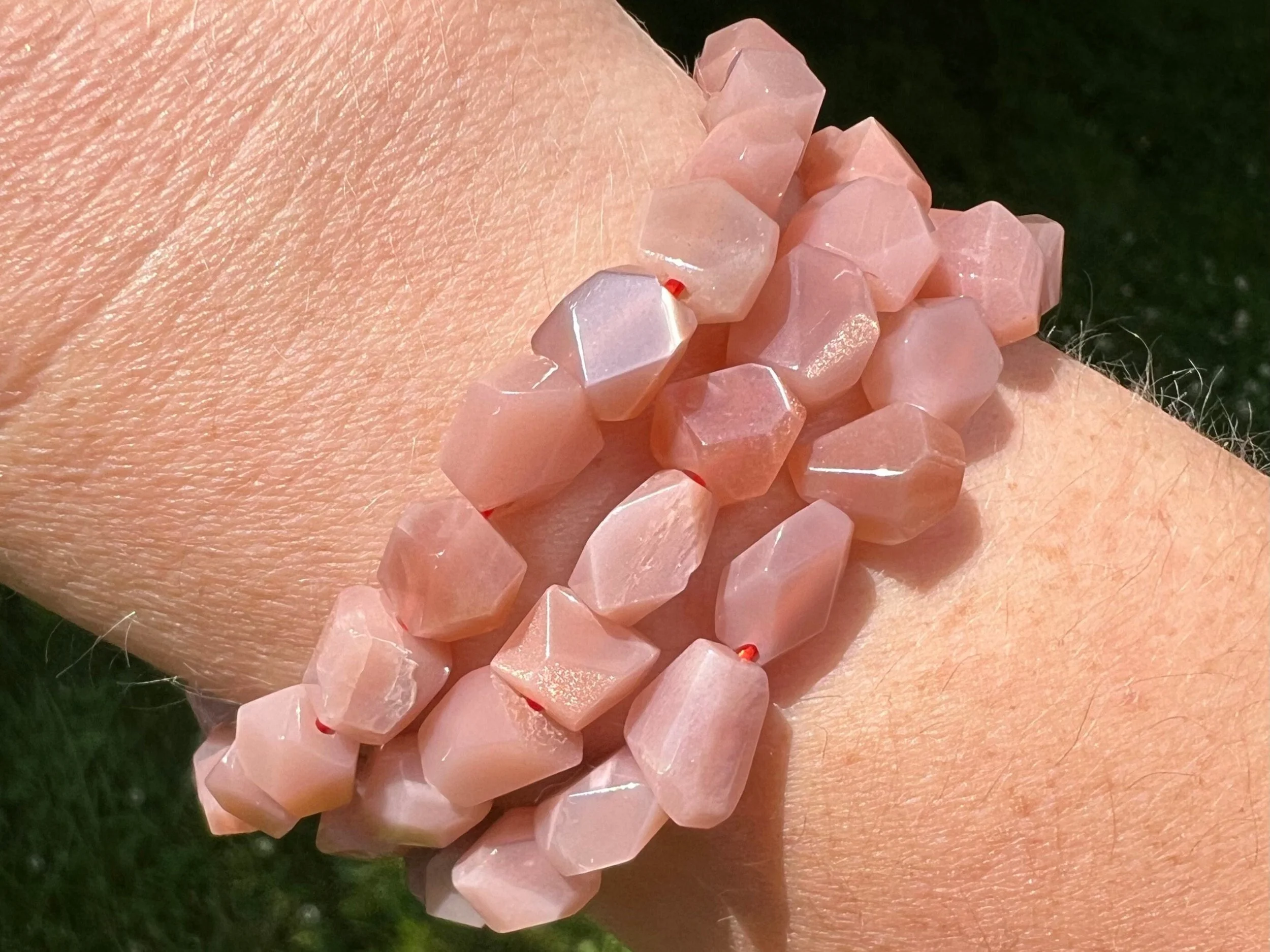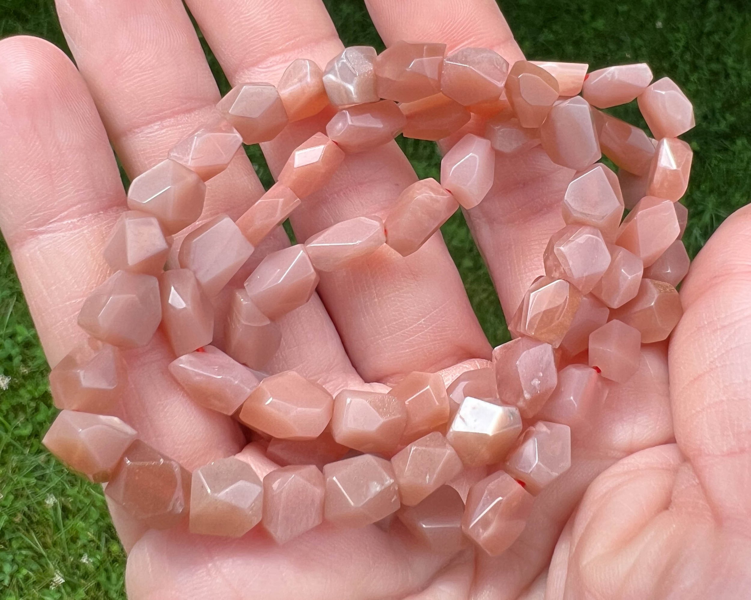 These beautiful bracelets are made of natural Peach Moonstone gemstone beads on red stretchy string. They measure about 7 inches long with no clasp or opening for easy pull-on and off! The beads are freeform faceted / geometric shapes. Many are very sparkly like confetti Sunstone and some also have blue flash or opalescence like Moonstone in them. Very beautiful bracelets.
