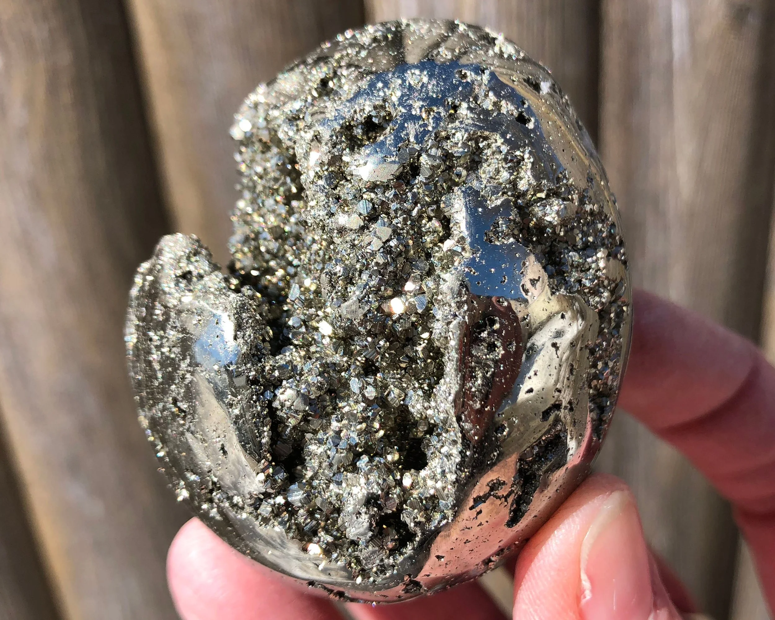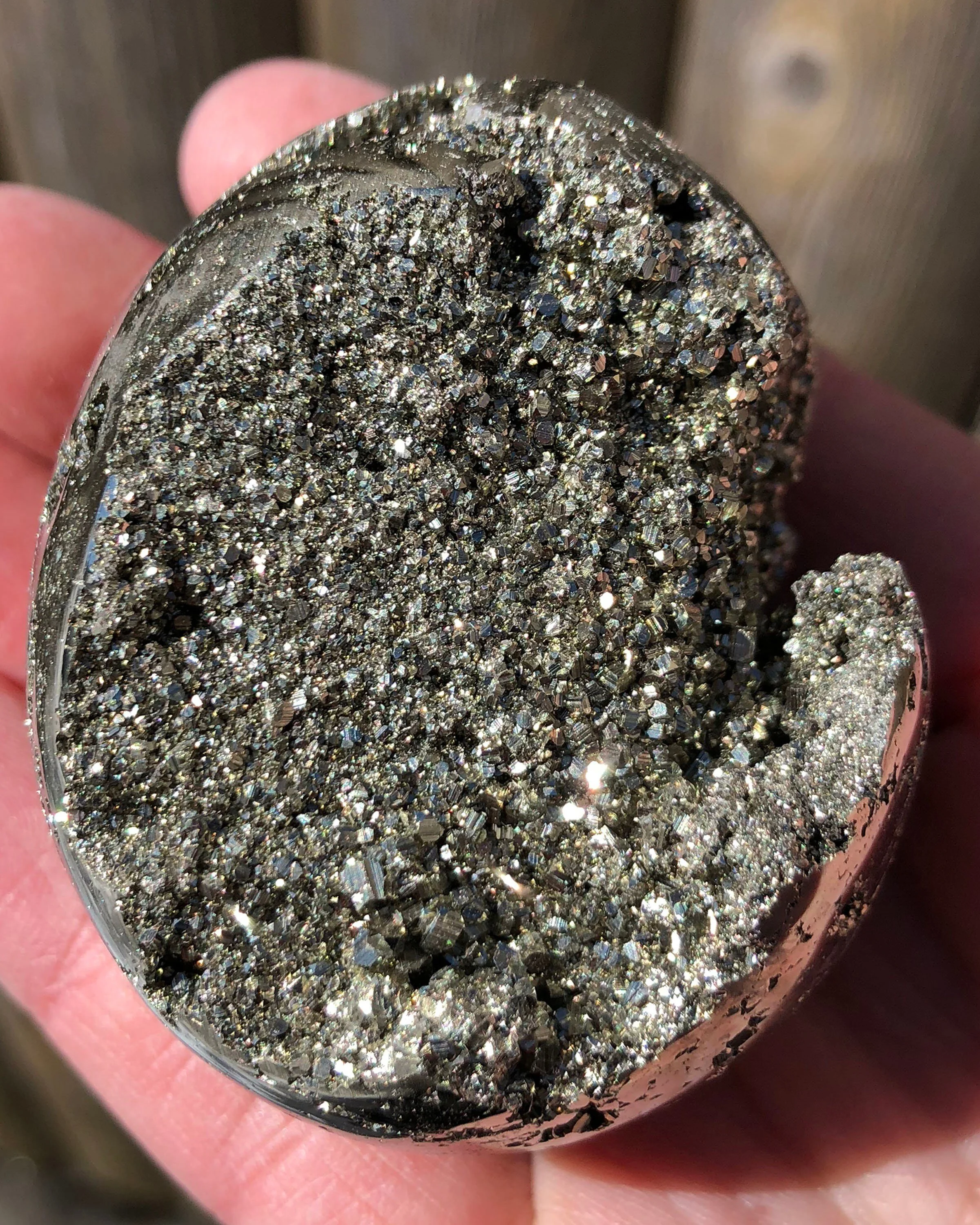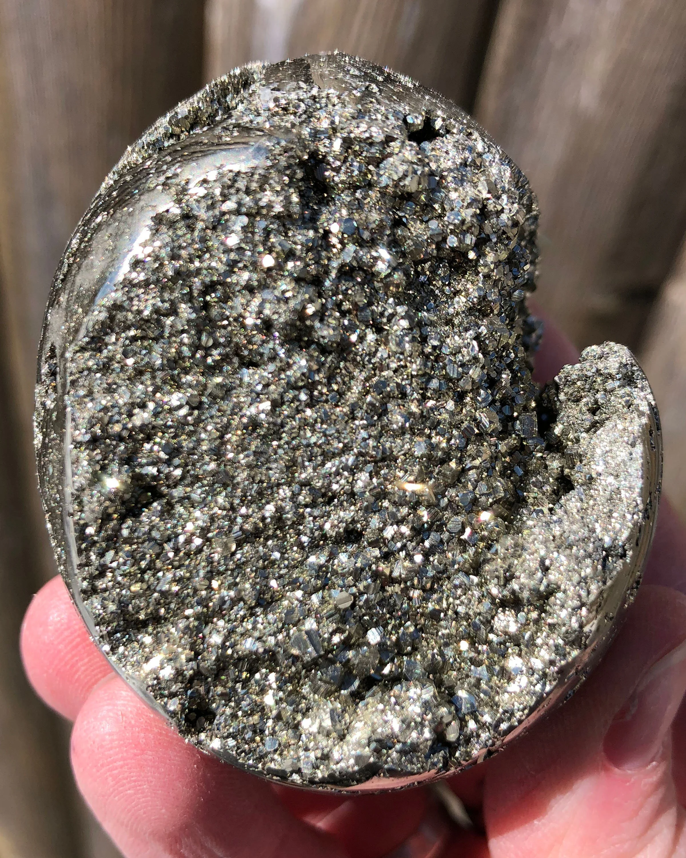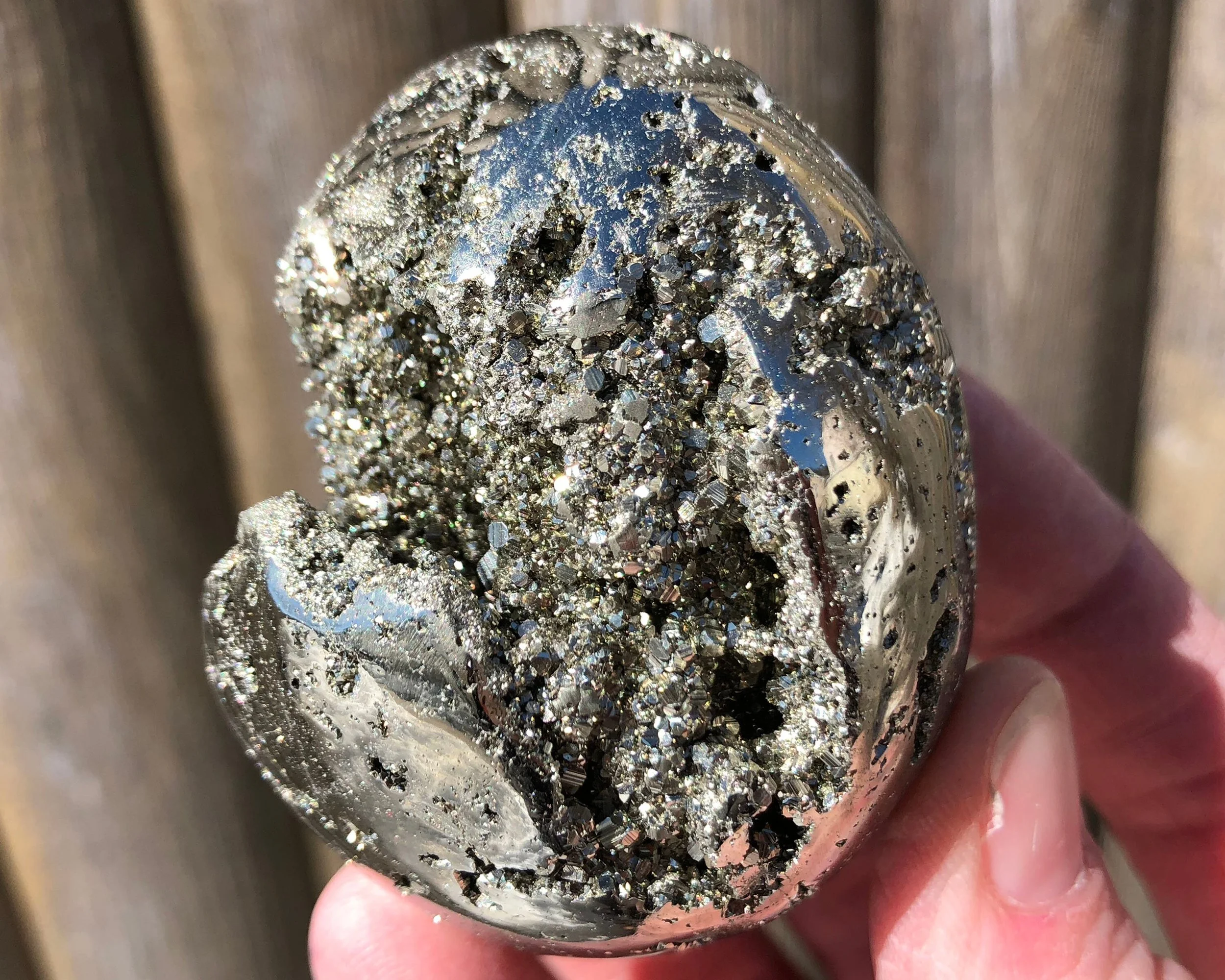 This is a beautiful, lustrous egg of high quality Peruvian Pyrite. It is gold in color with open pockets of little geometric druzy Pyrite dodecahedrons that sparkle and shine! :D A gorgeous egg that looks good ALL the way around, it's gorgeous! <3