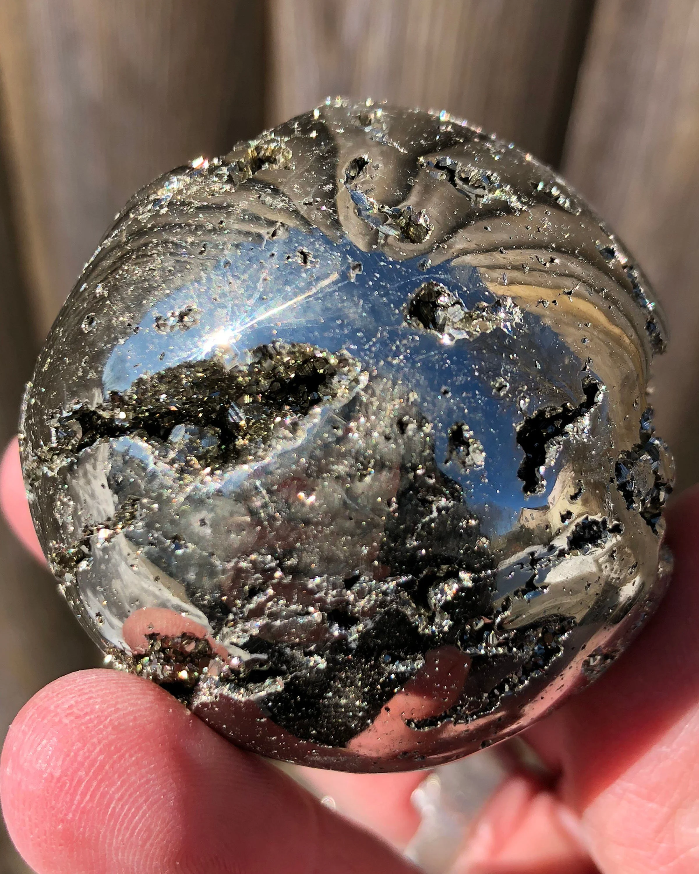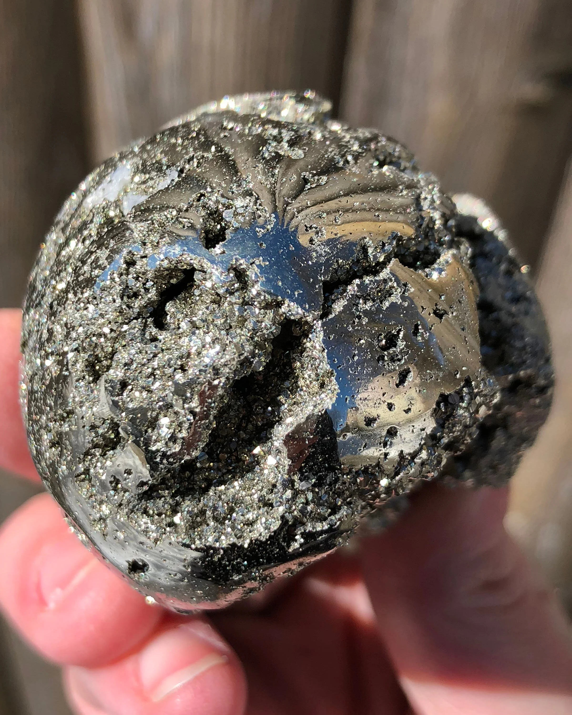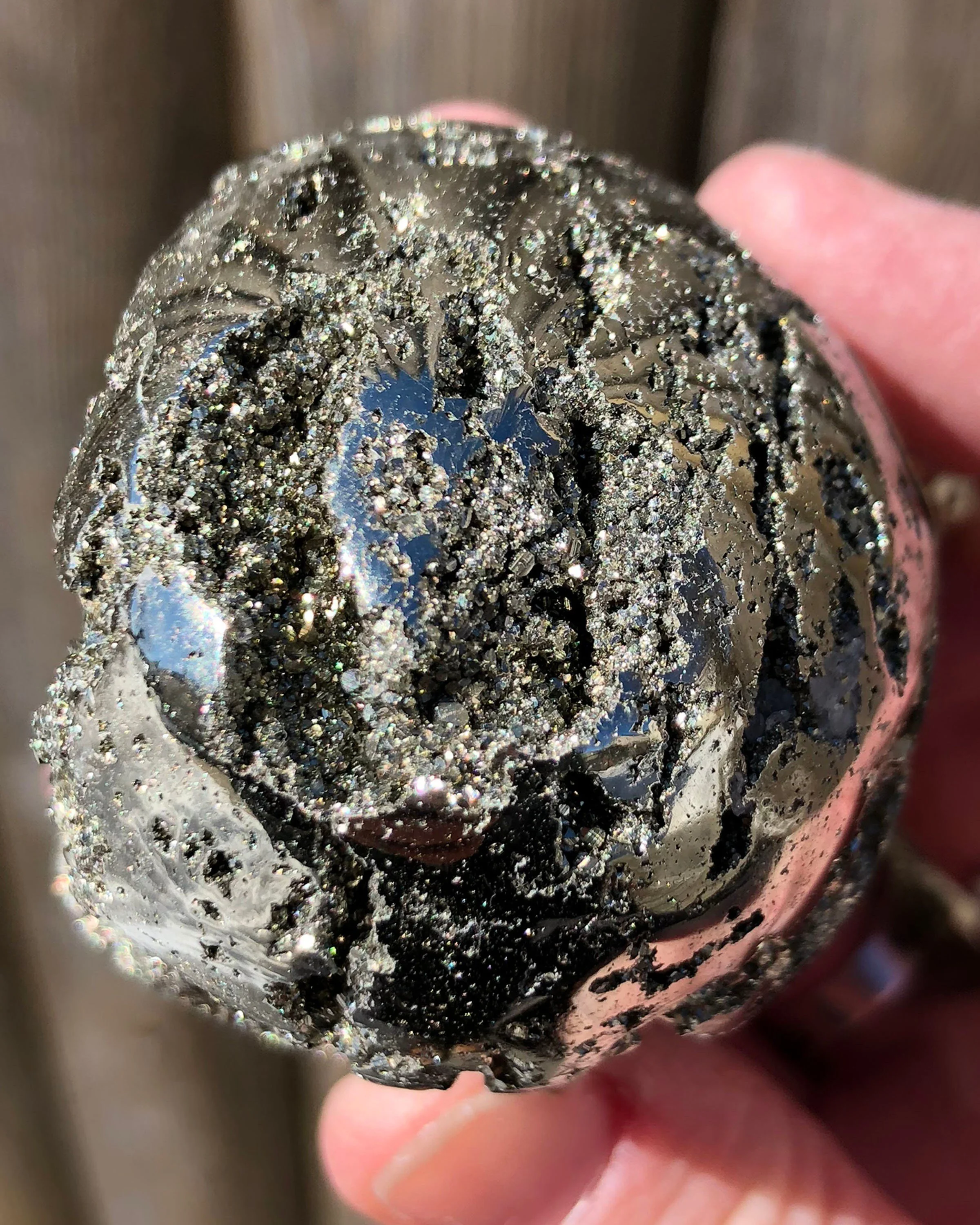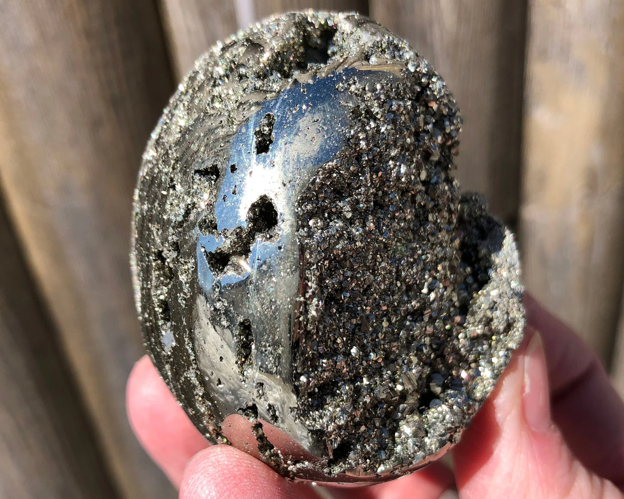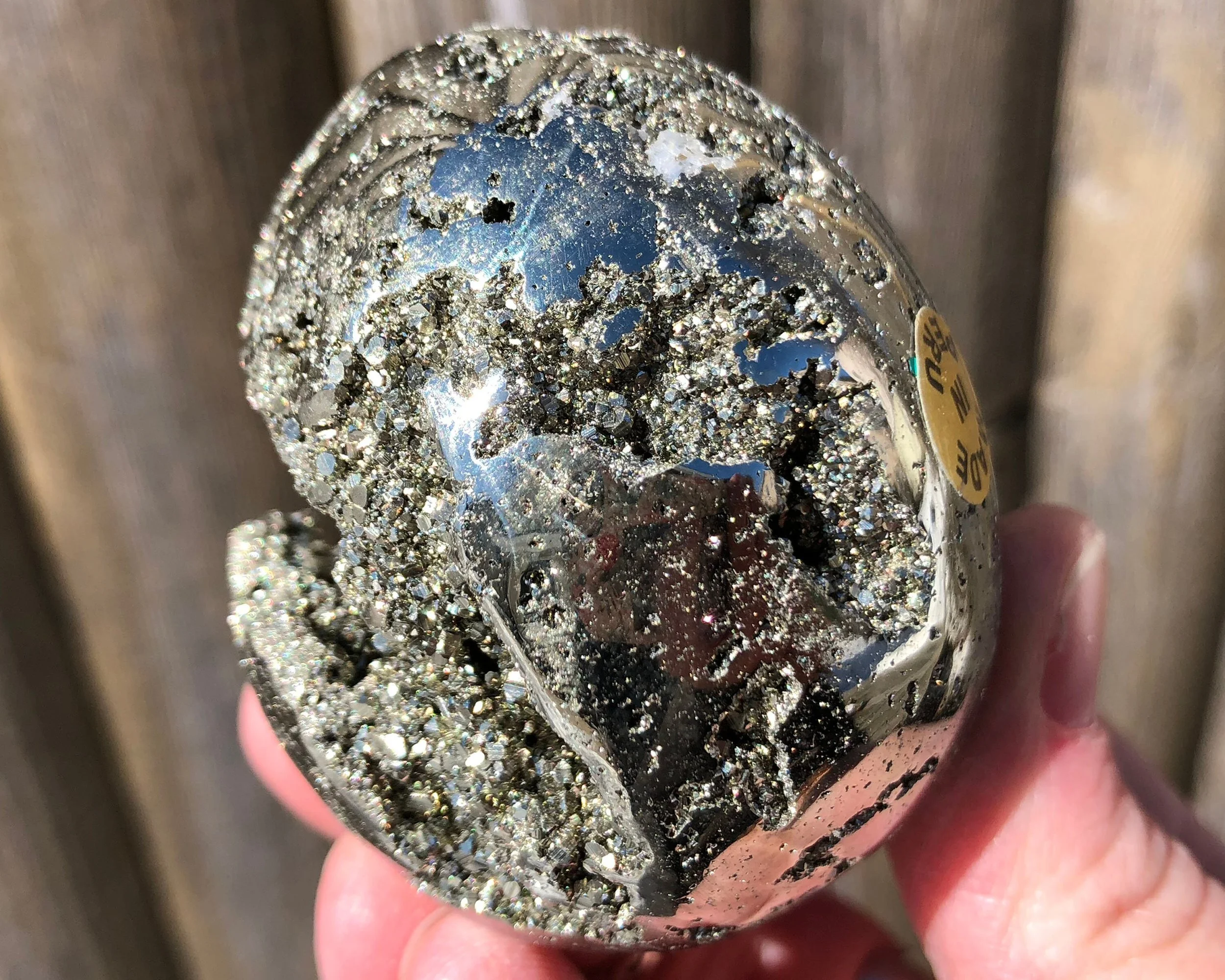 This is a beautiful, lustrous egg of high quality Peruvian Pyrite. It is gold in color with open pockets of little geometric druzy Pyrite dodecahedrons that sparkle and shine! :D A gorgeous egg that looks good ALL the way around, it's gorgeous! <3