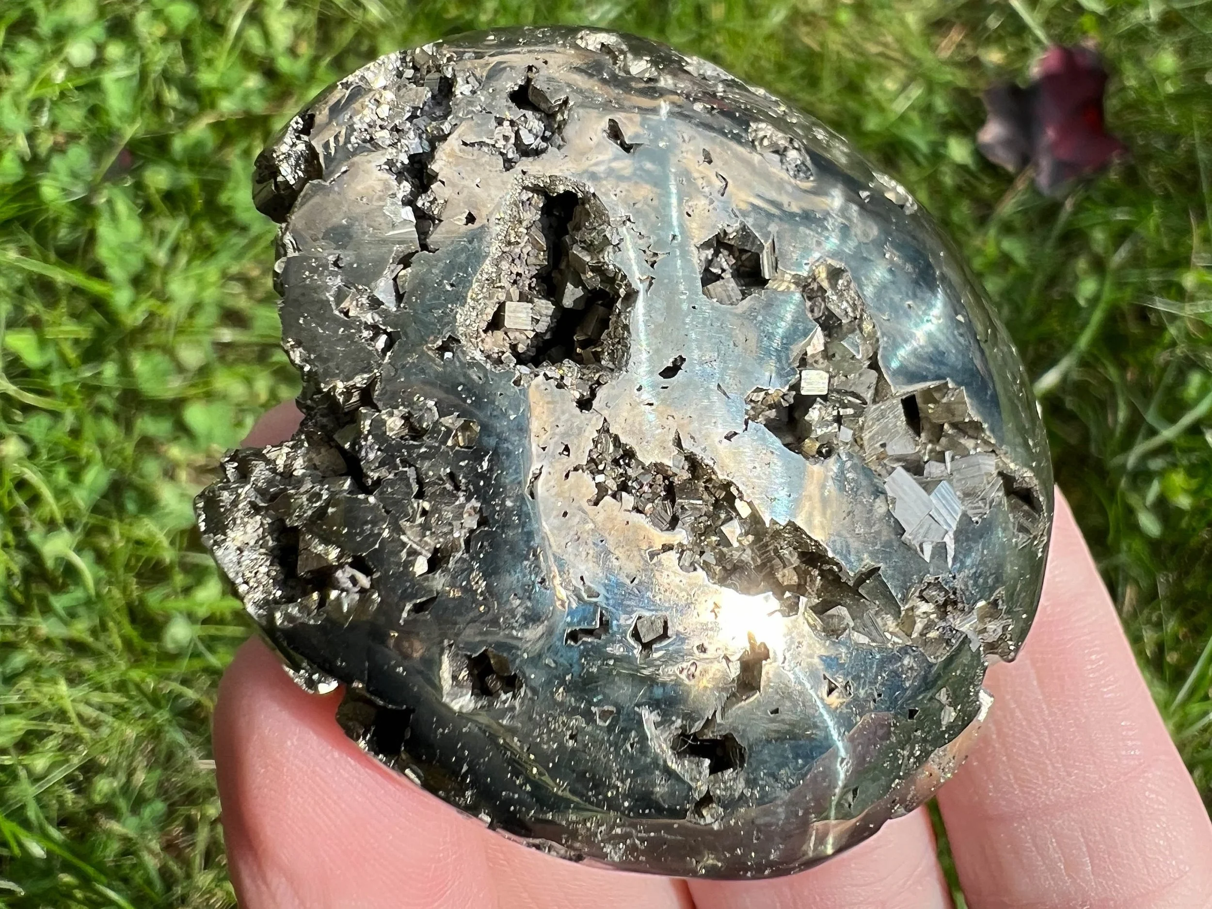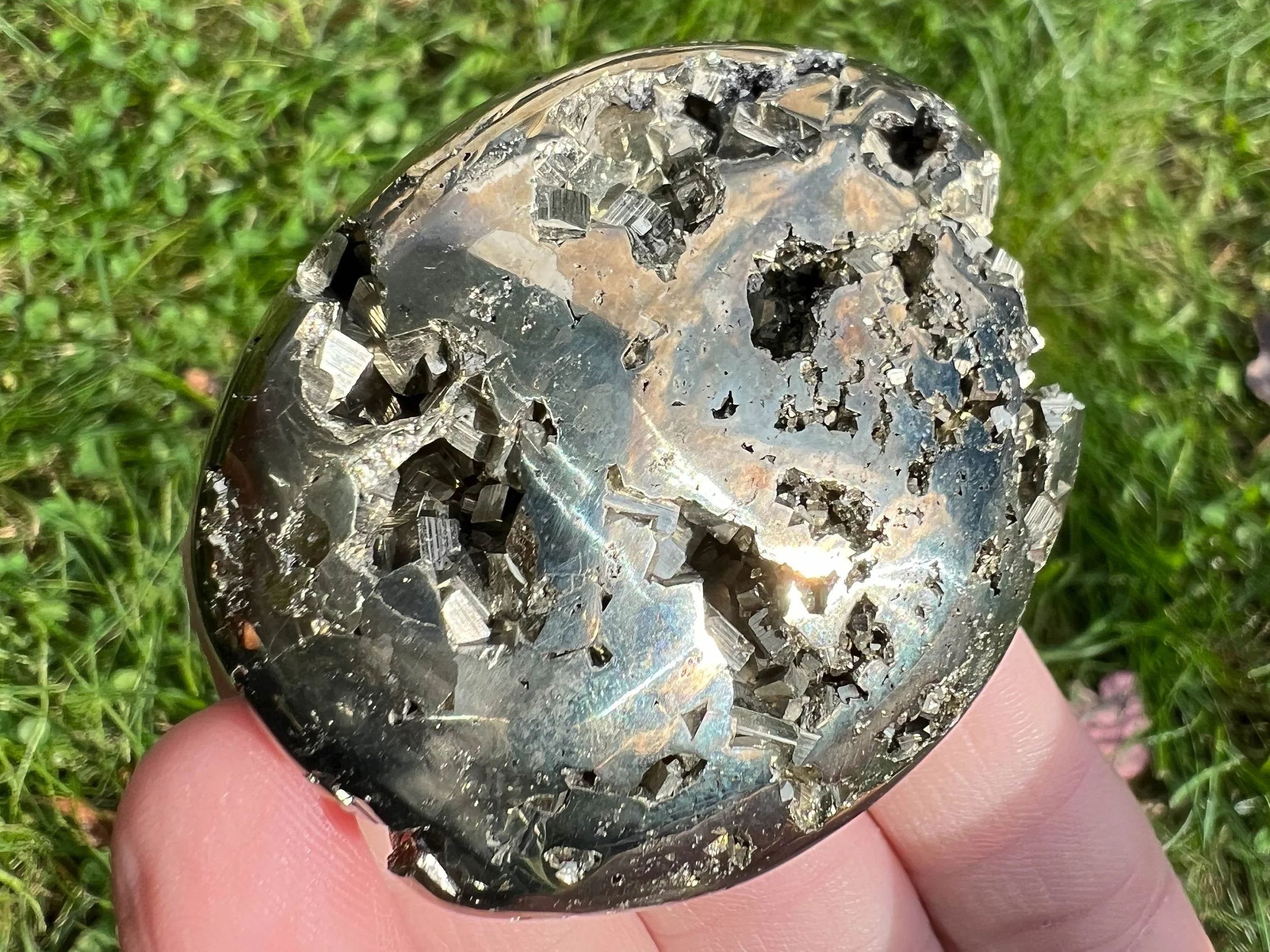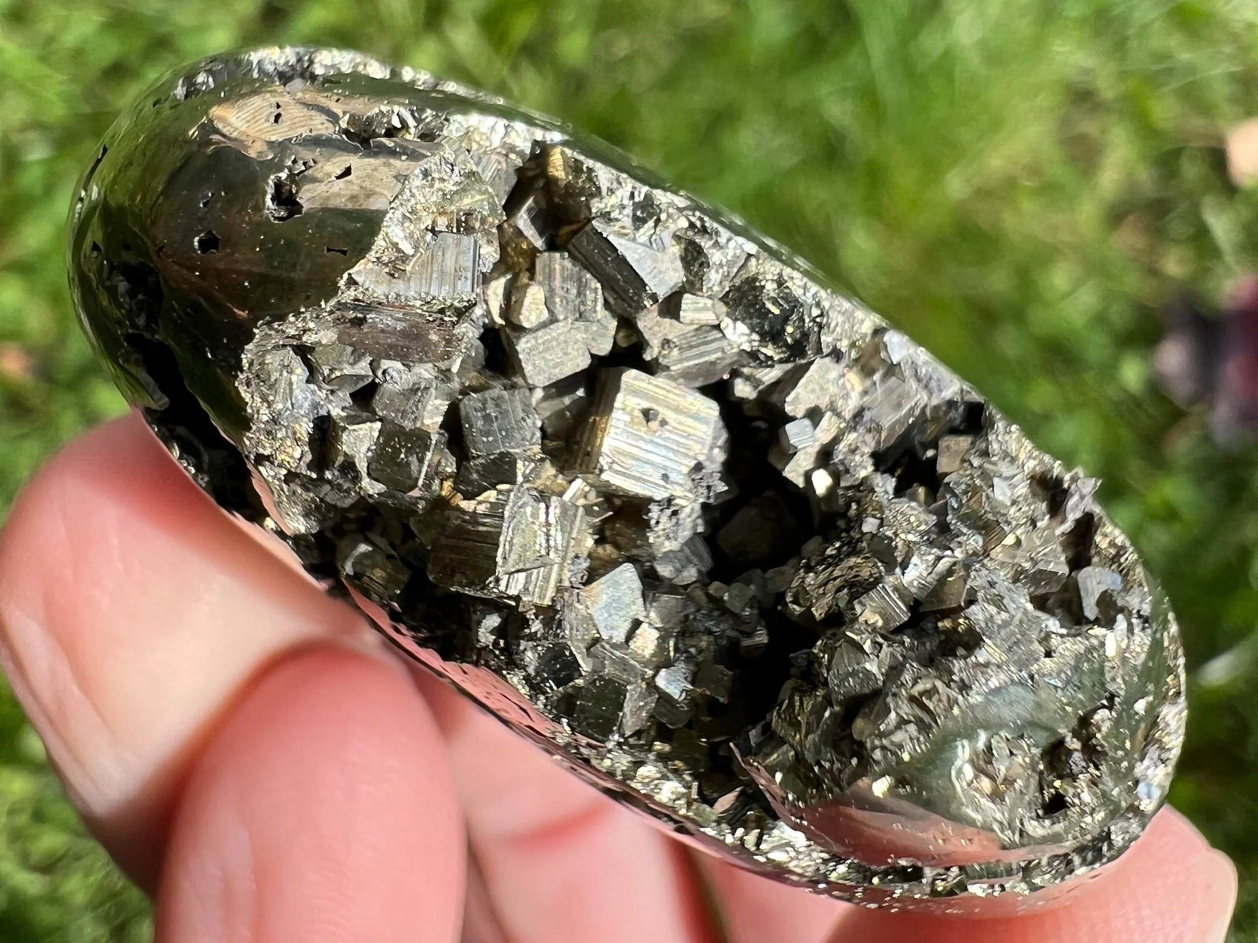 This is a beautiful, high quality, lustrous palm stone of Peruvian Pyrite druzy cluster. It is gold in color with open geode pockets of geometric cubic crystals that sparkle like the sun itself :D A gorgeous palm stone that sparkles all the way around! <3