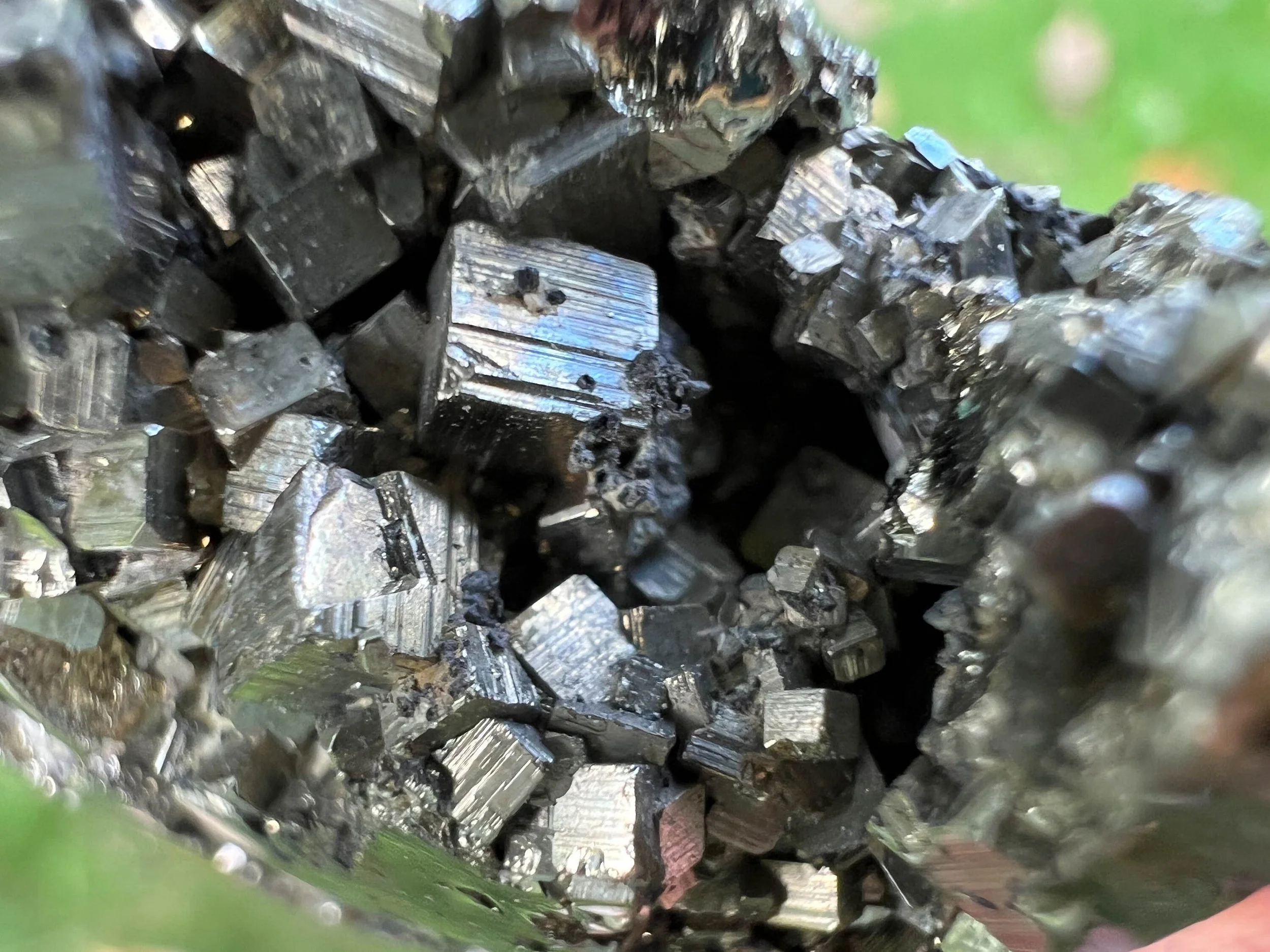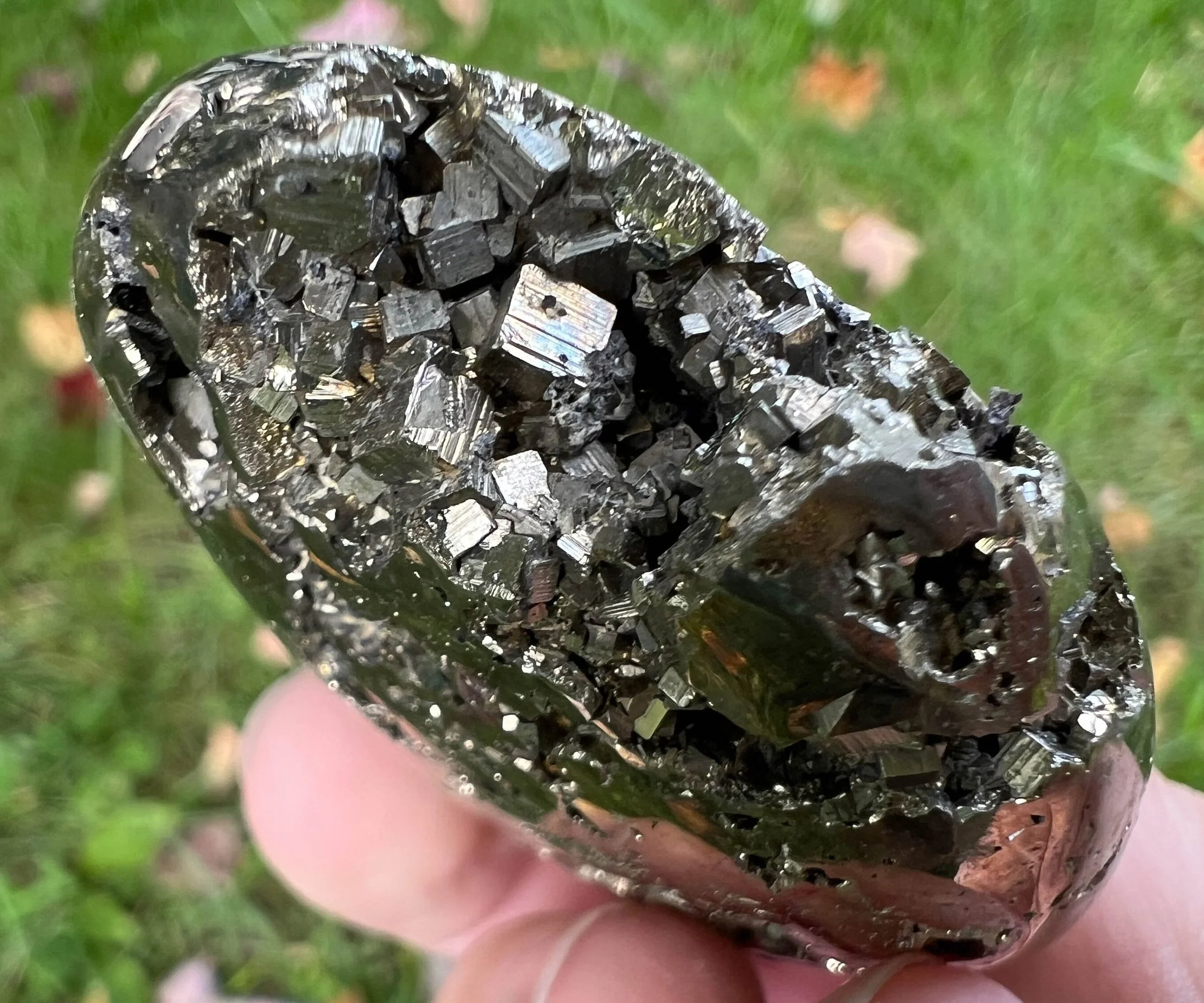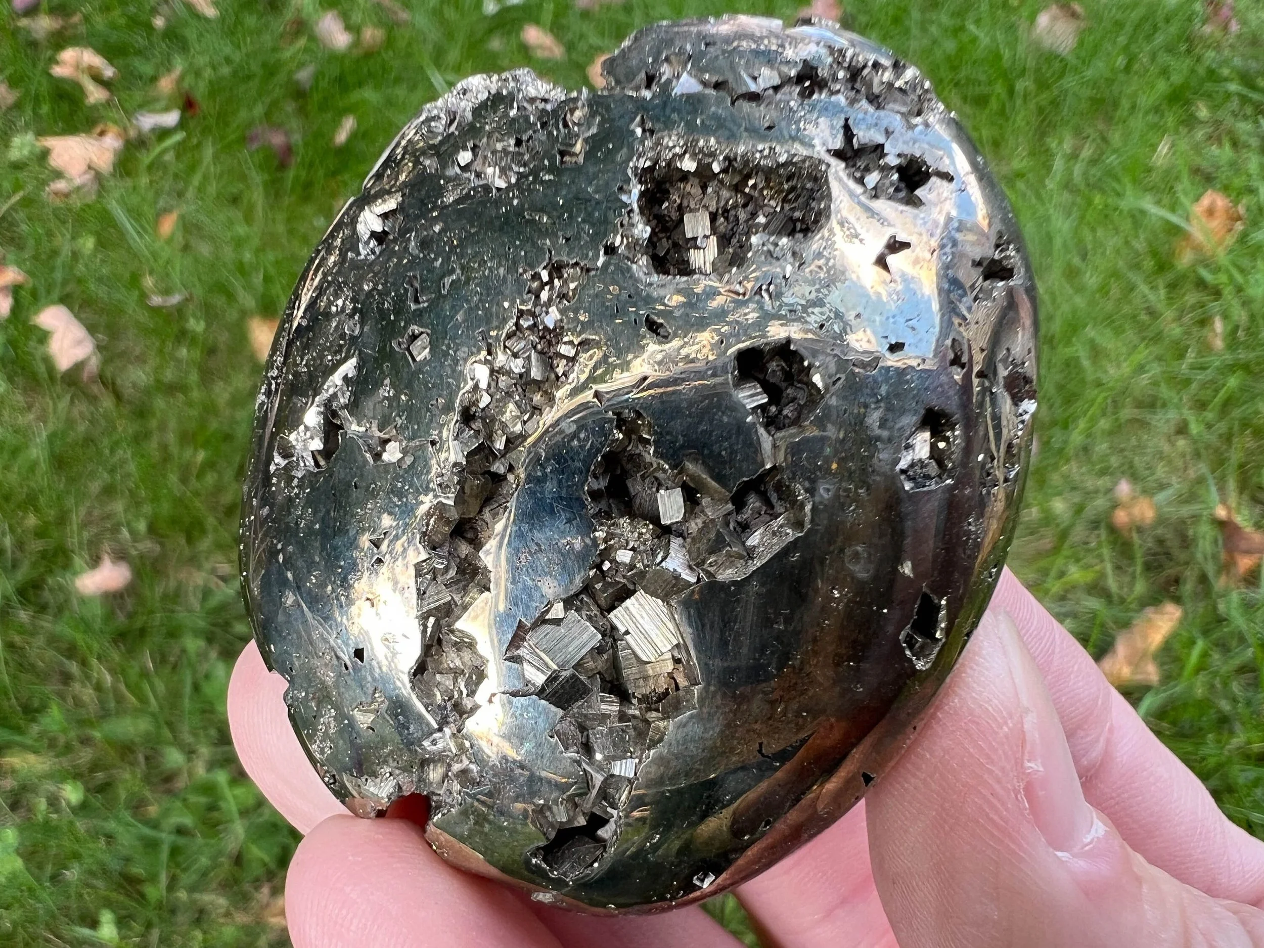 This is a beautiful, high quality, lustrous palm stone of Peruvian Pyrite druzy cluster. It is gold in color with open geode pockets of geometric cubic crystals that sparkle like the sun itself :D A gorgeous palm stone that sparkles all the way around! <3