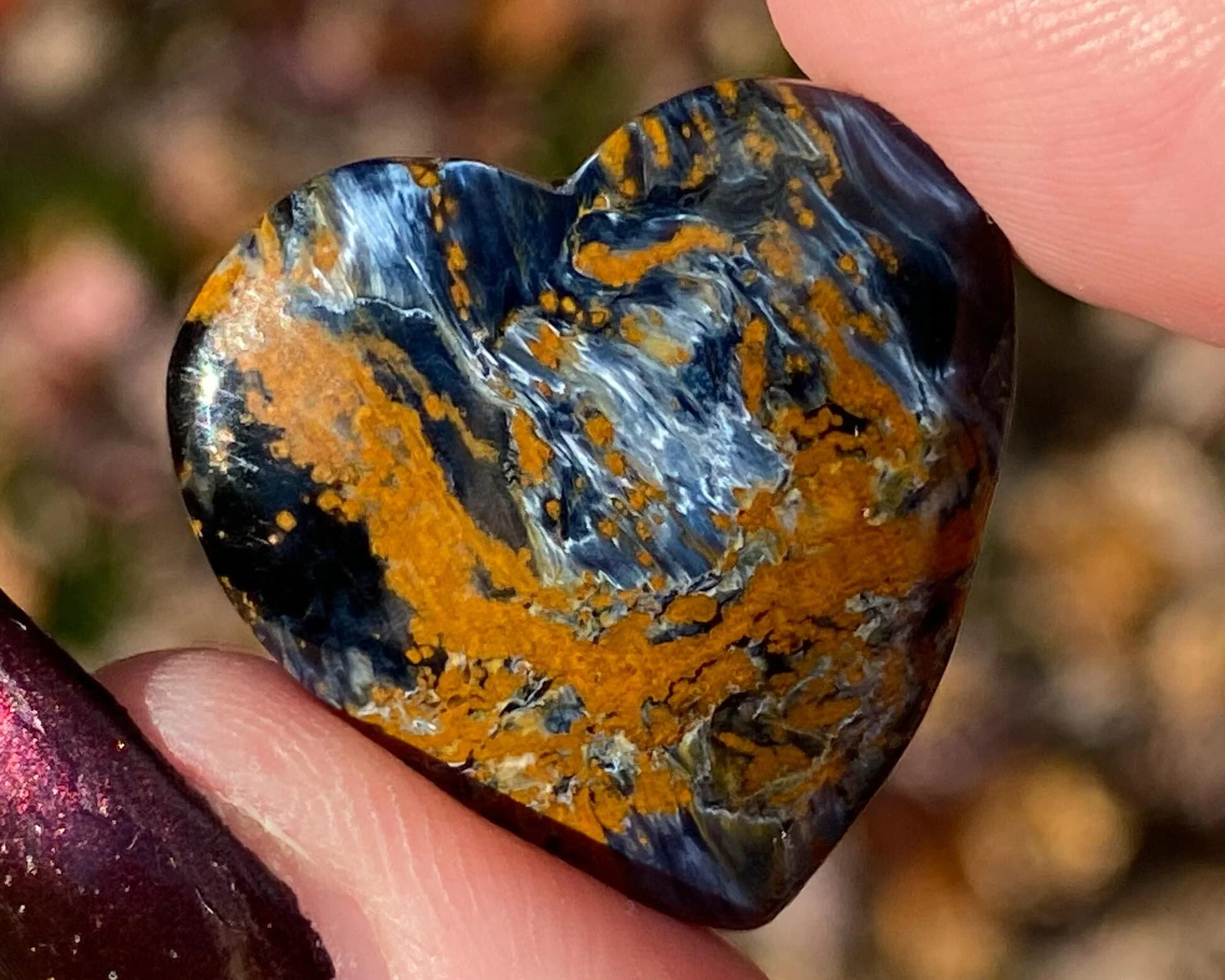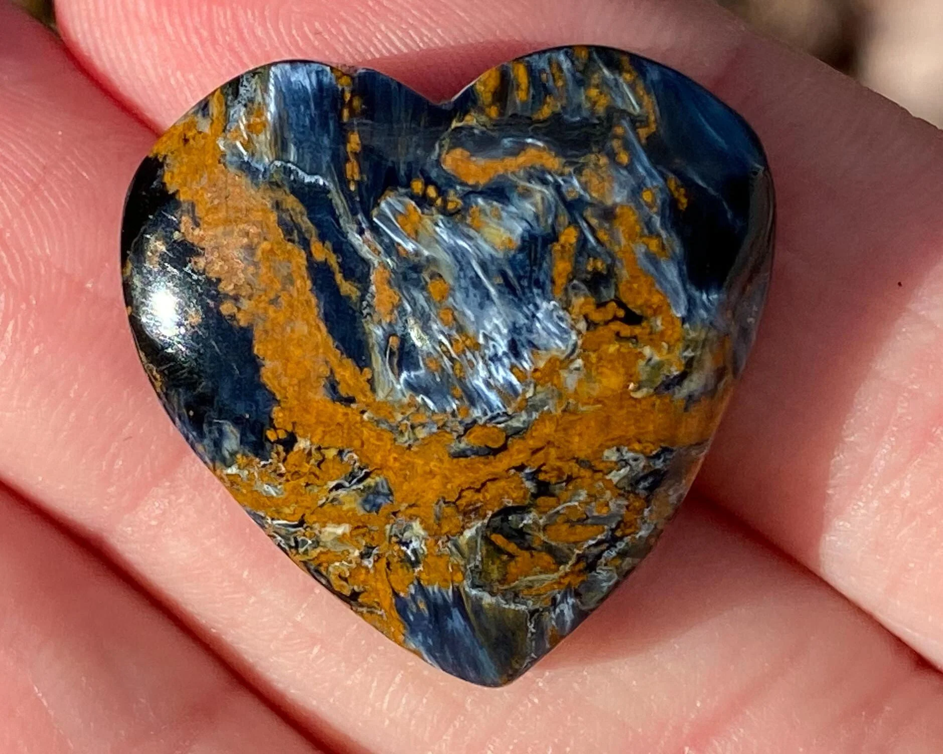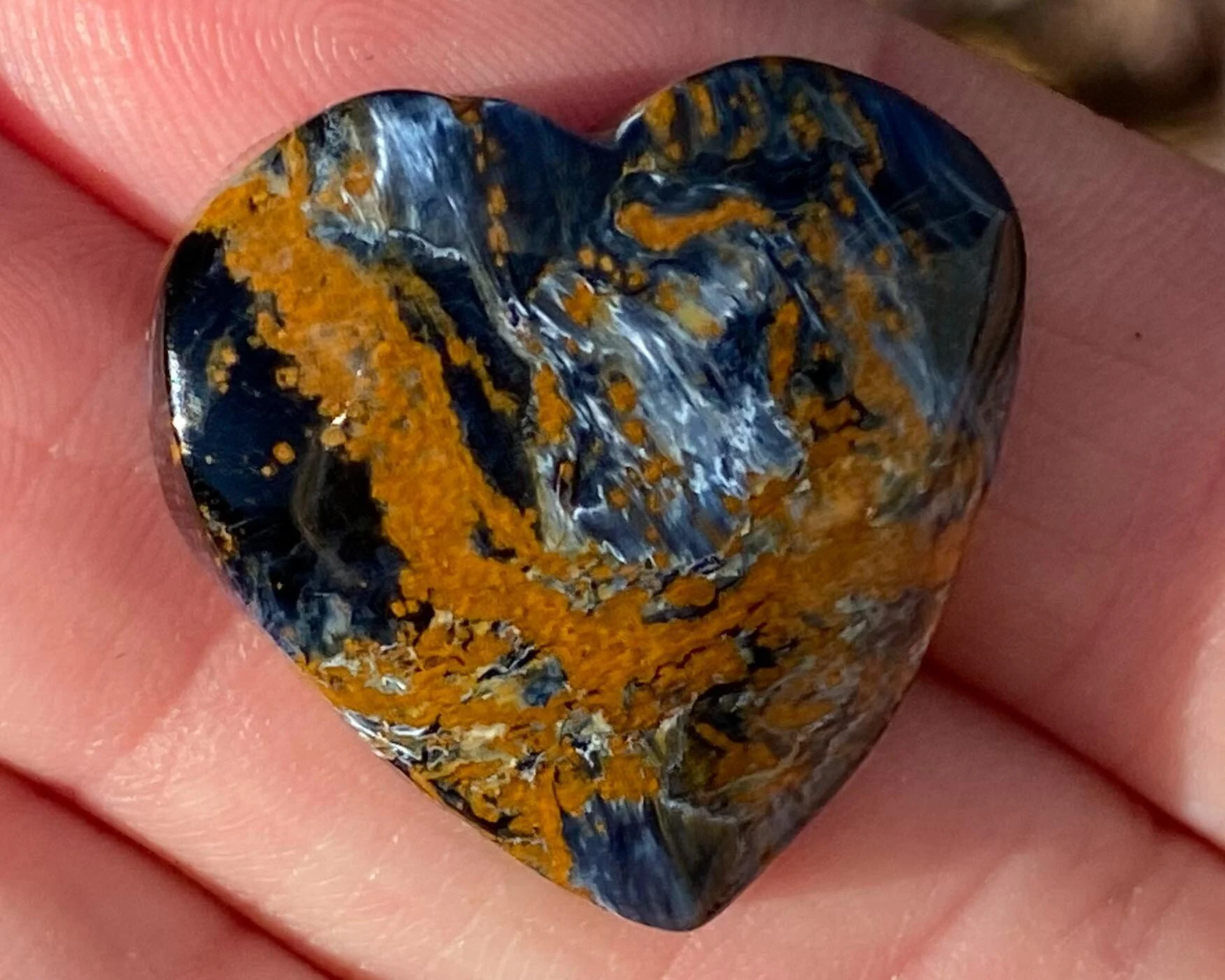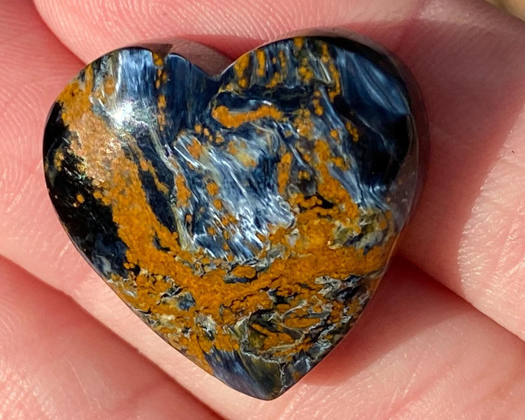 This is a lovely heart cabochon made of Pietersite. Pietersite is a rare form of brecciated TIgers Eye, where the blue and gold chatoyant bits are chaotic rather than arranged in stripes. This is a fabulous piece, beautifully polished all the way around into a heart cabochon with a flat back. Both sides are worthy of display. Absolutely gorgeous!