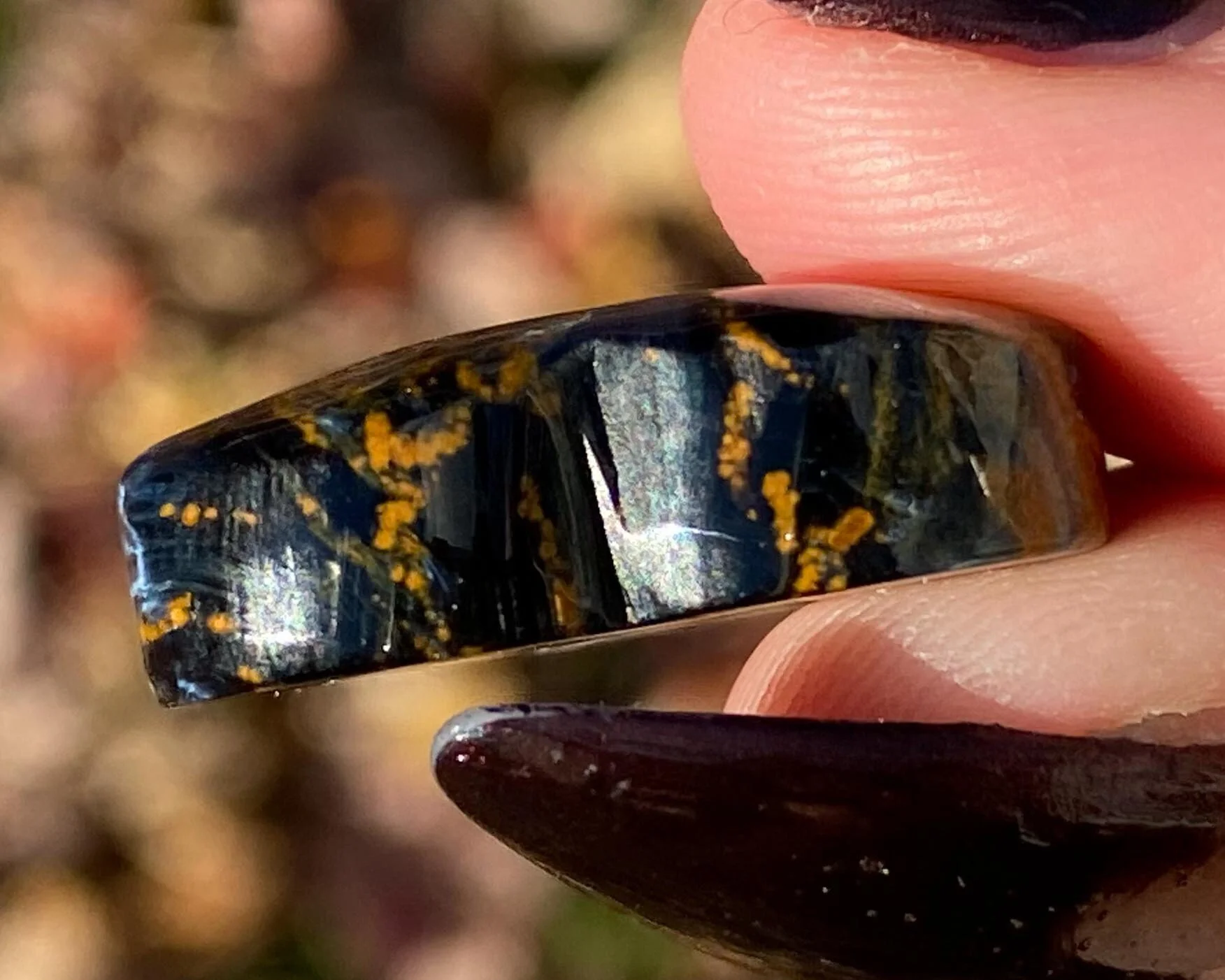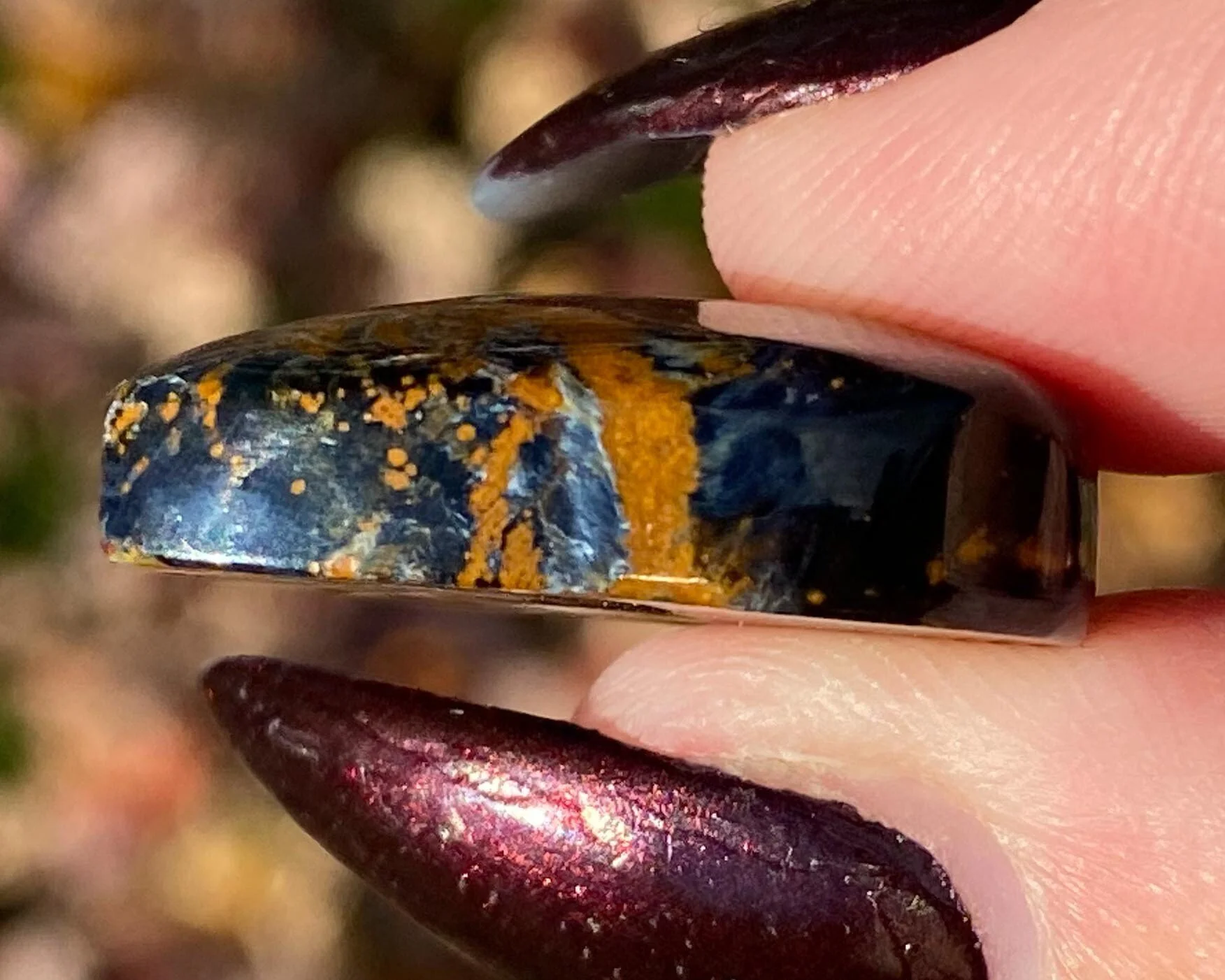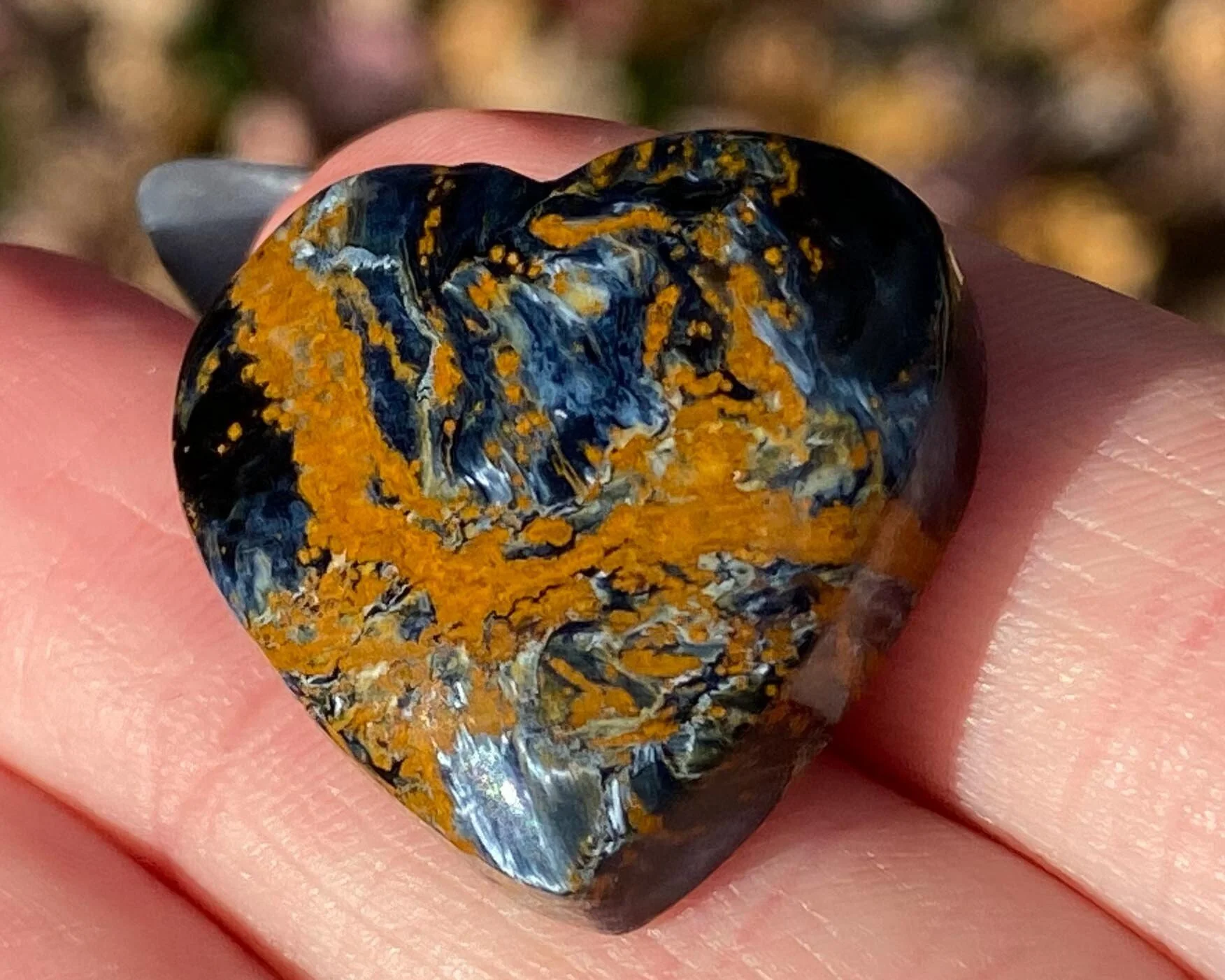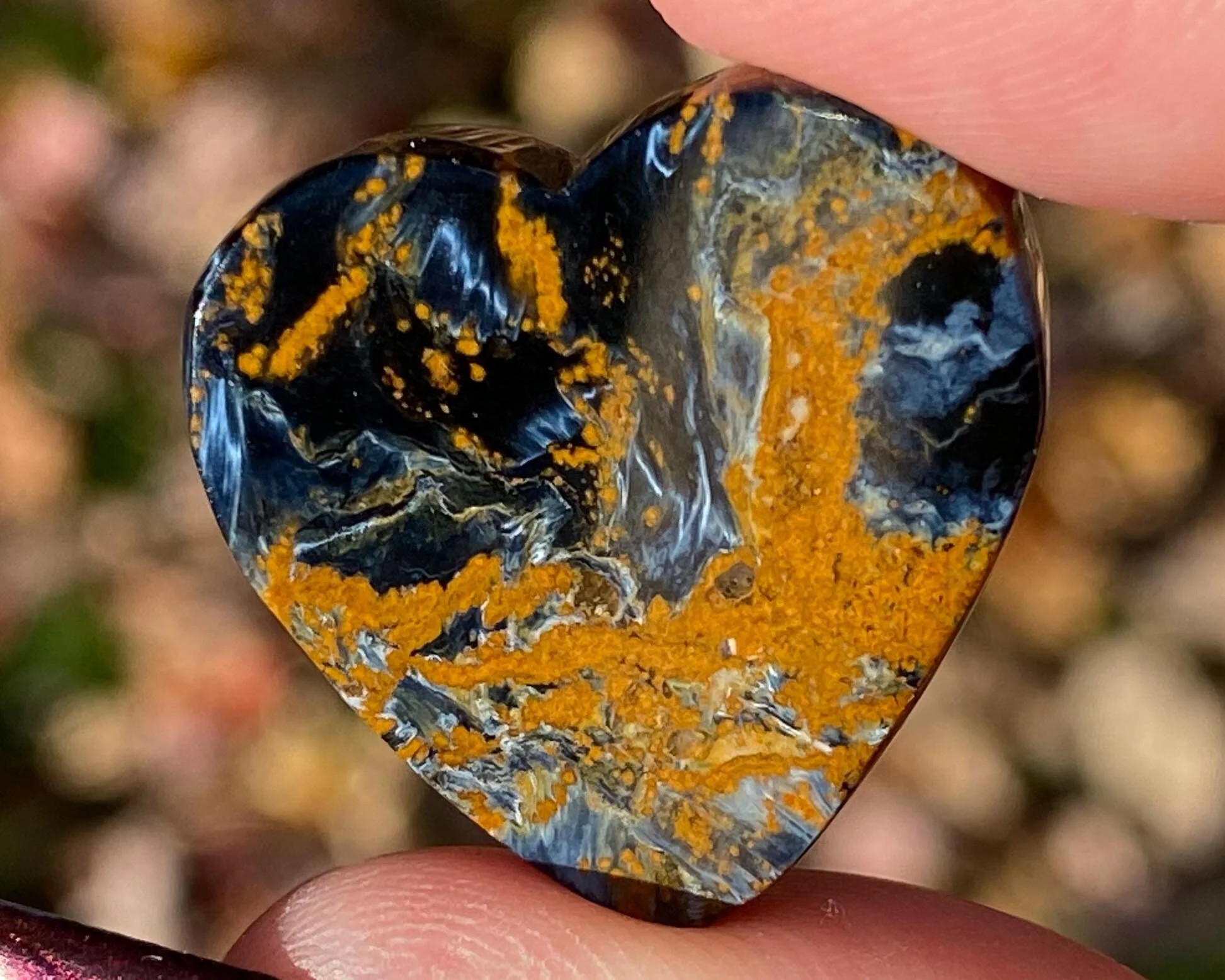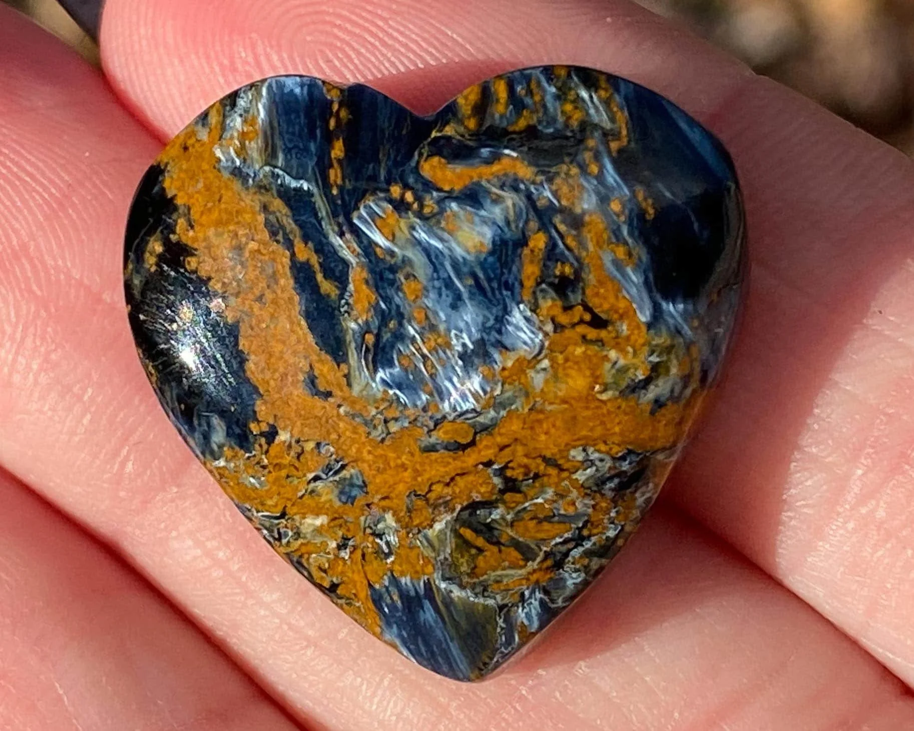 This is a lovely heart cabochon made of Pietersite. Pietersite is a rare form of brecciated TIgers Eye, where the blue and gold chatoyant bits are chaotic rather than arranged in stripes. This is a fabulous piece, beautifully polished all the way around into a heart cabochon with a flat back. Both sides are worthy of display. Absolutely gorgeous!