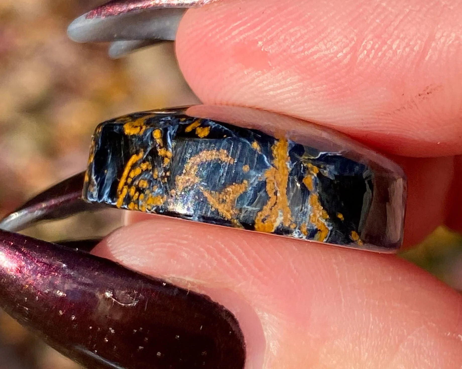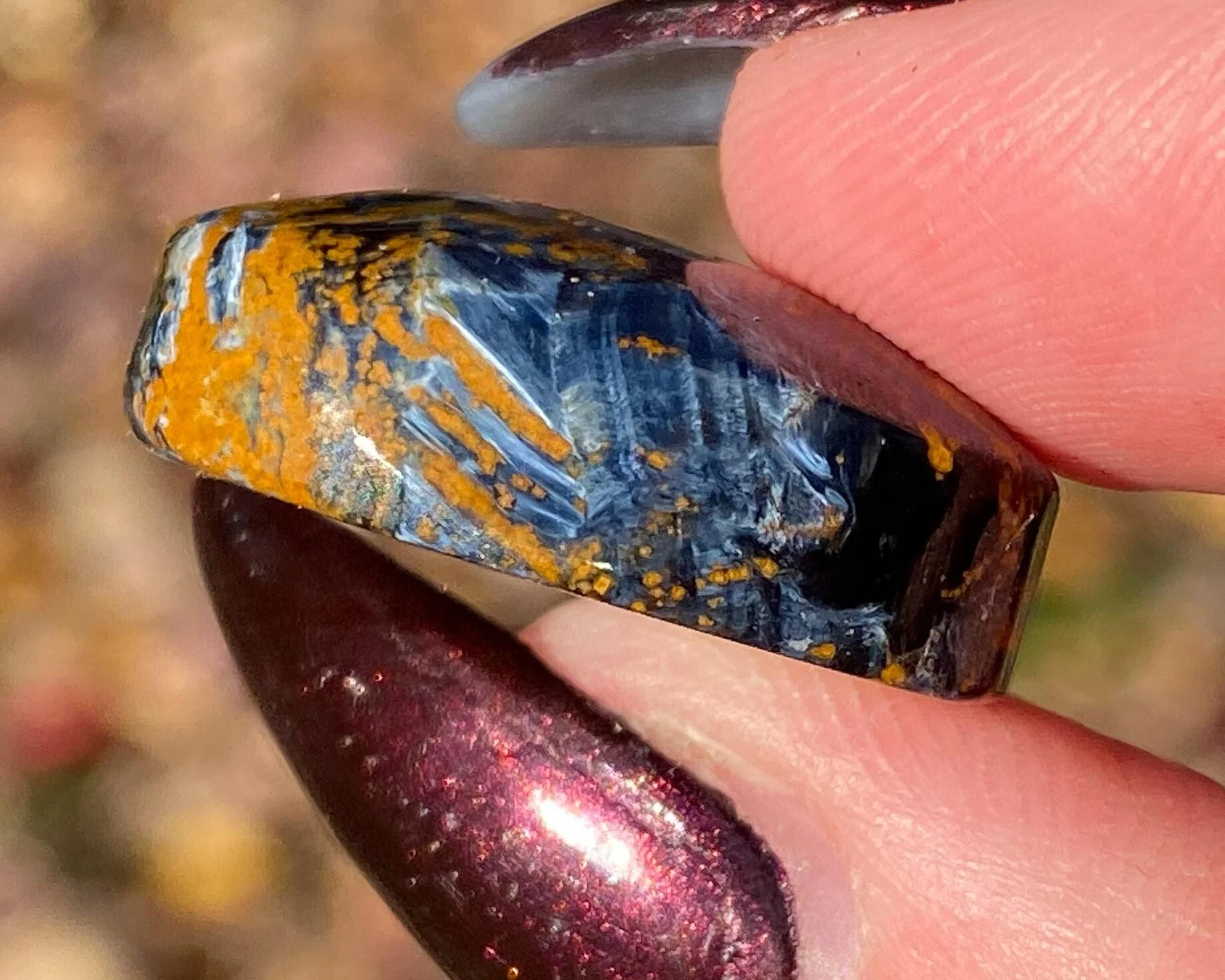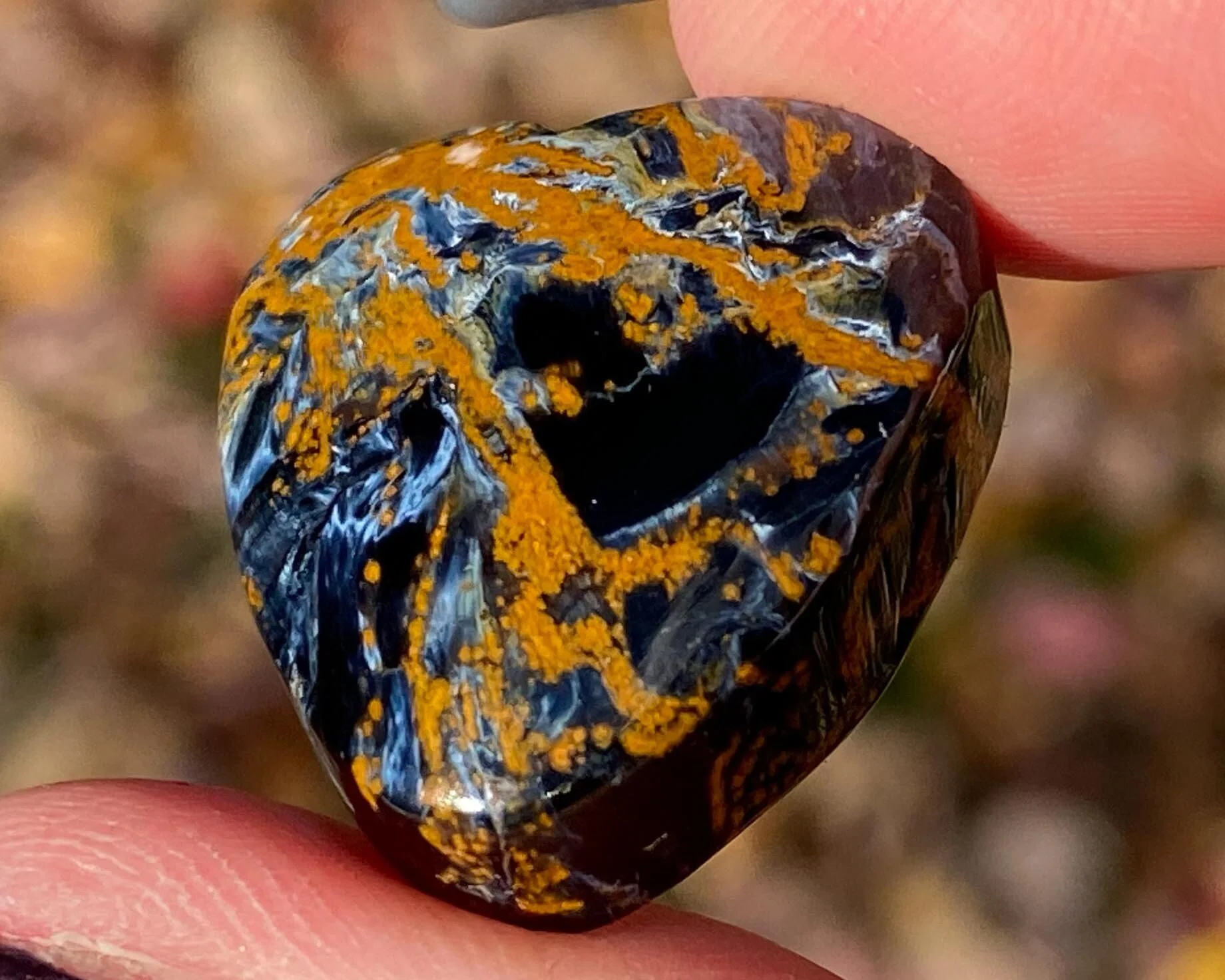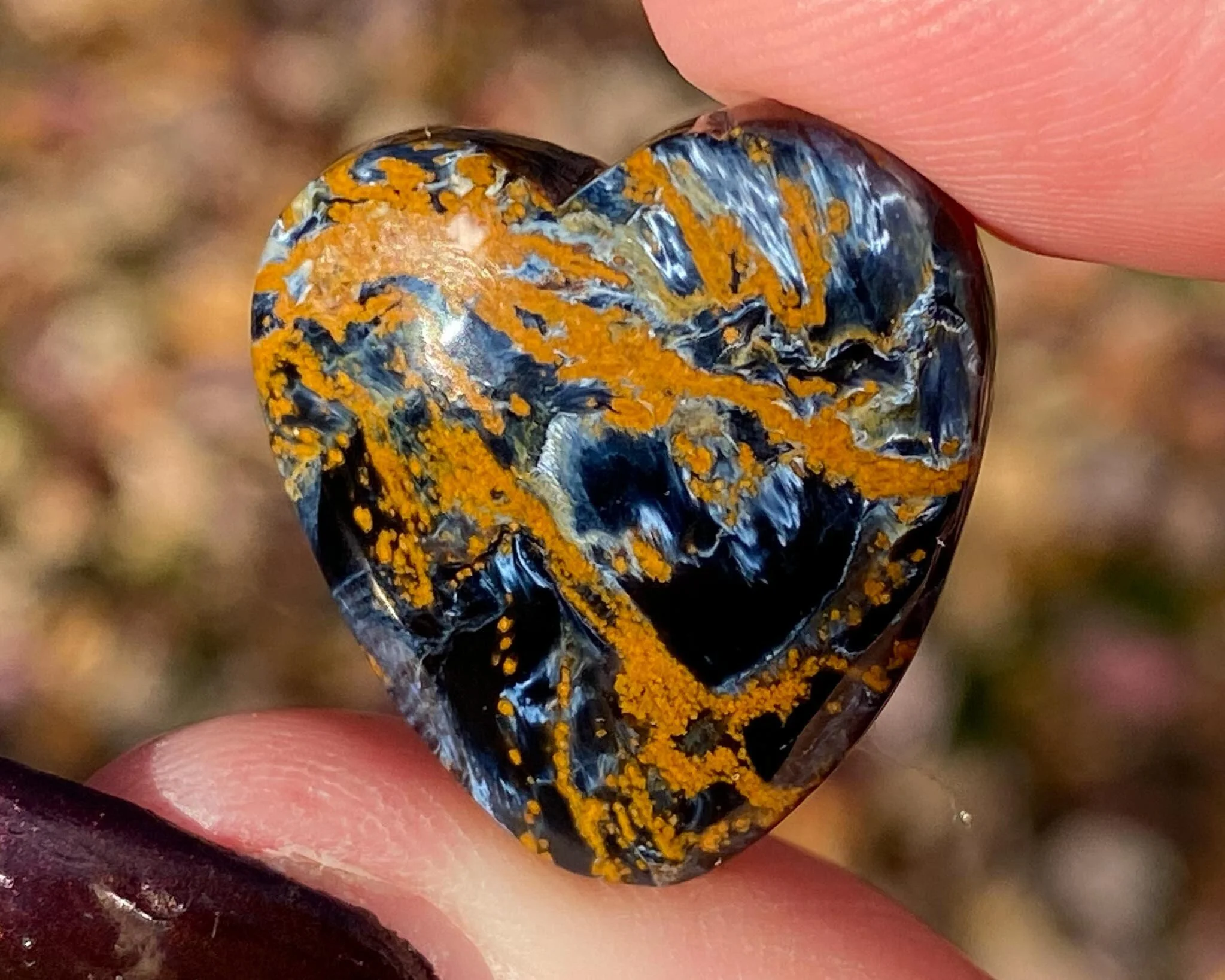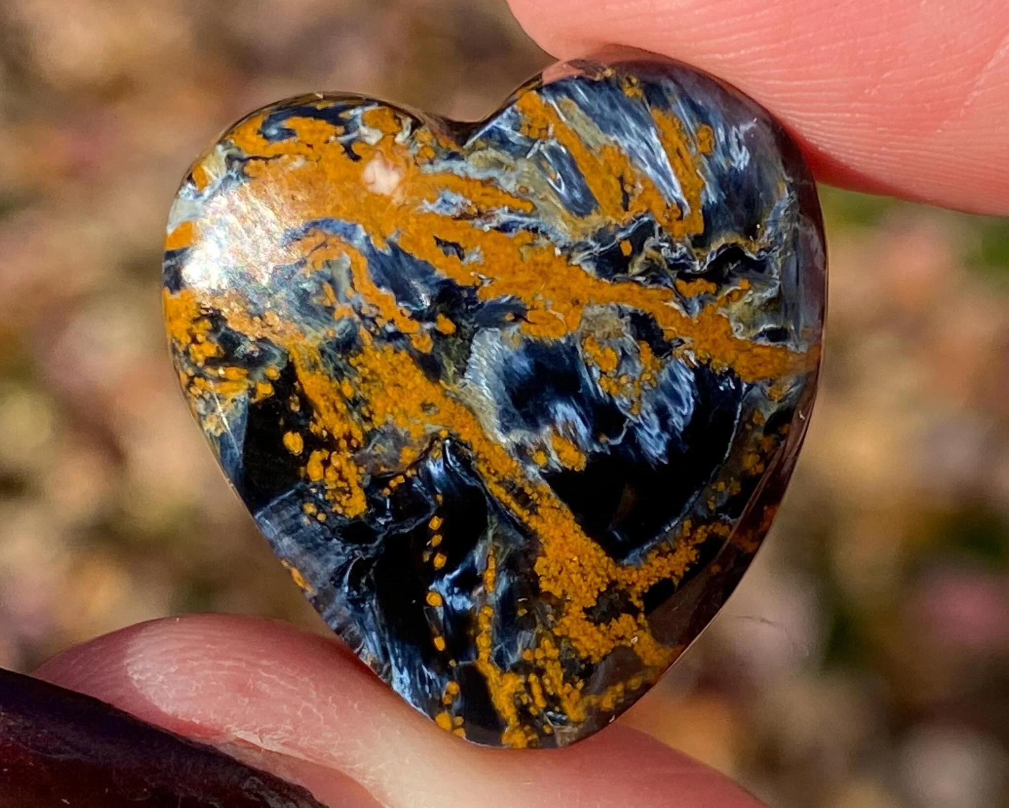 This is a lovely heart cabochon made of Pietersite. Pietersite is a rare form of brecciated TIgers Eye, where the blue and gold chatoyant bits are chaotic rather than arranged in stripes. This is a fabulous piece, beautifully polished all the way around into a heart cabochon with a flat back. Both sides are worthy of display. Absolutely gorgeous!