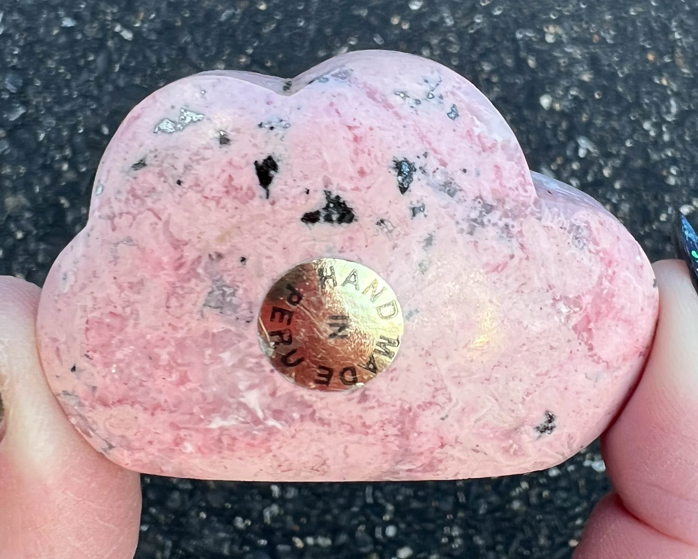 This is a little cloud carved from Rhodochrosite. It has beautiful pink color with some shiny black Manganese and a bit of clear Quartz. It is self standing and very cute!