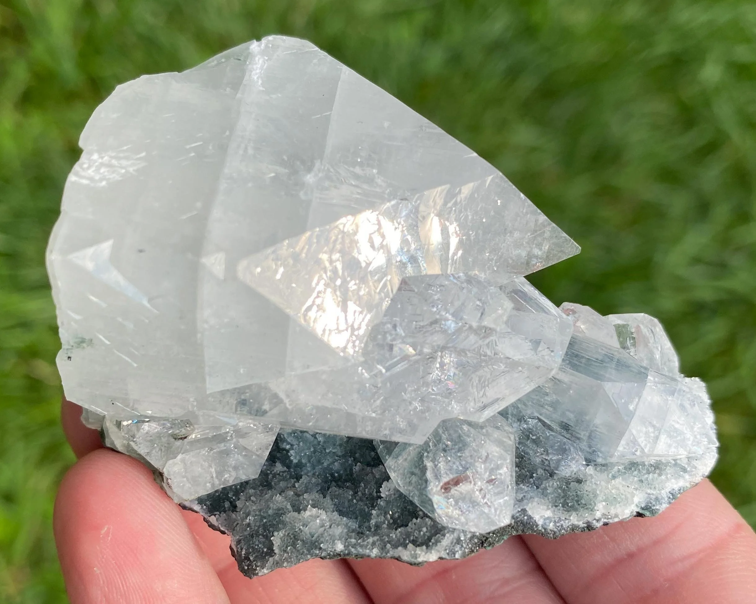This is a lovely piece with pointed Apophyllite crystals on a bed of Quartz coated light blue Chalcedony. Dreamy coloring and a nice size for display. Lots of little rainbows too! :)