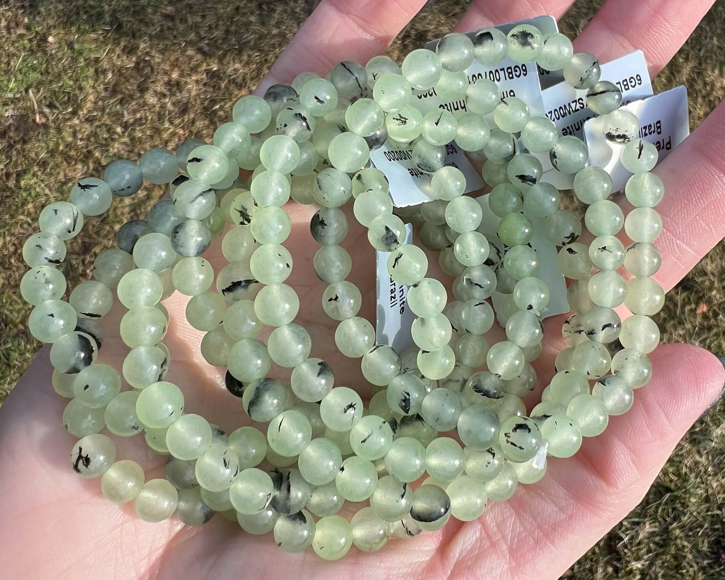 These lovely bracelets are stretchy with 6mm, round Prehnite and Epidote beads on white stretchy string. They measure about 7 inches long with no clasp or opening for easy on and off! Beautiful natural crystal beads that are a glowy light green with dark green inclusions of Epidote. Perfect for layering or by itself.