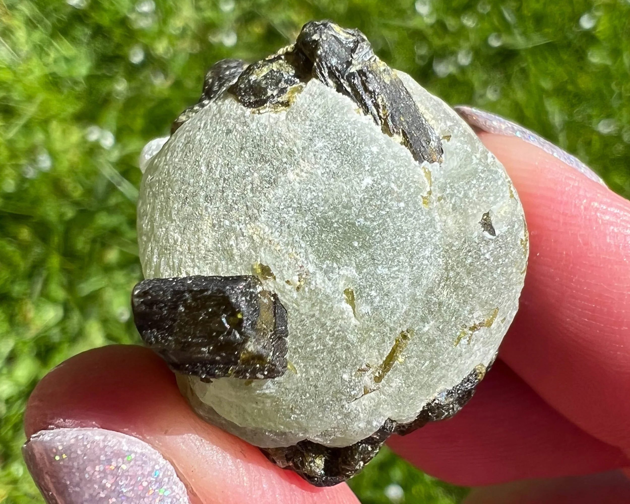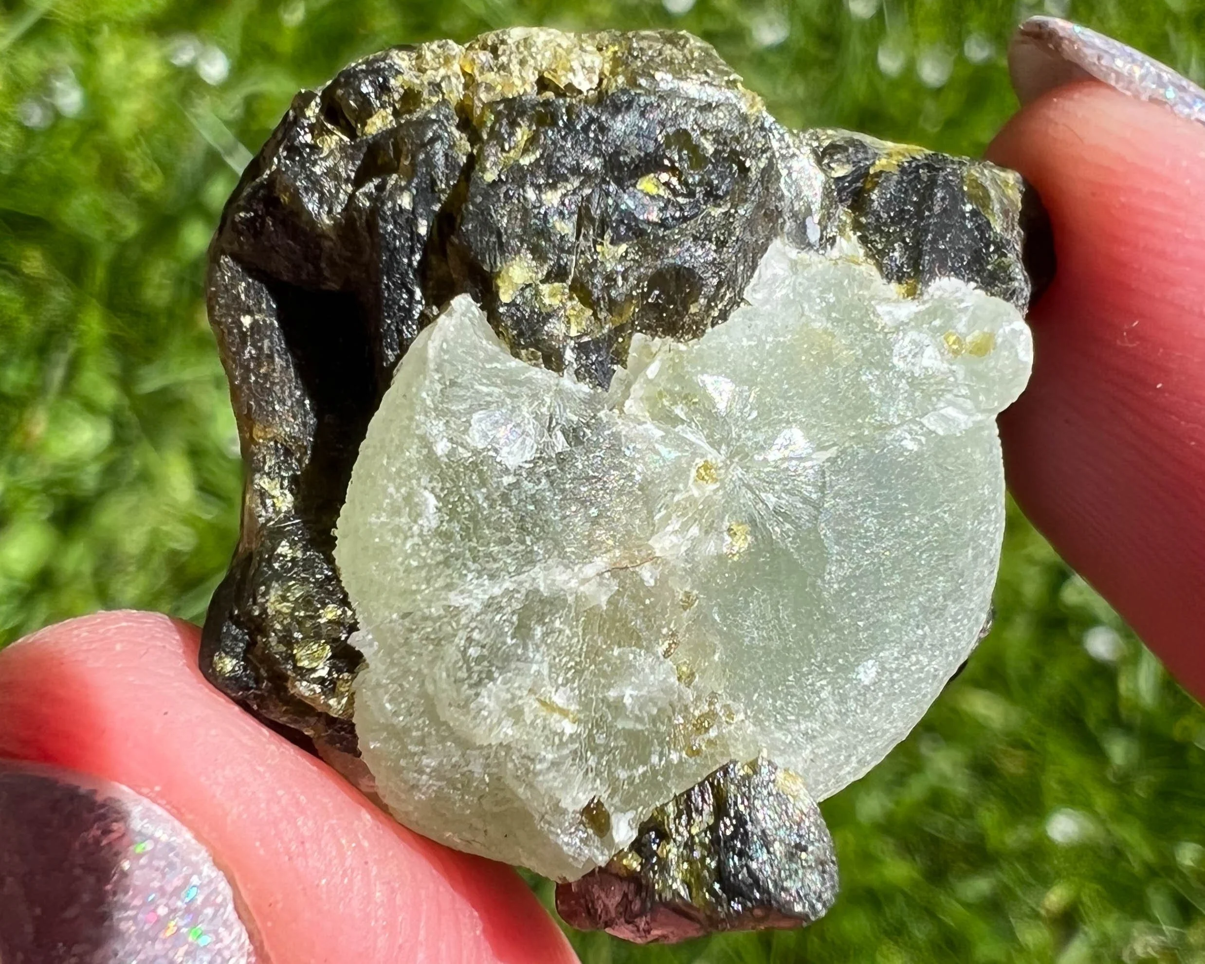 Prehnite is often used for dreaming, lucid dreaming, and a stronger connection to all things spiritual and metaphysical. Epidote is thought to boost or enhance the power of prehnite as an inclusion.