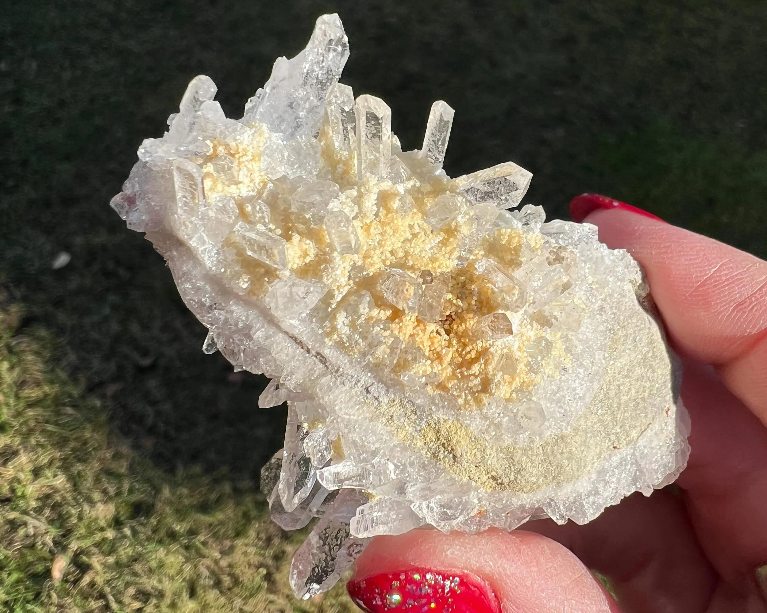 This clear Quartz cluster is beautiful with very good clarity and lustrous crystals with nice striations on them. It is double sided with water clear optical Quartz crystals on top and bottom- very cool! Nice aesthetic formation! From Colombia. Very beautiful high quality piece <3