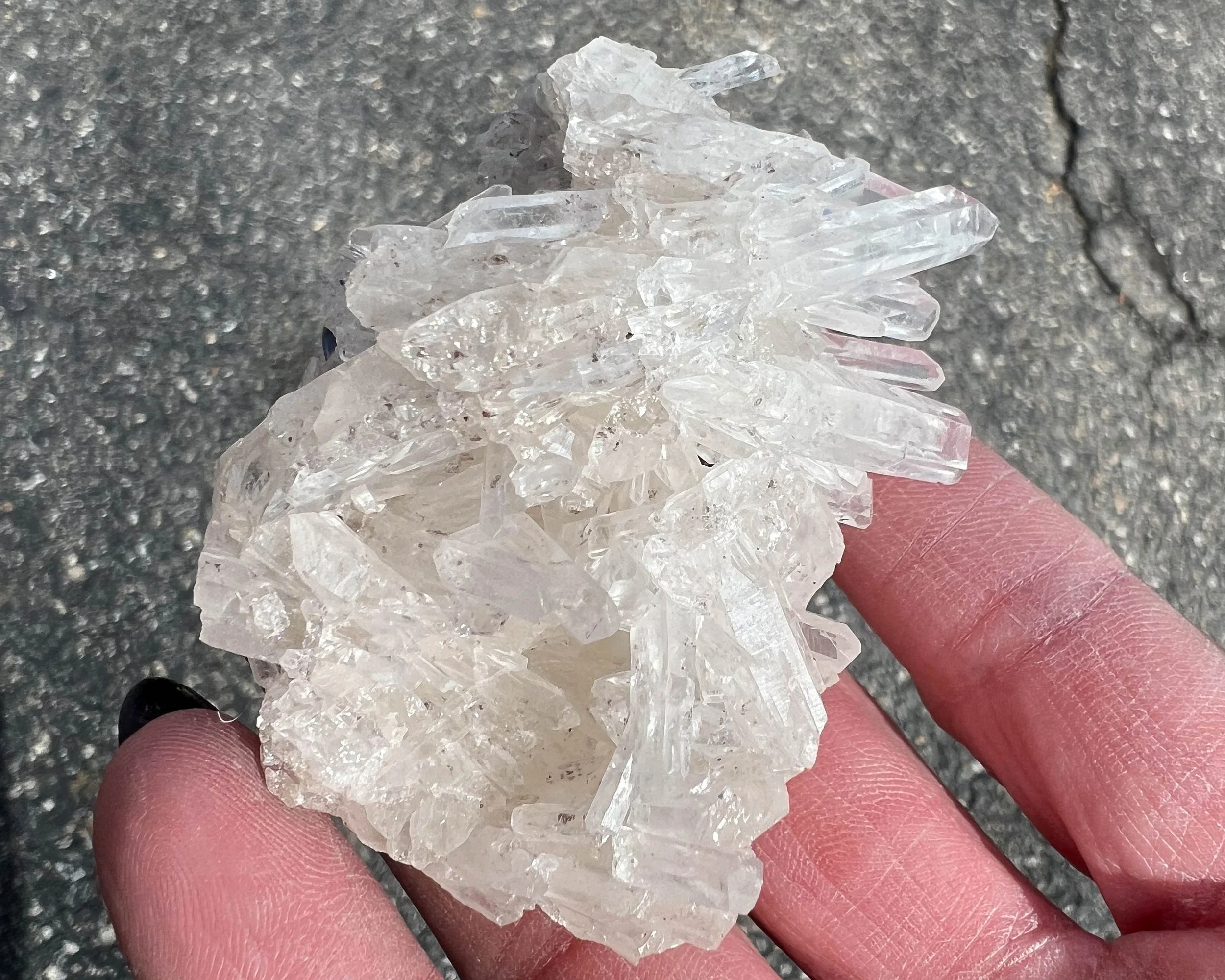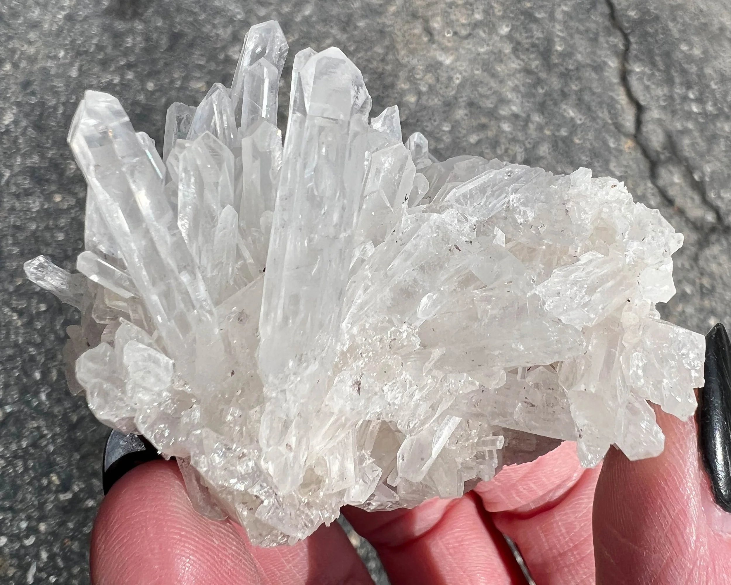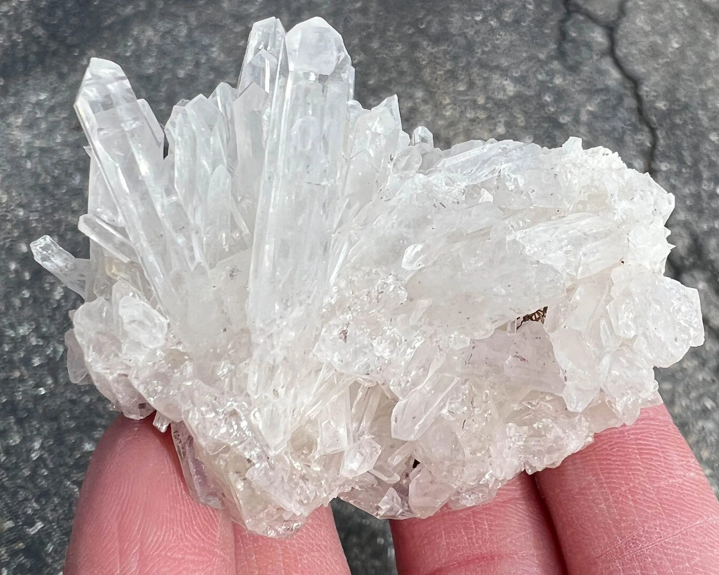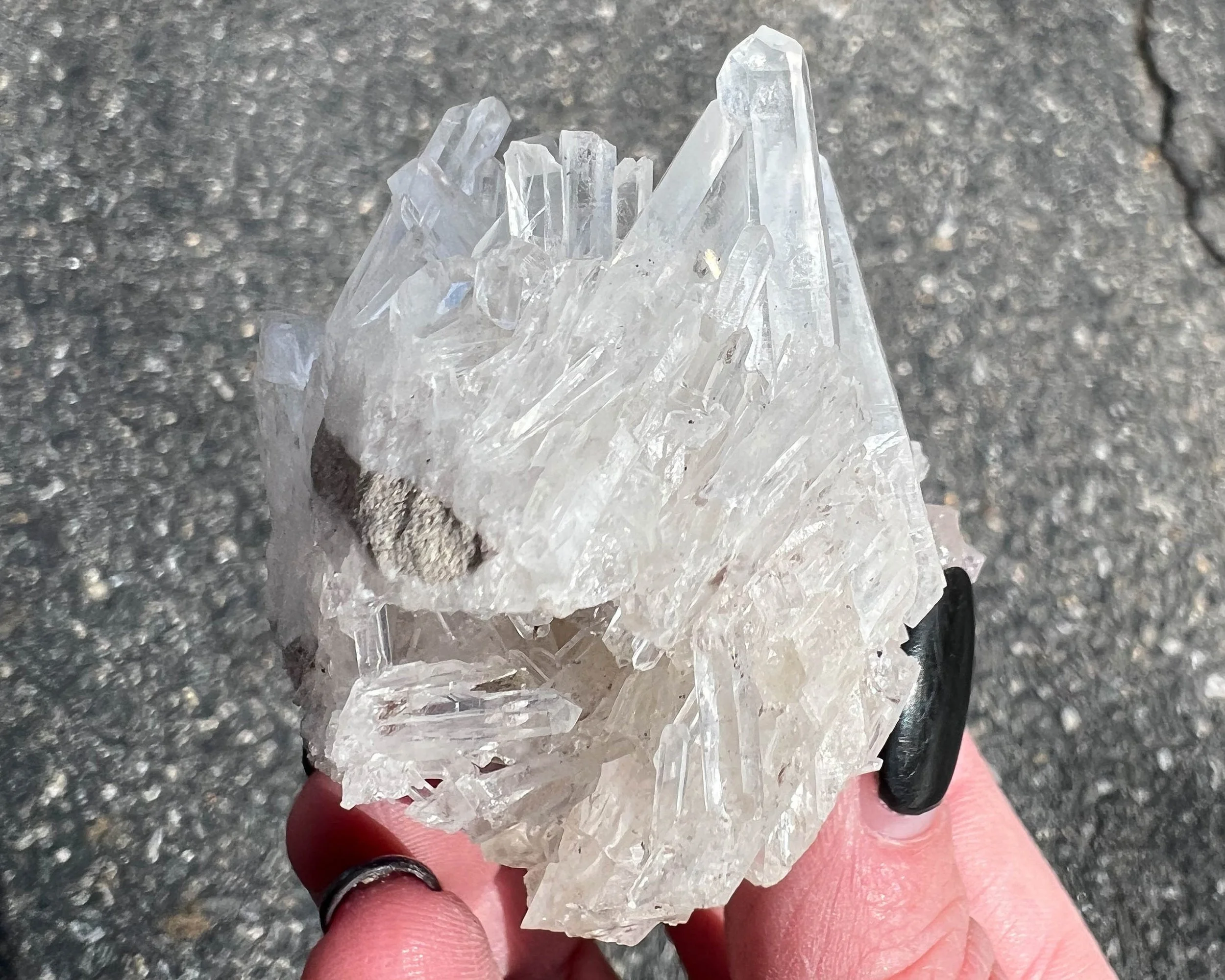 This is a funky small clear Quartz cluster from Columbia. It has crystals going all the way around it so it could be displayed from several different sides. Quartz points going every which way! Its very fun but also small and cute. It has nice clarity, and is a good looking little cluster.