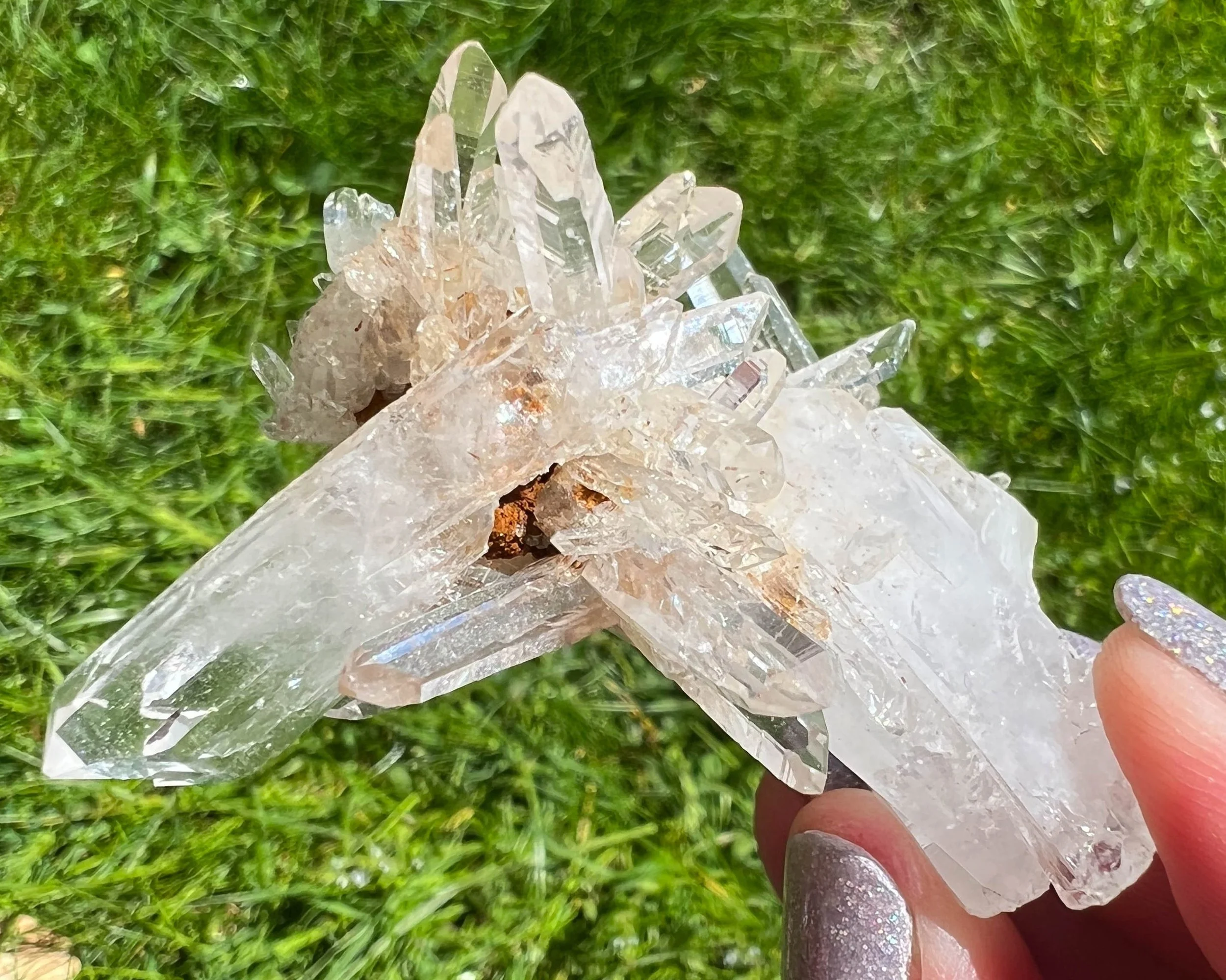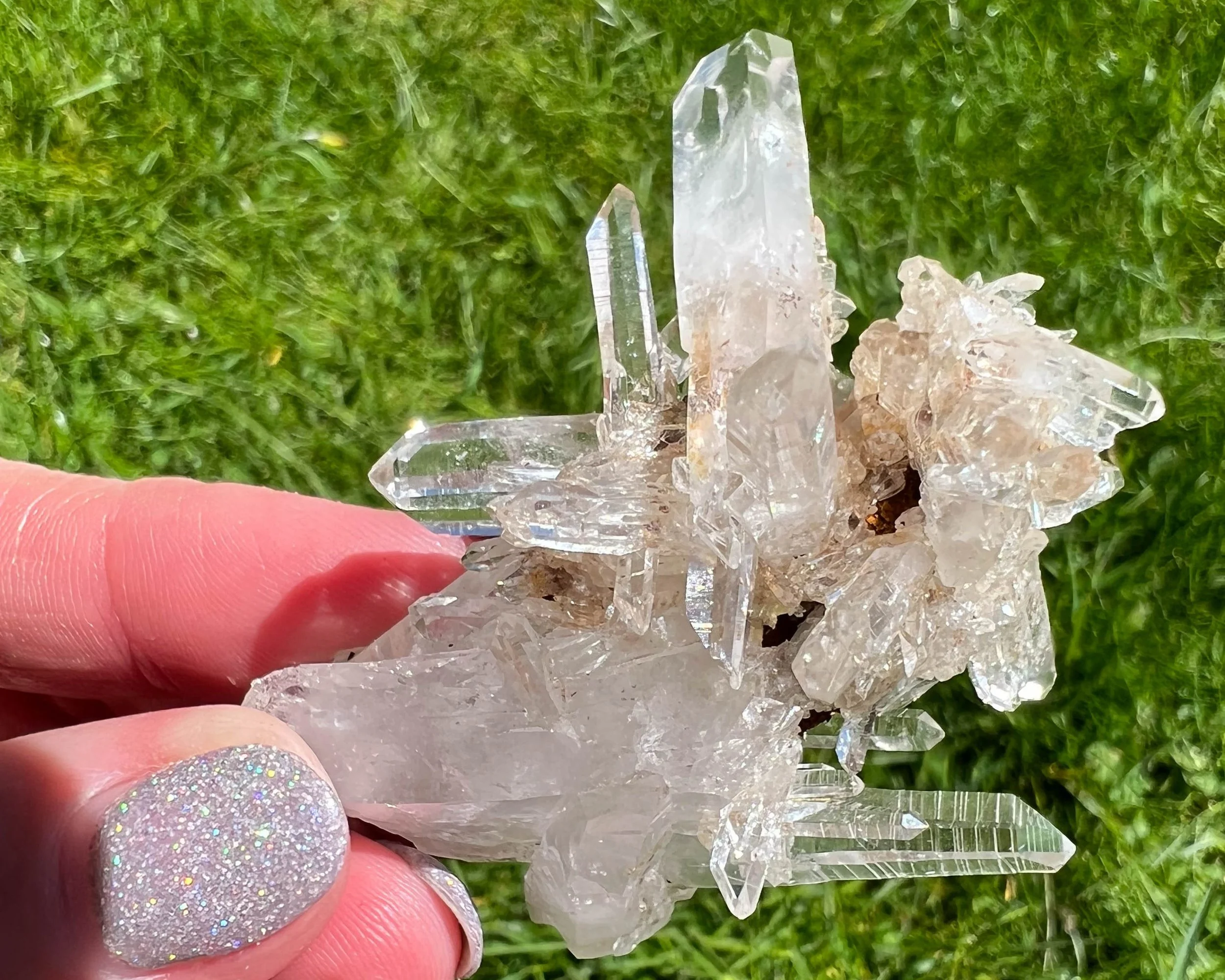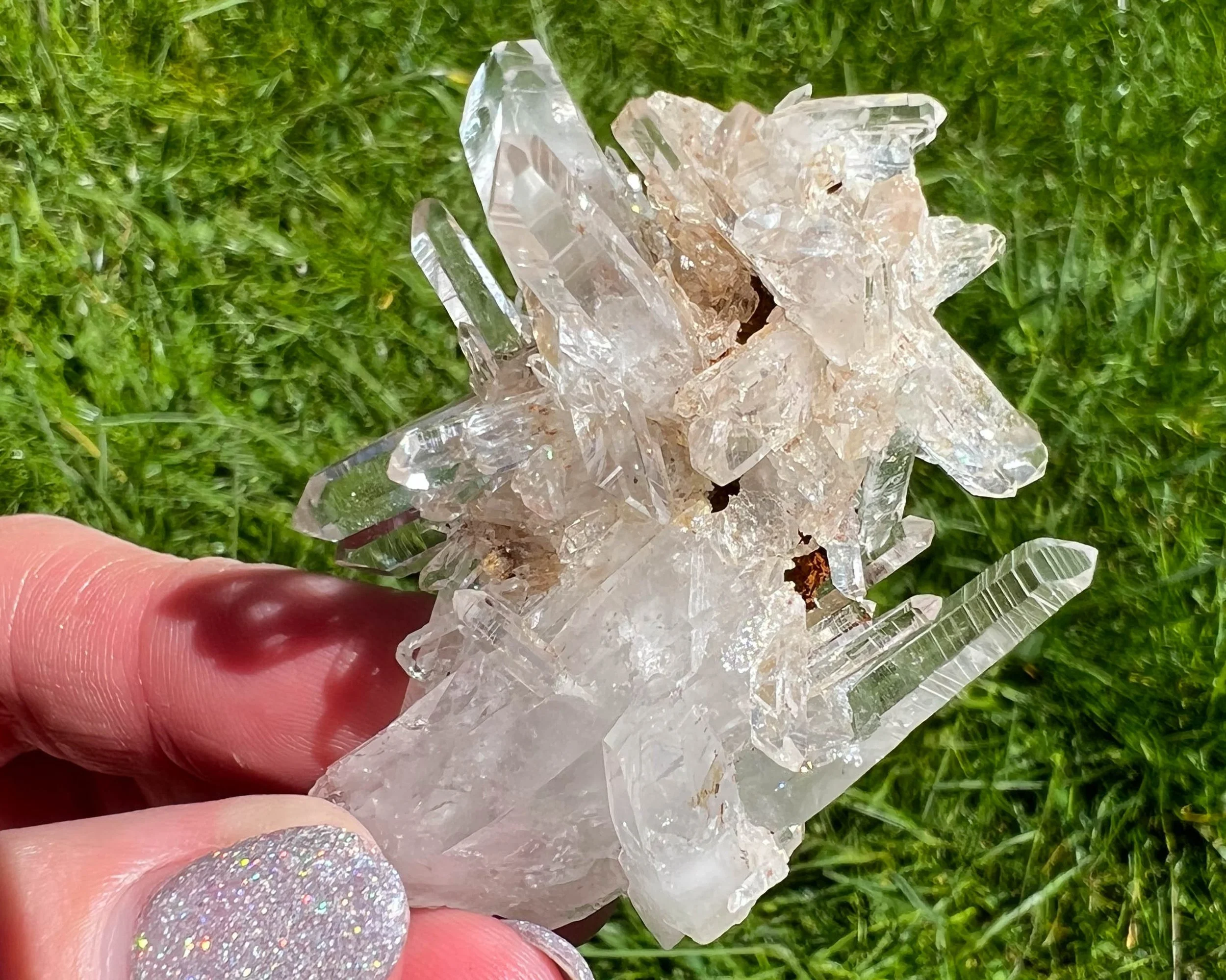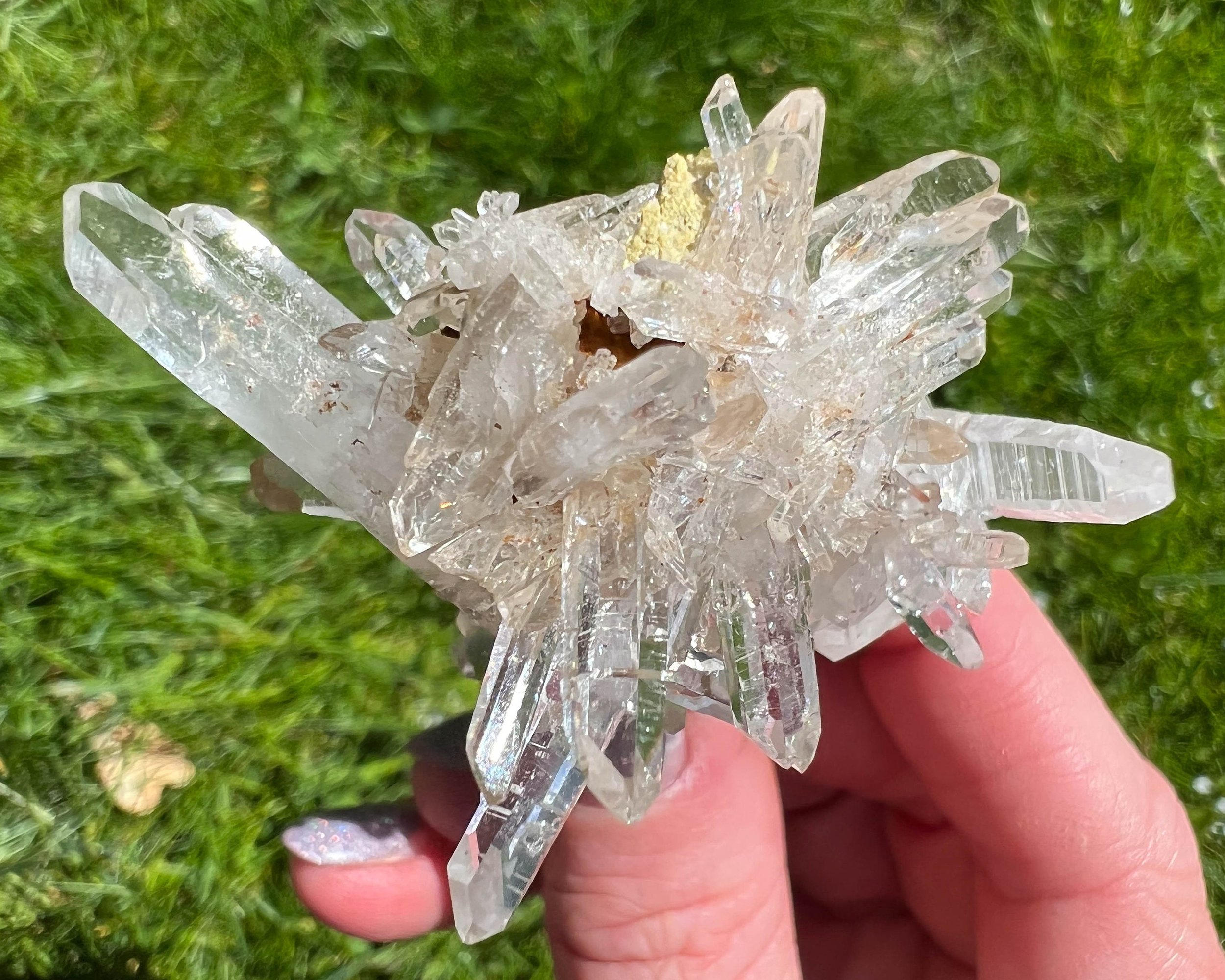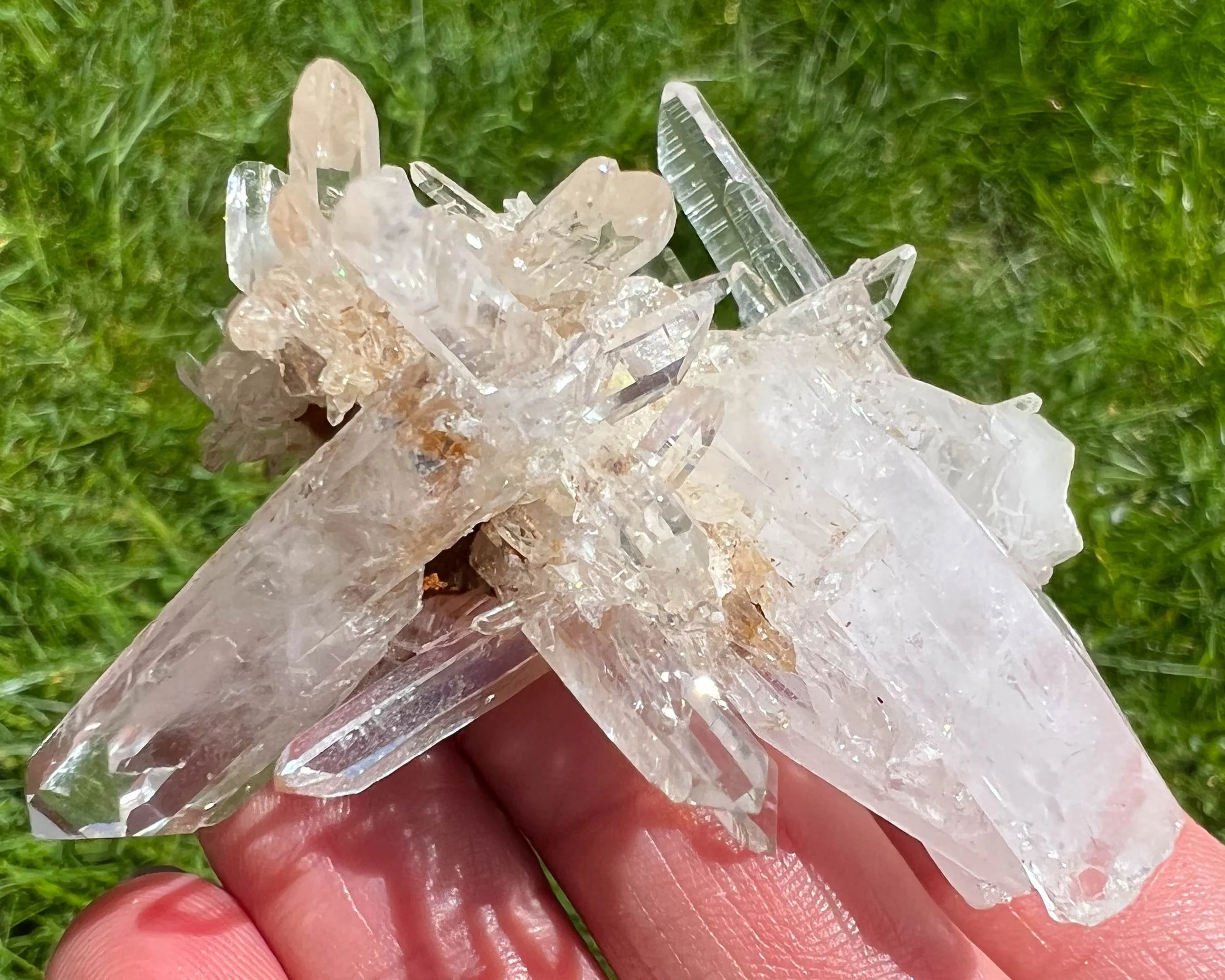 This is a funky small clear Quartz cluster from Colombia / Colombia. It has crystals going all the way around it so it could be displayed from several different sides. Quartz points going every which way! Its very fun but also small and cute. It has nice optical clarity in many of the crystals, and is a good looking little cluster.
