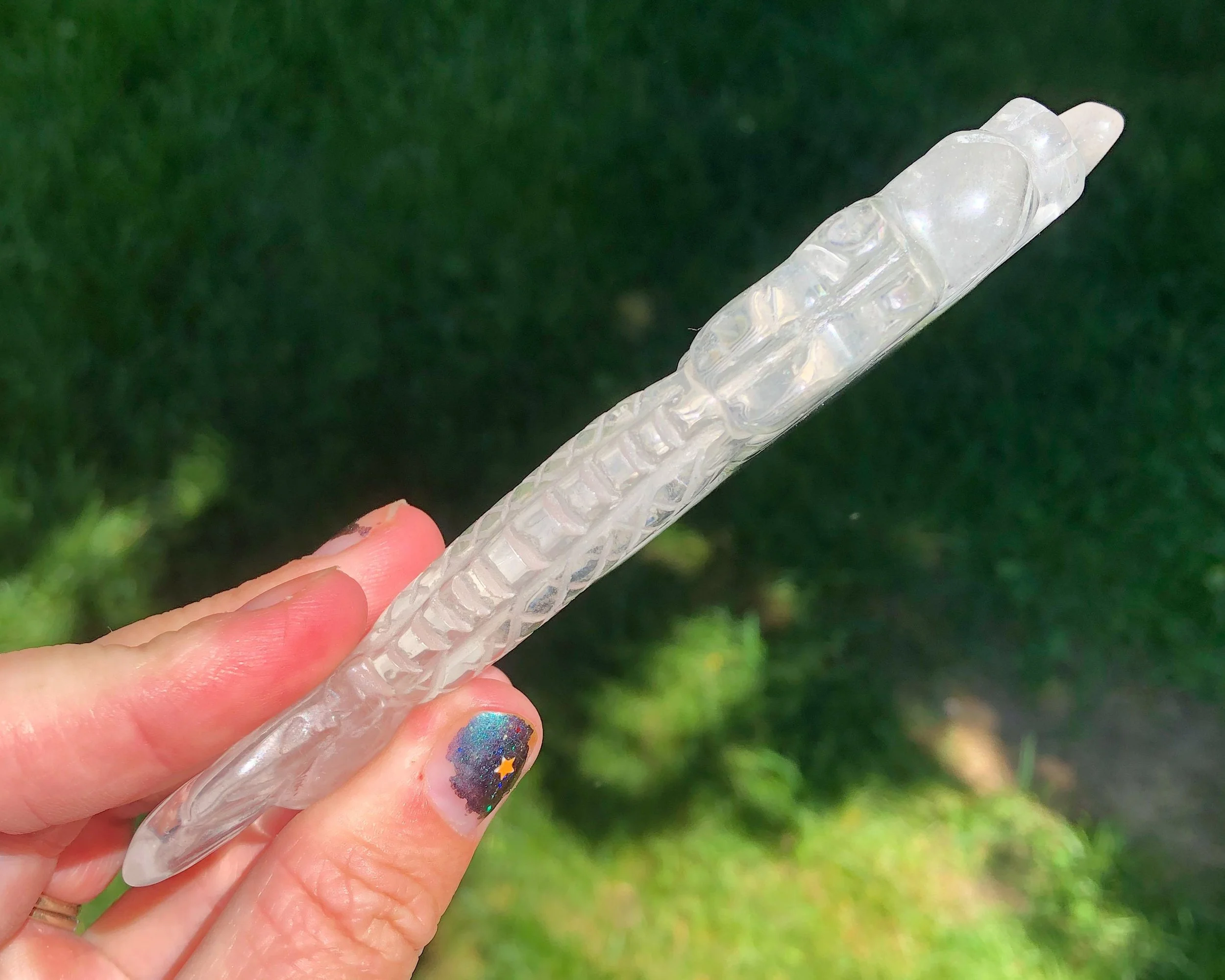 This is a clear Quartz carving of an axe with a dragon as the handle. The dragon has nice details including a face, scales, horns etc. There are holes drilled in his mouth that can be used to hang the axe and they are not very noticeable if you prefer not to use them. I didn't even notice them for a couple weeks. This is a really beautiful piece and feels very sturdy too.