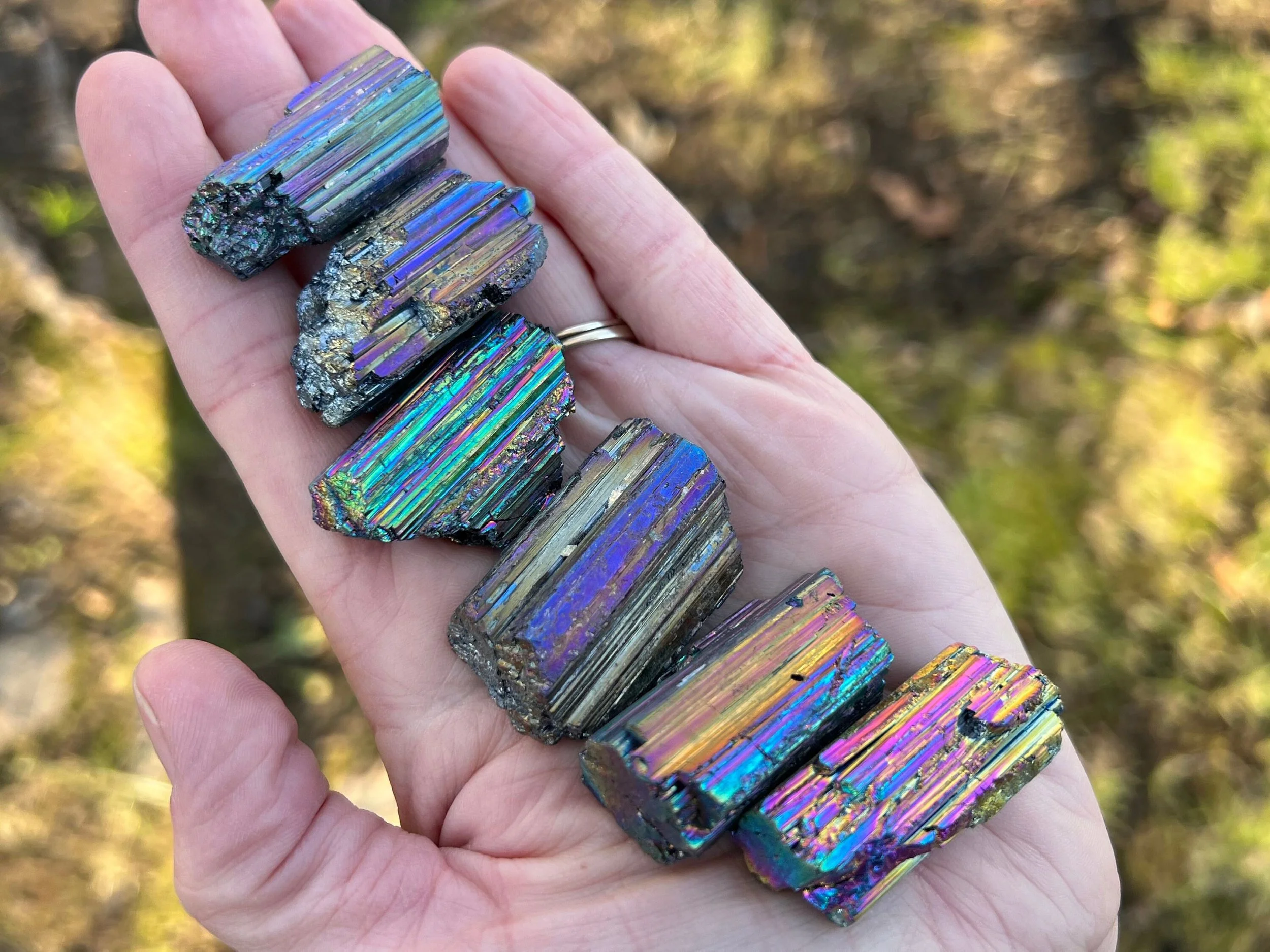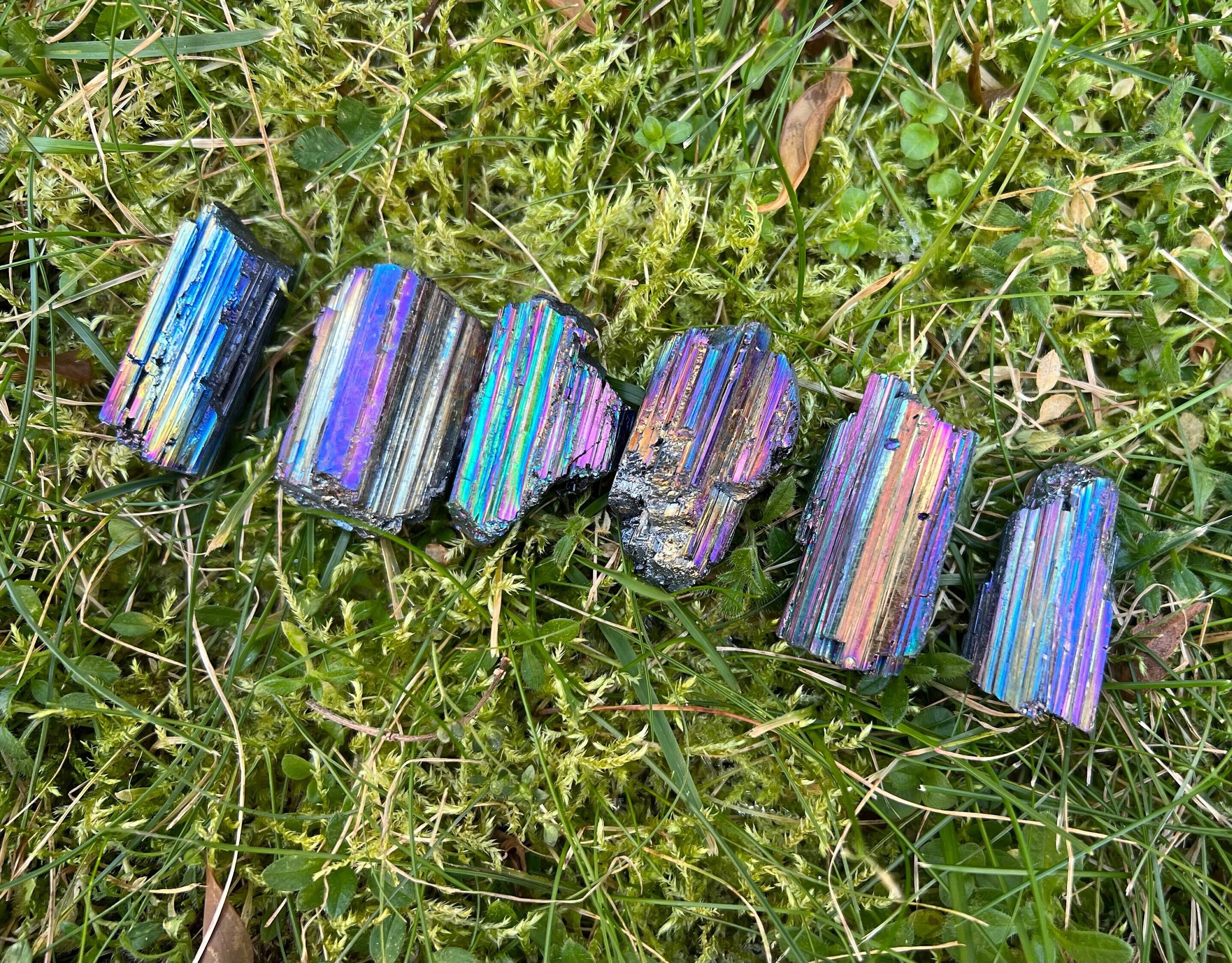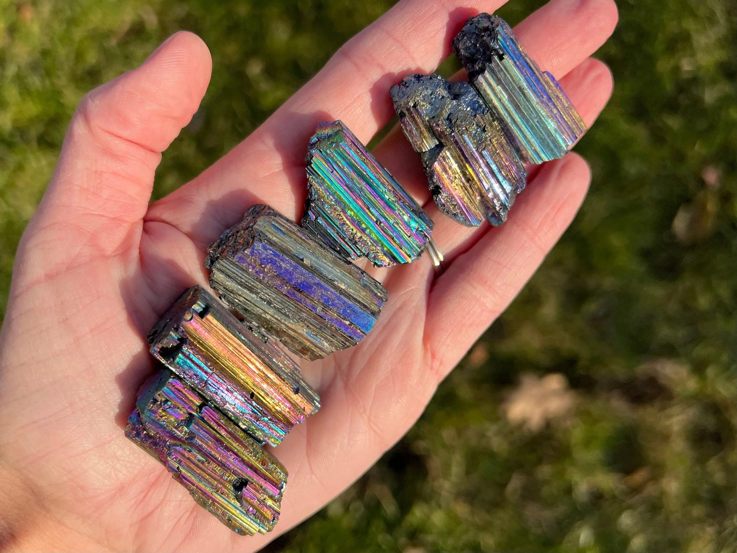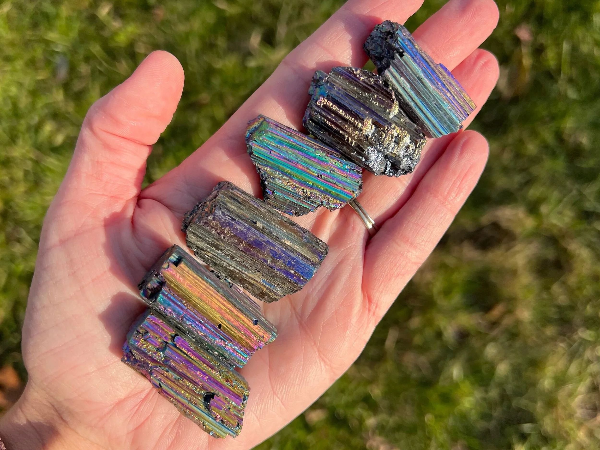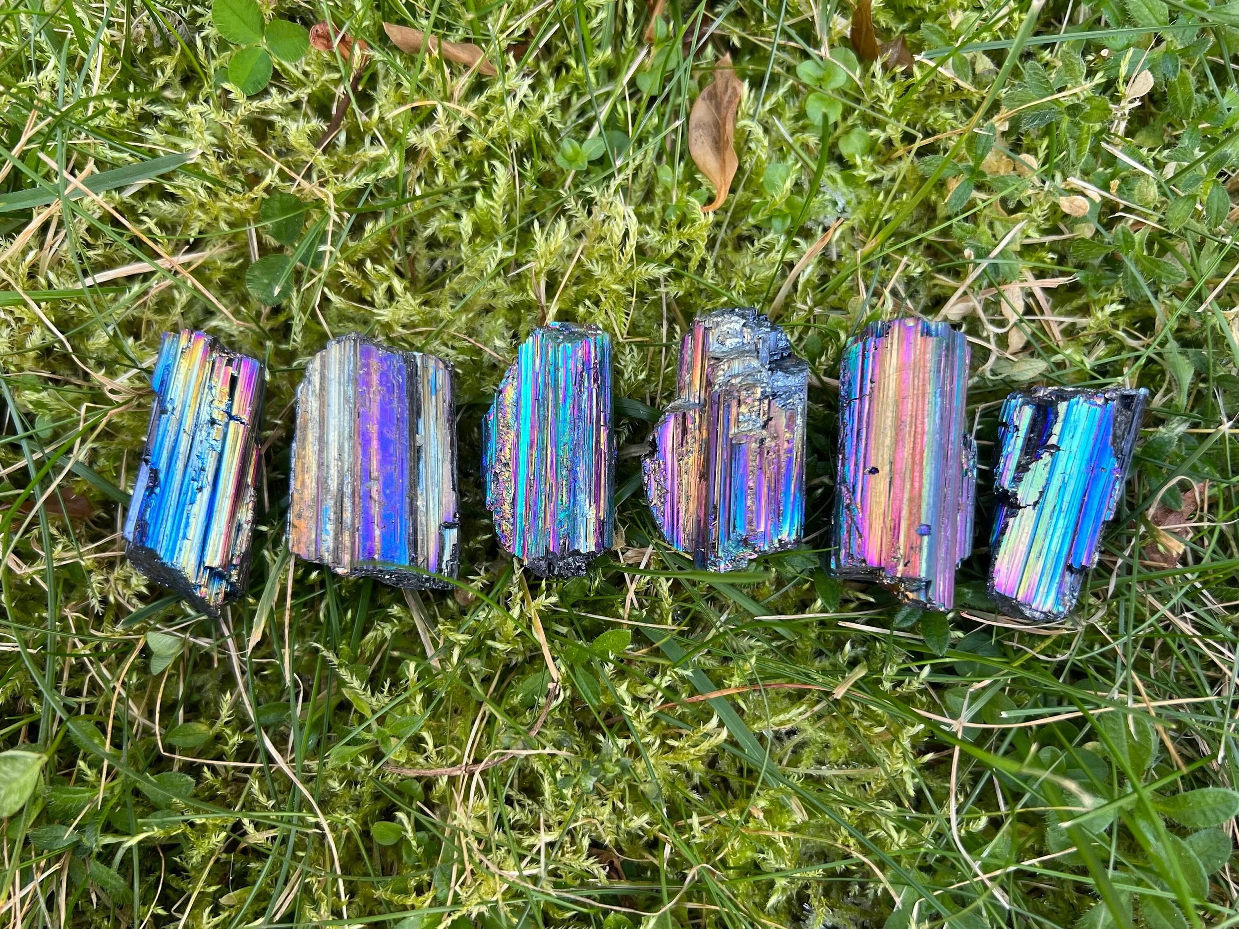 Rainbow Aura Black tourmaline is natural Black Tourmaline that has been treated with precious metals to give it an iridescent, rainbow effect that shifts with the light. These are treateed with Titanium and the rainbows are very bright and bold