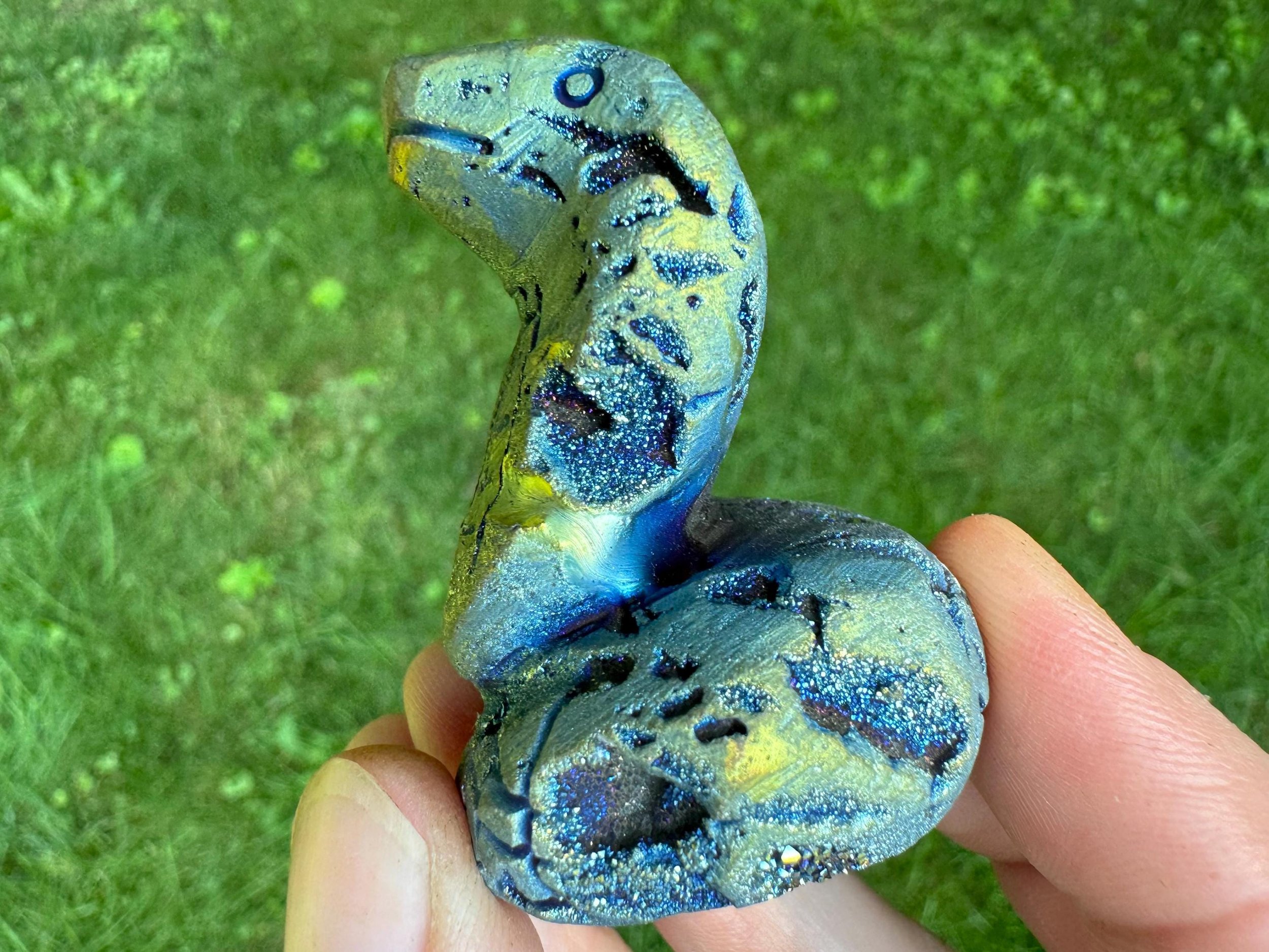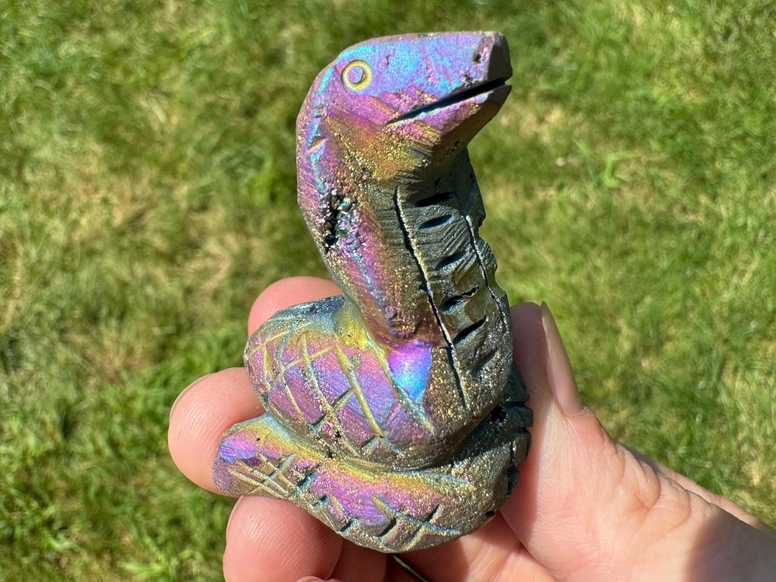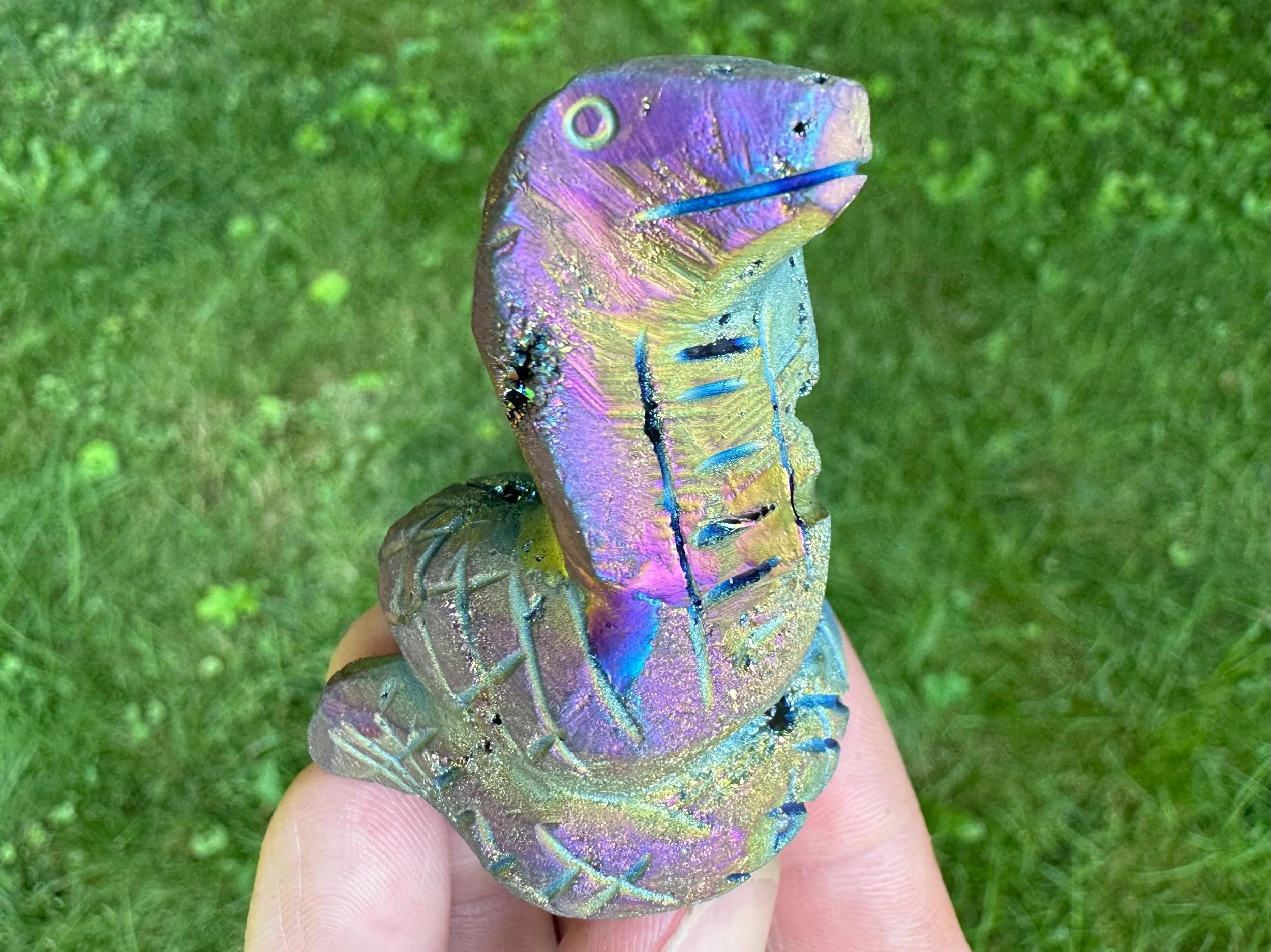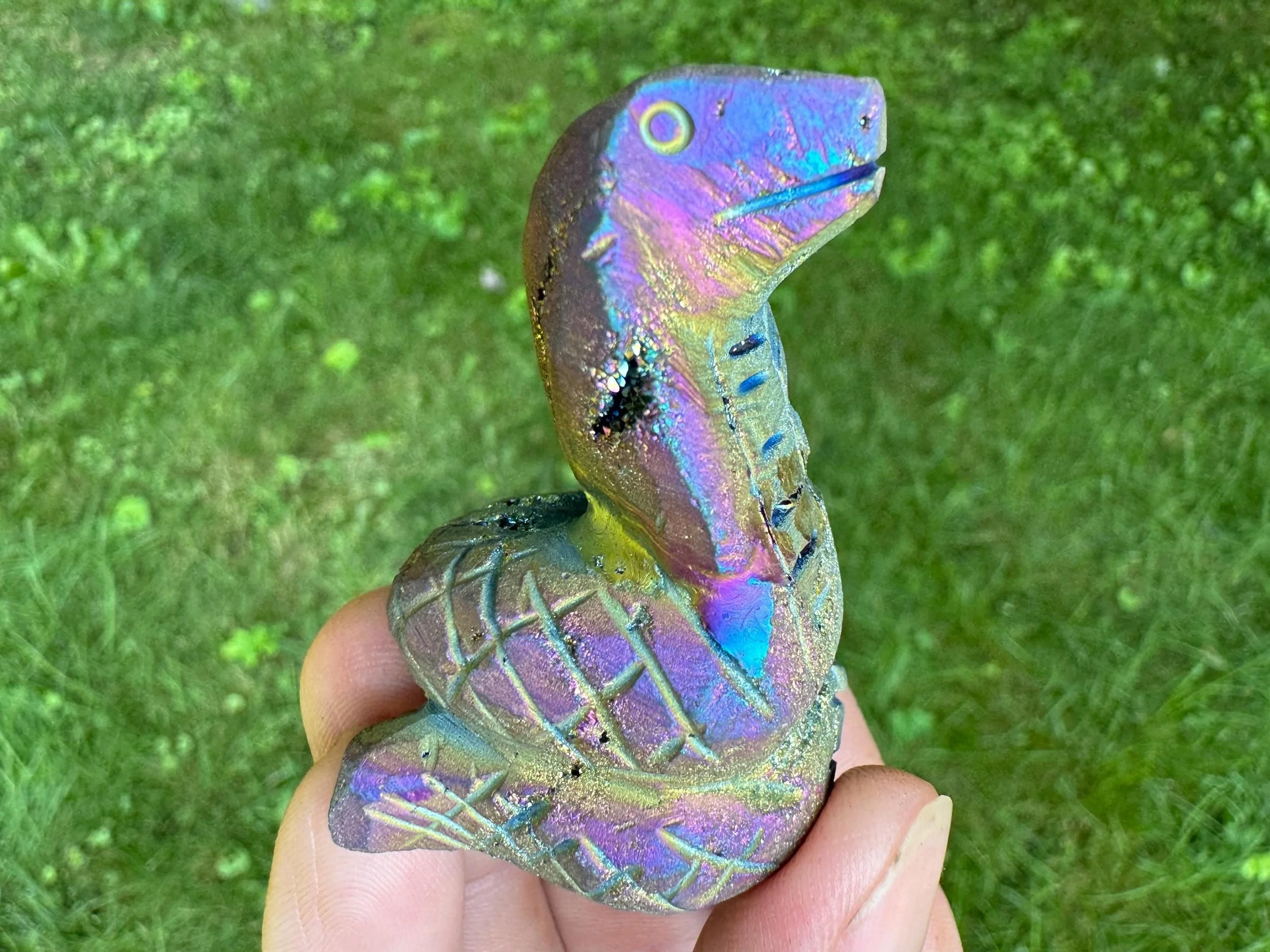 This is a gorgeous snake figurine carved from white Quartz geode with sparkly druzy Quartz pockets all over! It is coated in rainbow aura which makes it iridescent rainbow colored - the colors shift with the light as you move it around! It is a hooded type of snake like a cobra. It is sparkly and colorful and fabulous!