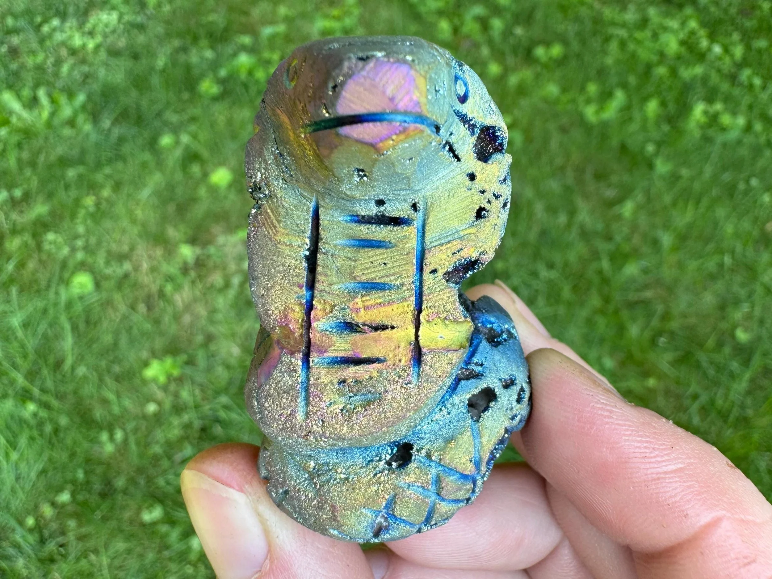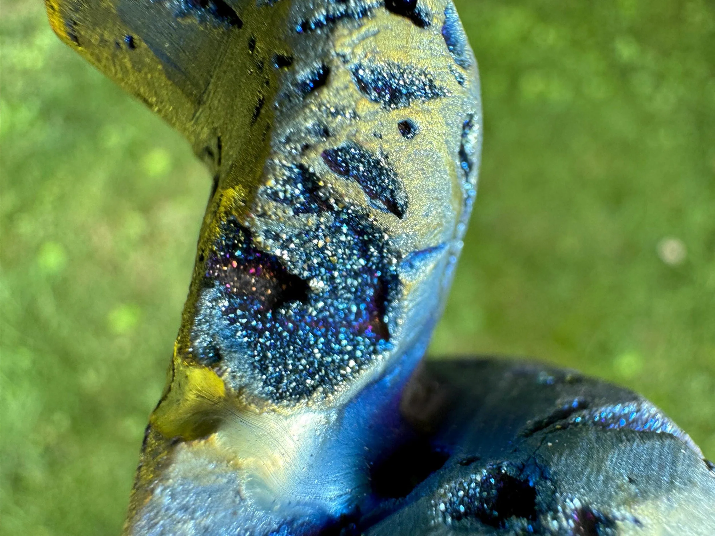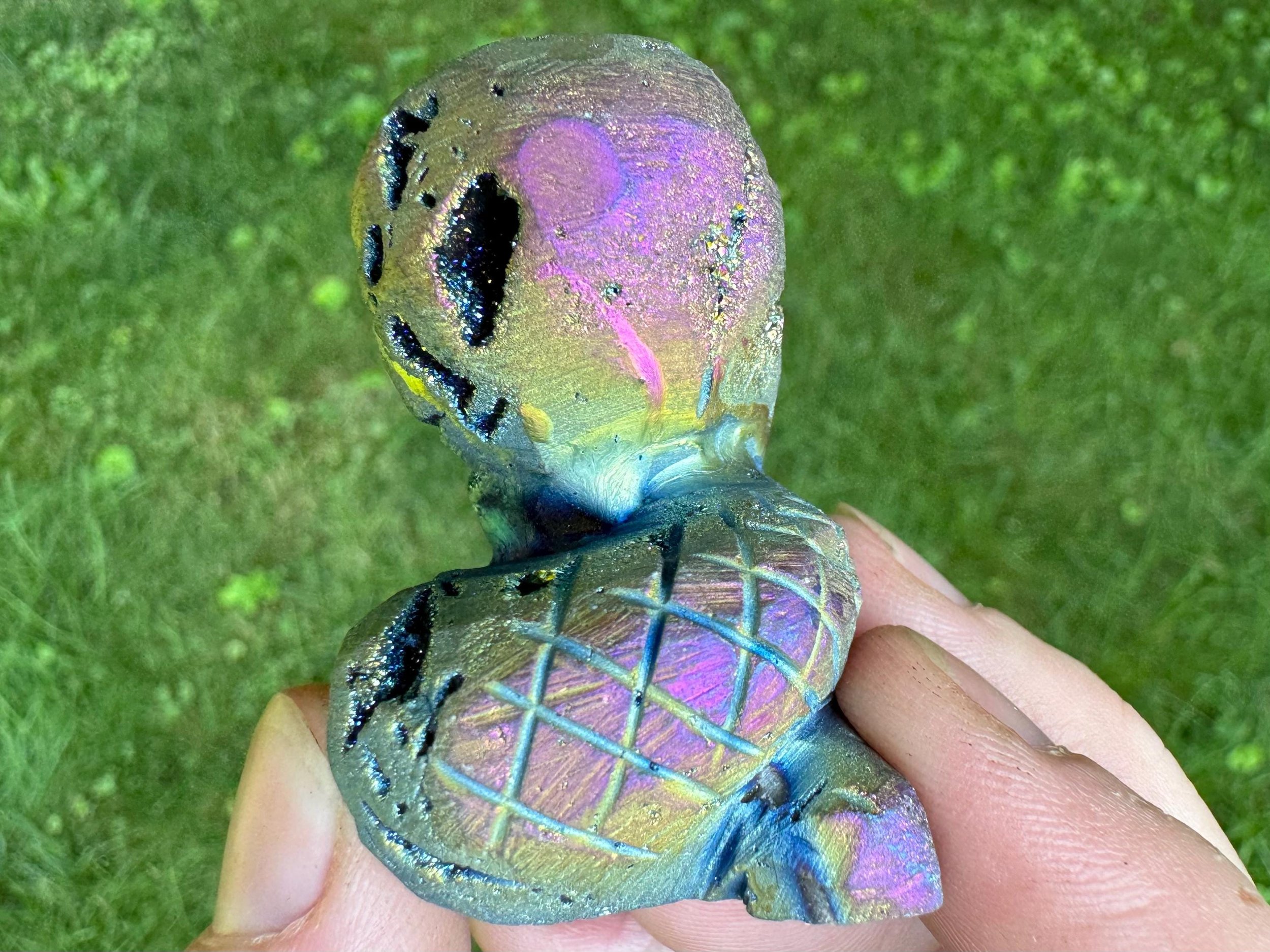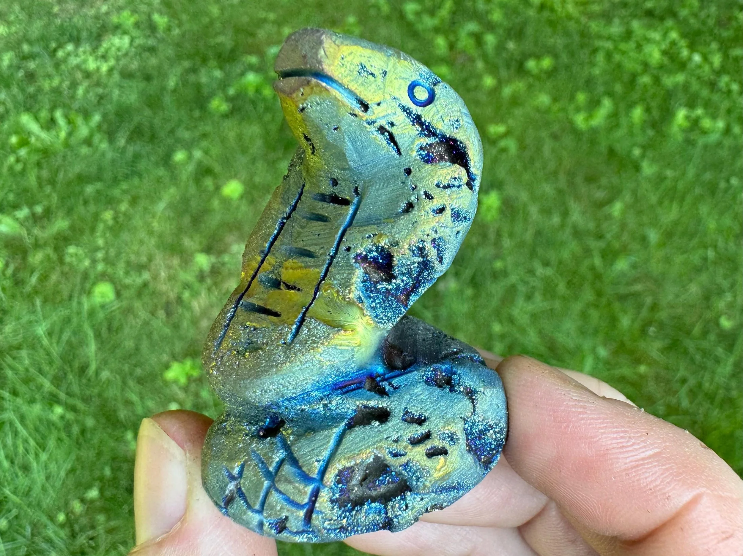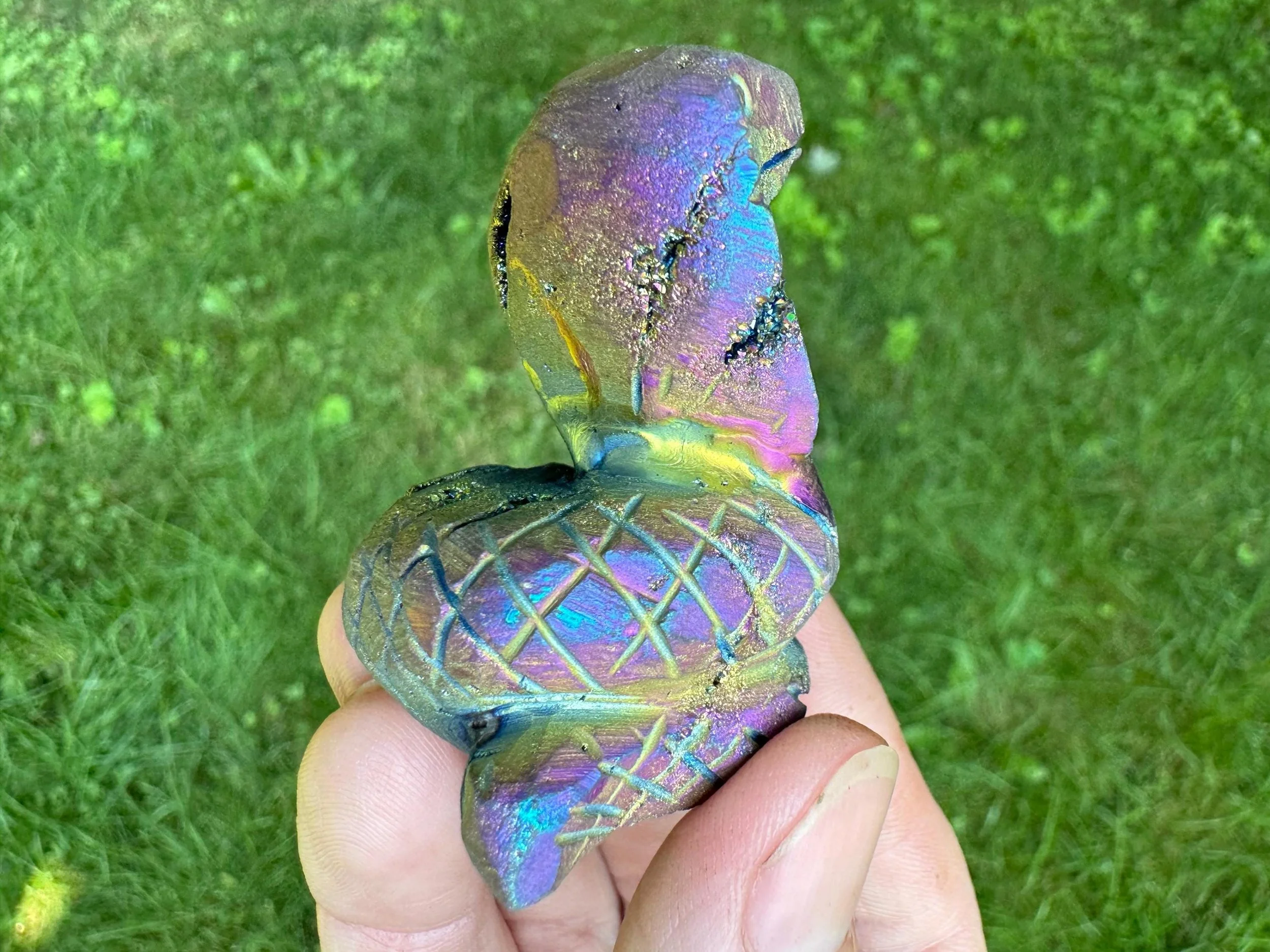 This is a gorgeous snake figurine carved from white Quartz geode with sparkly druzy Quartz pockets all over! It is coated in rainbow aura which makes it iridescent rainbow colored - the colors shift with the light as you move it around! It is a hooded type of snake like a cobra. It is sparkly and colorful and fabulous!