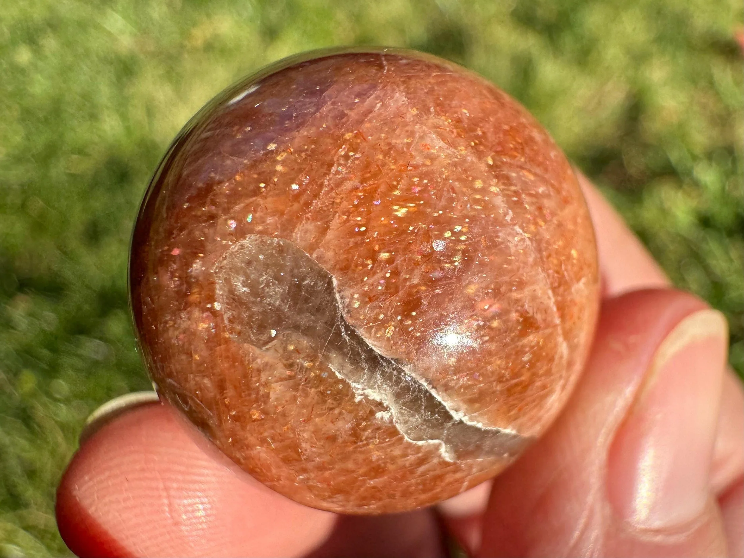 This is a gorgeous little sphere of high quality Rainbow Confetti Sunstone and Moonstone. This Sunstone is an Orthoclase feldspar with lots of sparkly rainbow Hematite plate inclusions. It also has Adularescence - a silvery blue sheen or flash that moves in the light making it a Moonstone. It also has Smoky Quartz and a translucent green crystal (it looks closer to black in the photos, more green in person when the sunlight hits it - very pretty!). These are really fabulous little spheres if you like flashy crystals with rainbows and sparkles! :)