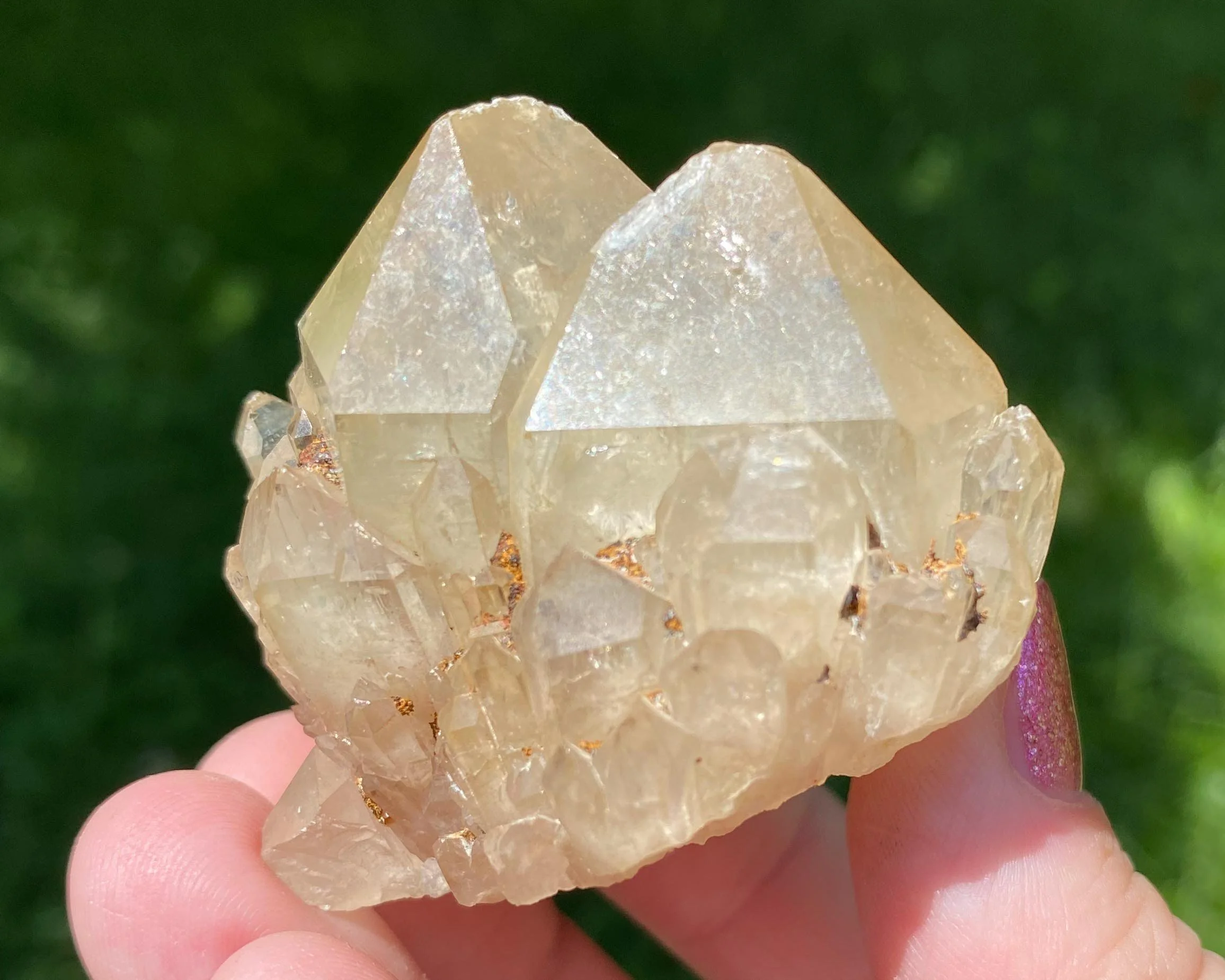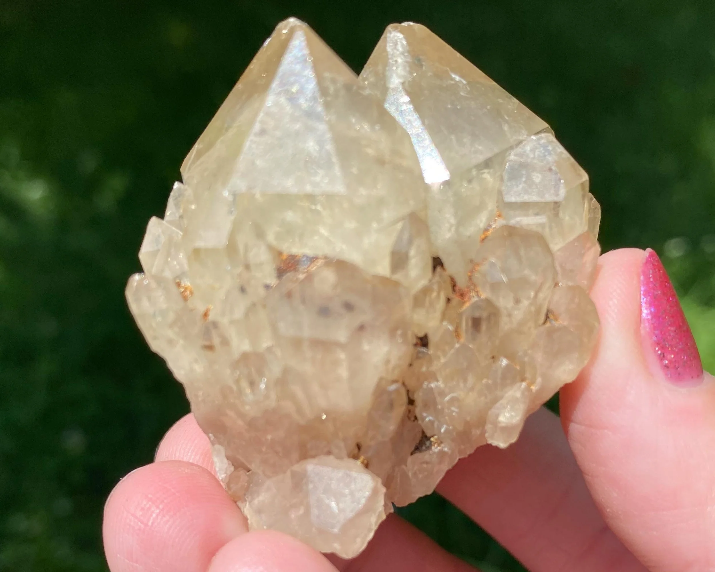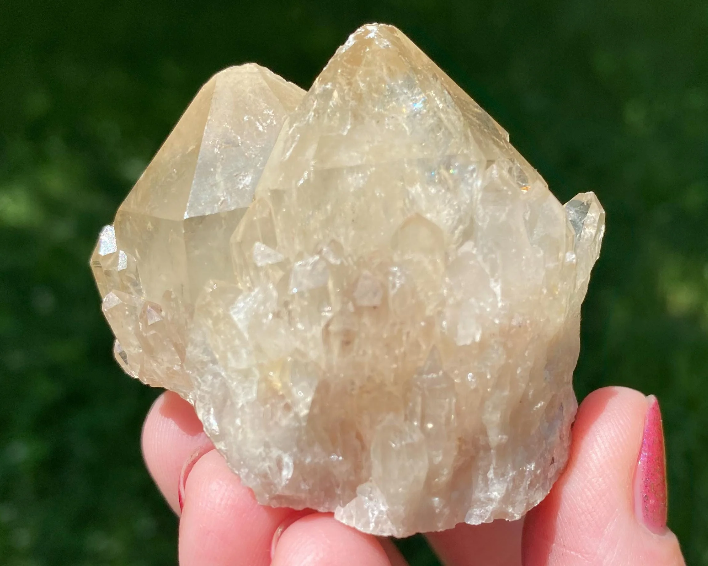 This is a rare natural Smoky Citrine crystal with the "Cathedral" formation, with a large main point and little ones around the side of it. This Citrine has a beautiful light yellow honey color that gives you a warm, sunny feeling all over <3 These are increasingly rare and found only in the Congo Republic.
