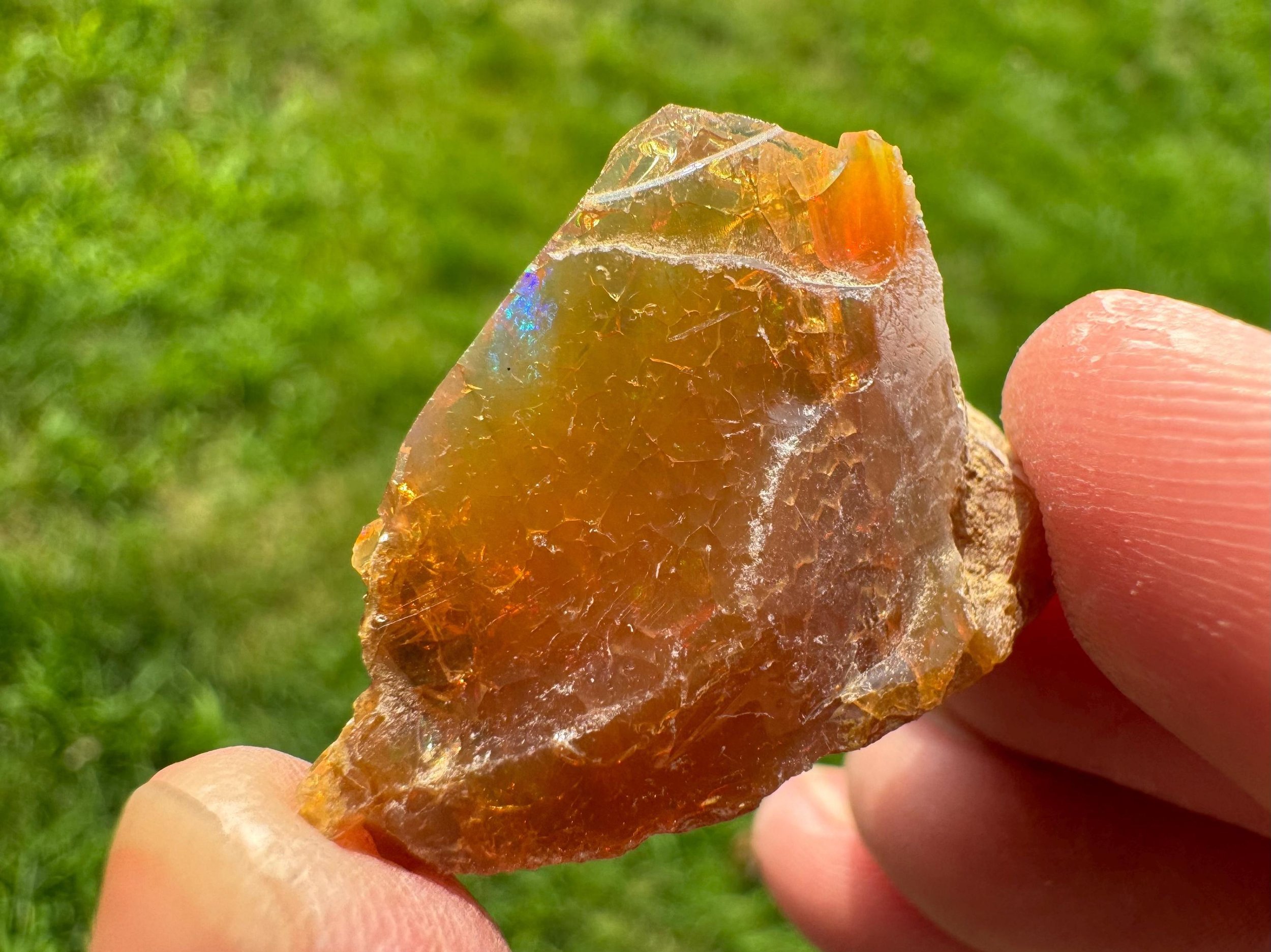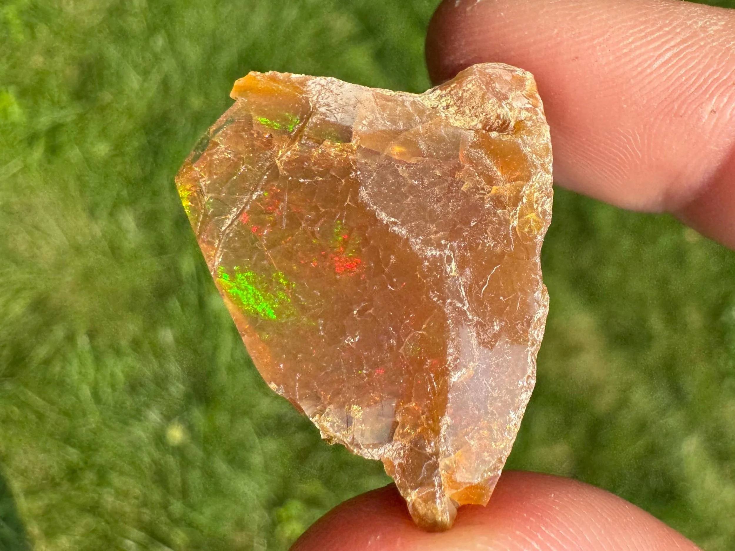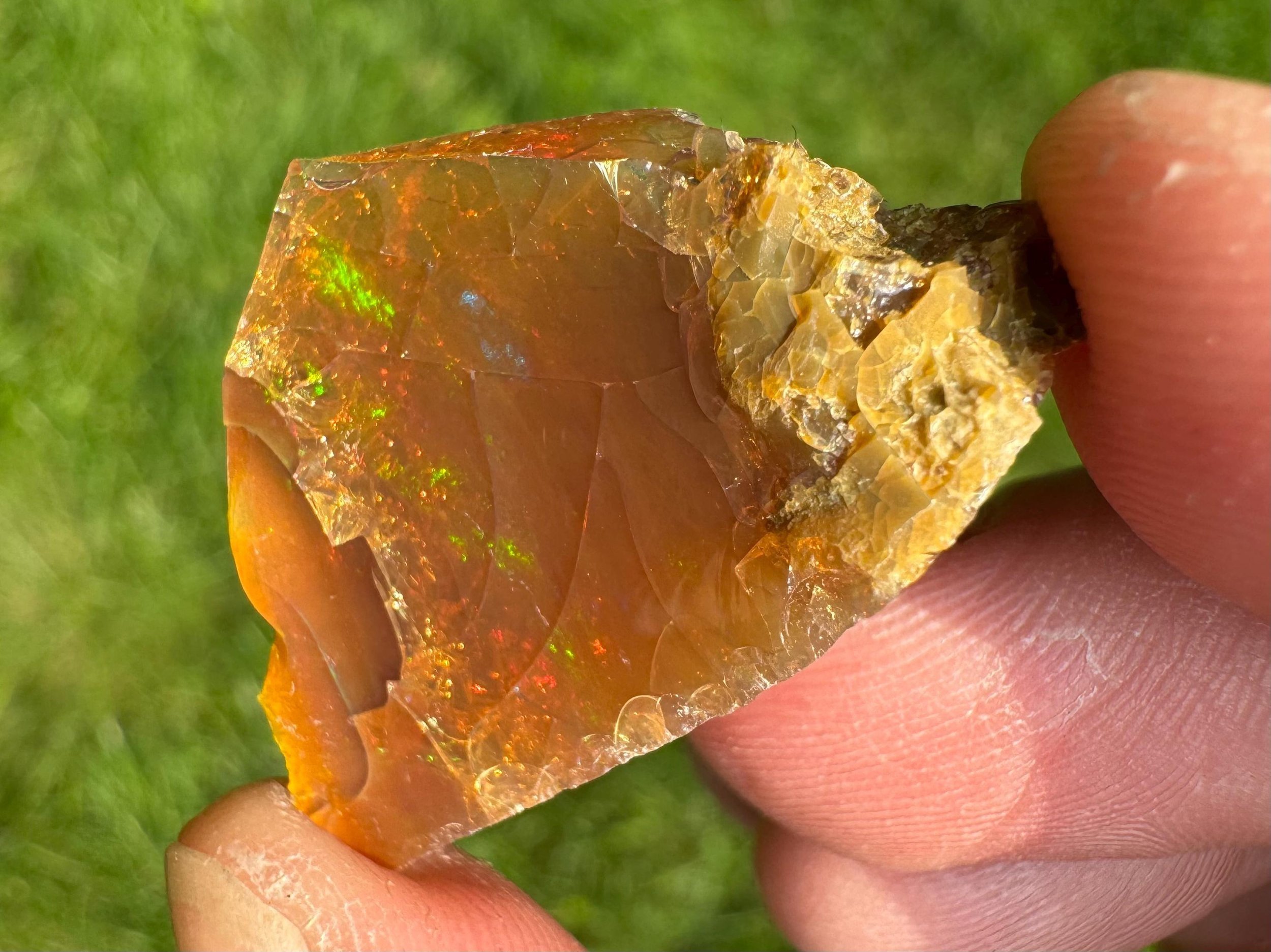 This is a flashy, rough Ethiopian chocolate Welo Opal. Also called a raw brown opal. It is a raw opal with full, bright rainbow flash all over. Very flashy opal and much better in person! When backlit it is translucent to transparent with a warm honey amber color.