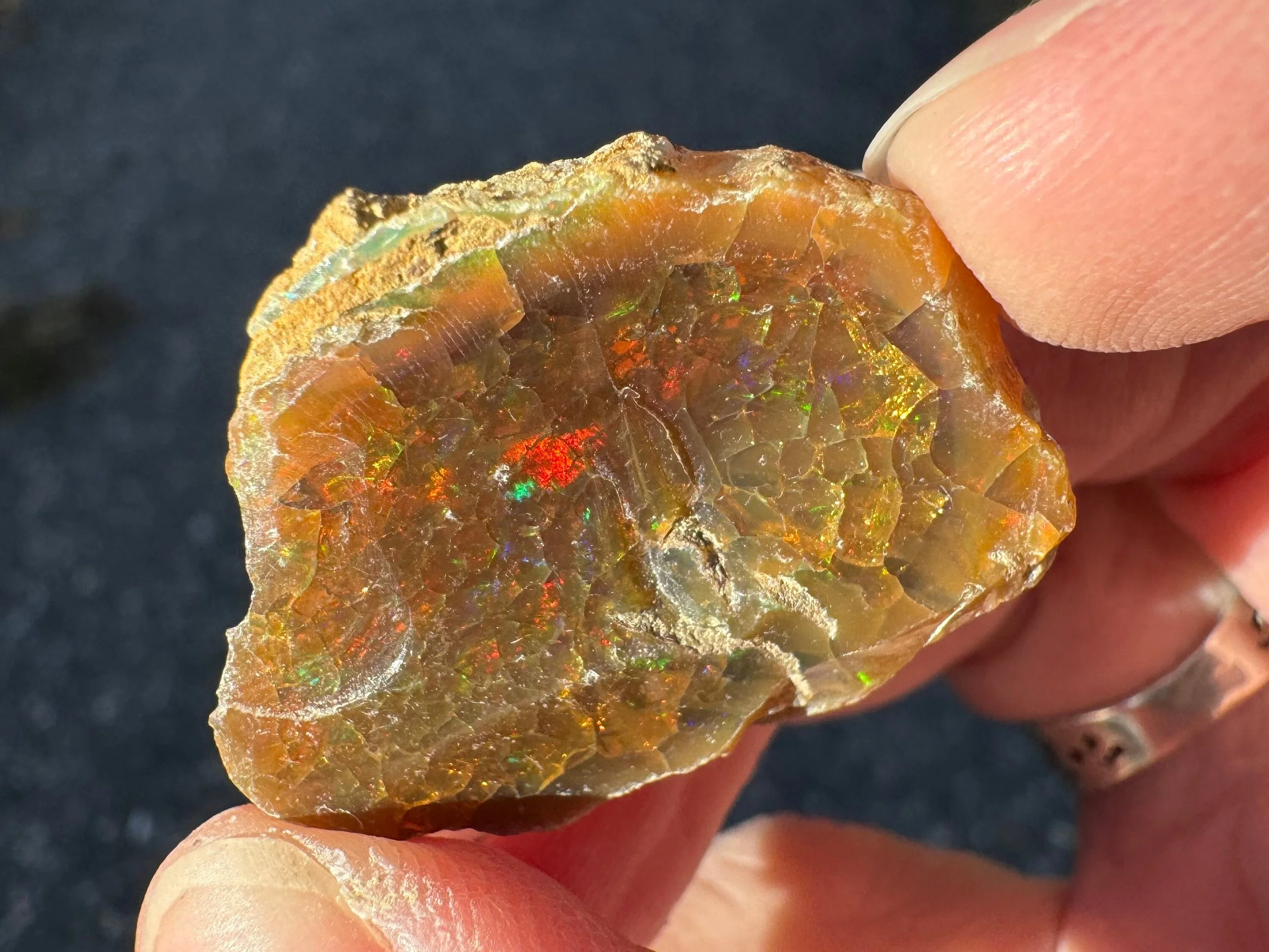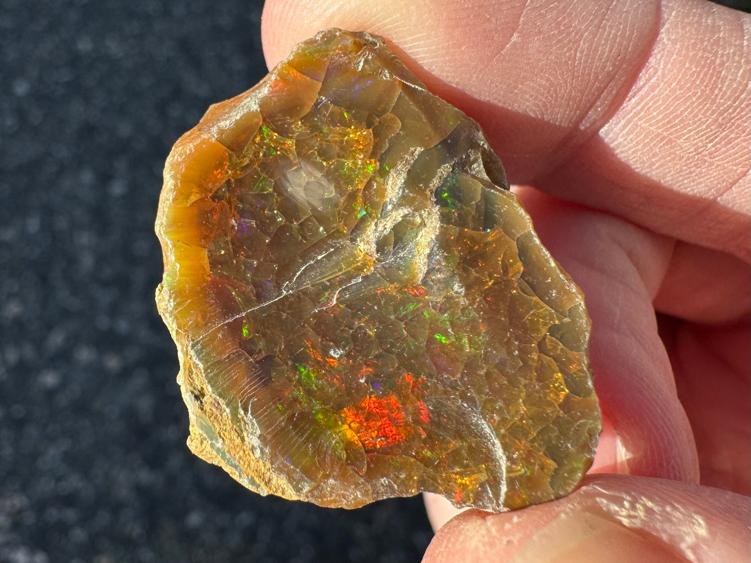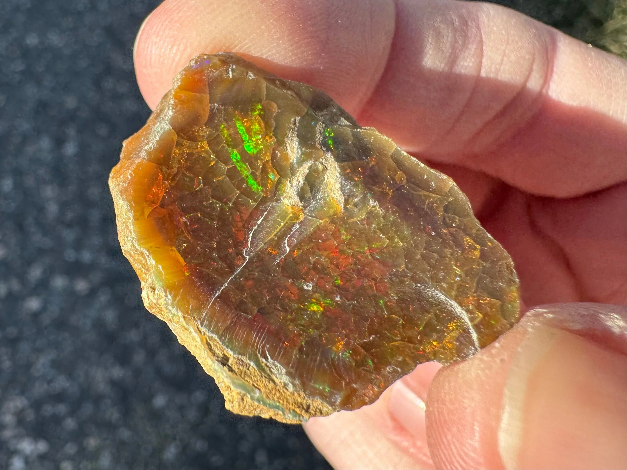 This is a flashy, rough Ethiopian chocolate Opal. Also called a brown Welo opal. It is a raw opal with full, bright rainbow flash all over. Very flashy opal and much better in person!