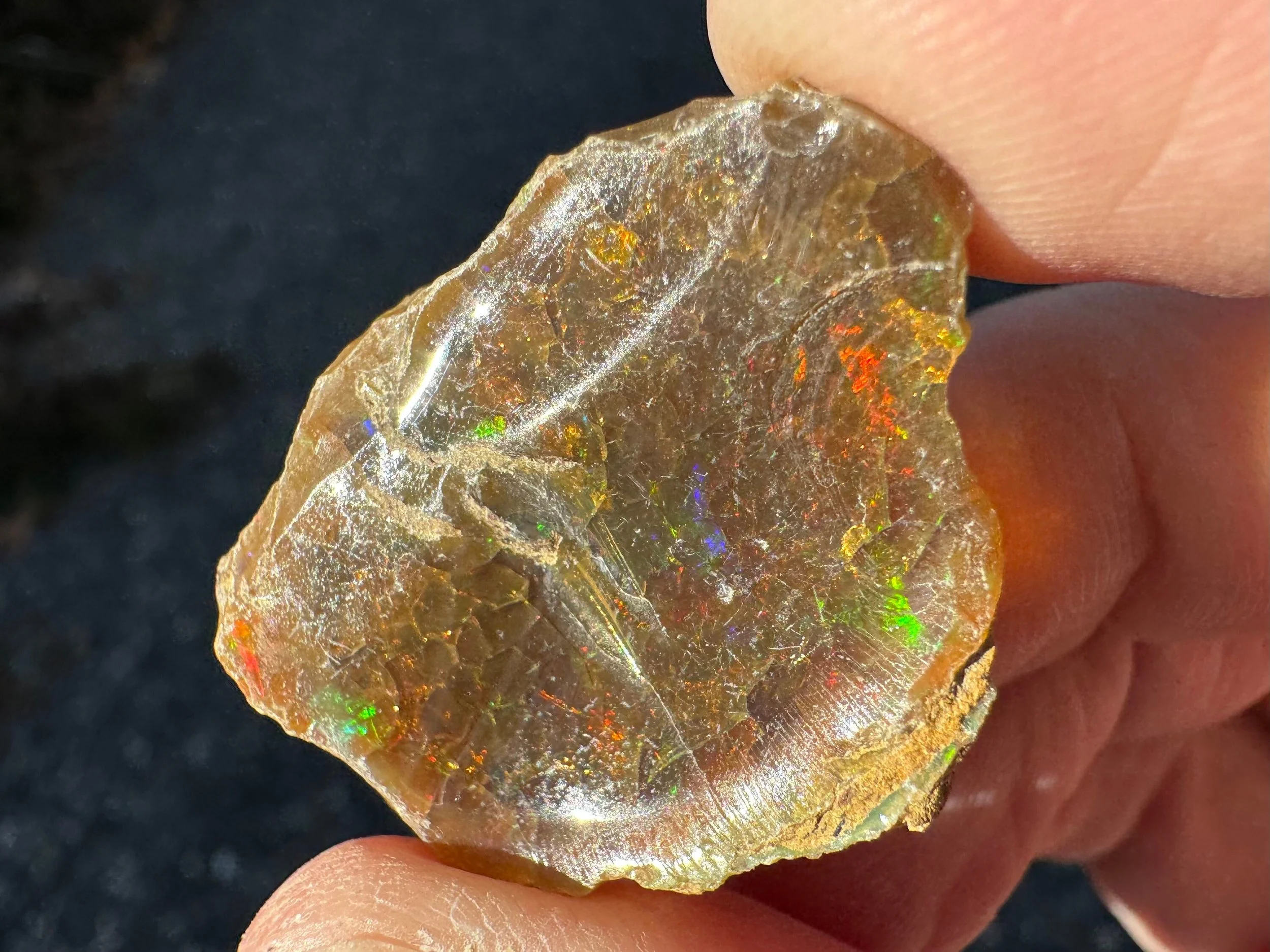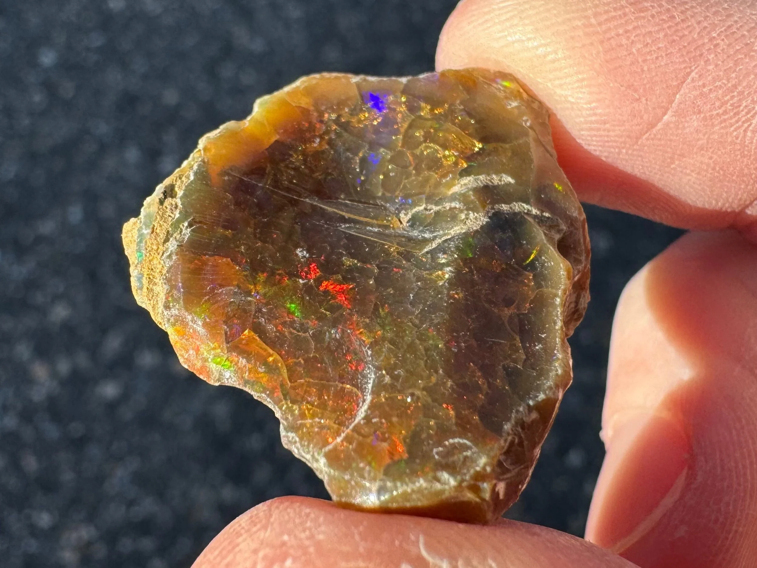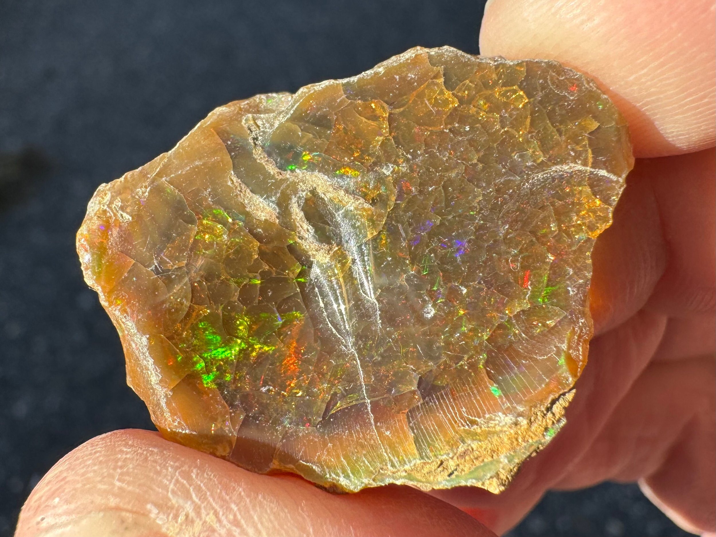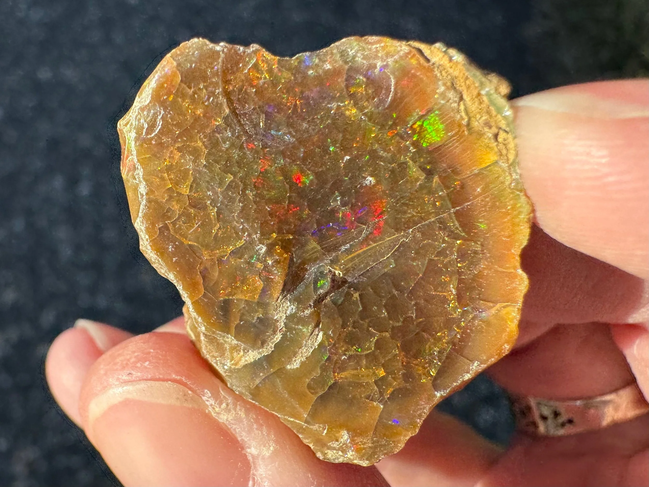 This is a flashy, rough Ethiopian chocolate Opal. Also called a brown Welo opal. It is a raw opal with full, bright rainbow flash all over. Very flashy opal and much better in person!