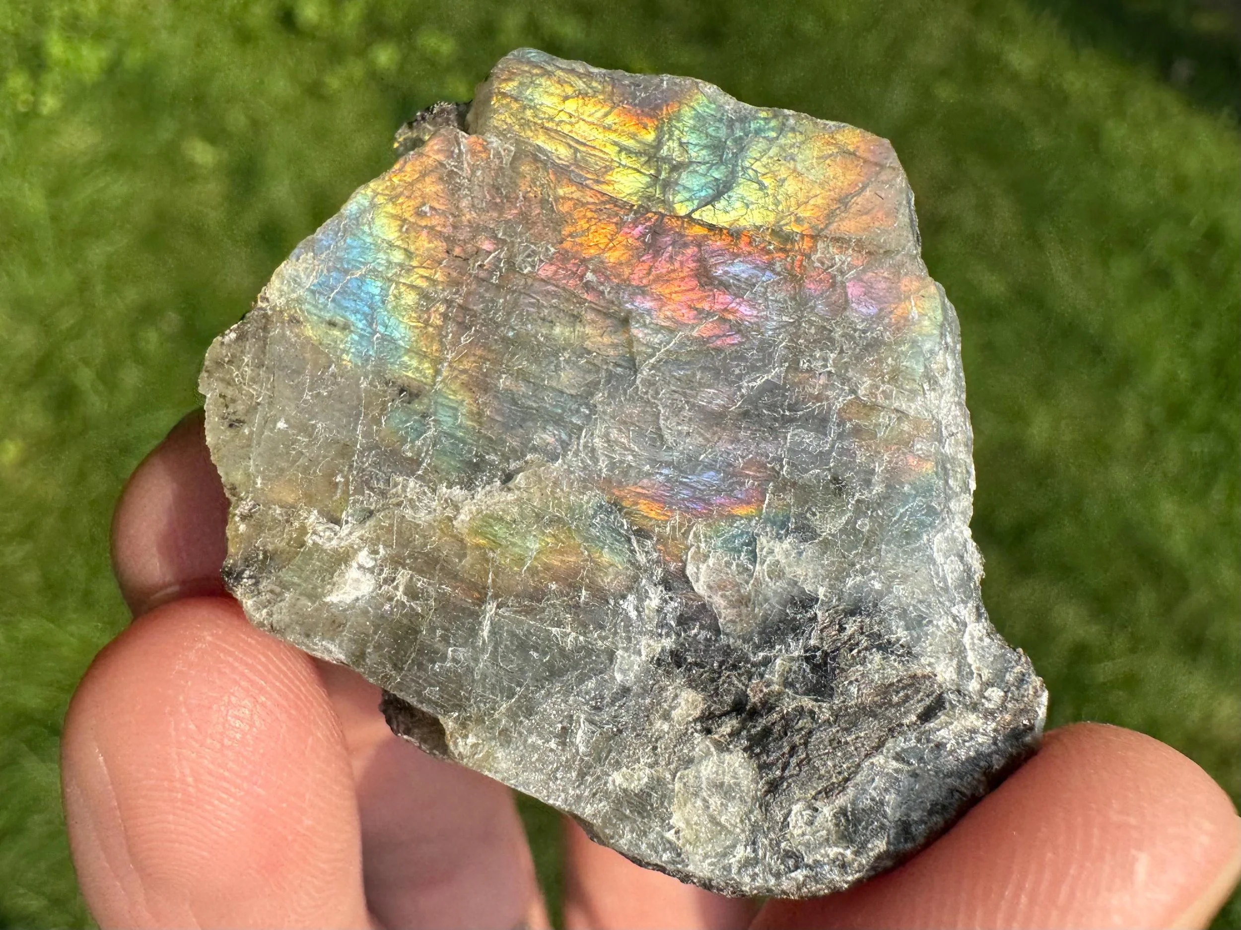 This is a really fantastic bright and flashy rough piece of Labradorite with bright purple, pink and rainbow flash. It has the rainbow in there but the purple and pink is really good in this beauty. Often called "Fire Labradorite" with this special coloring. Perfect take-along size.