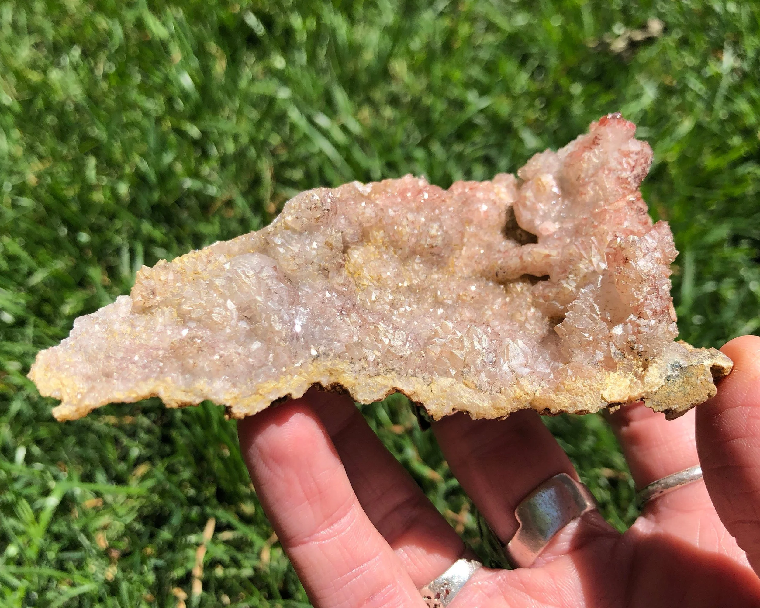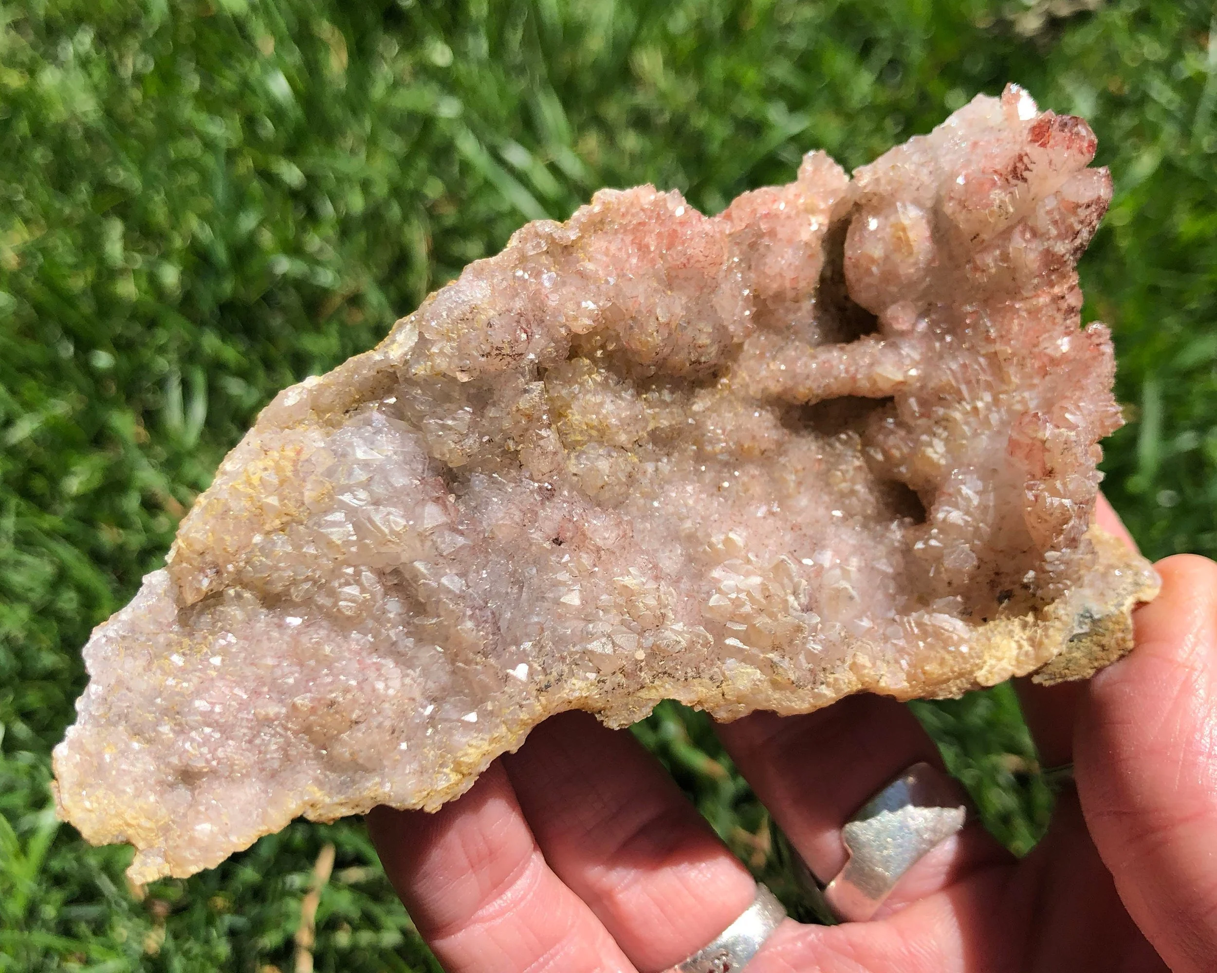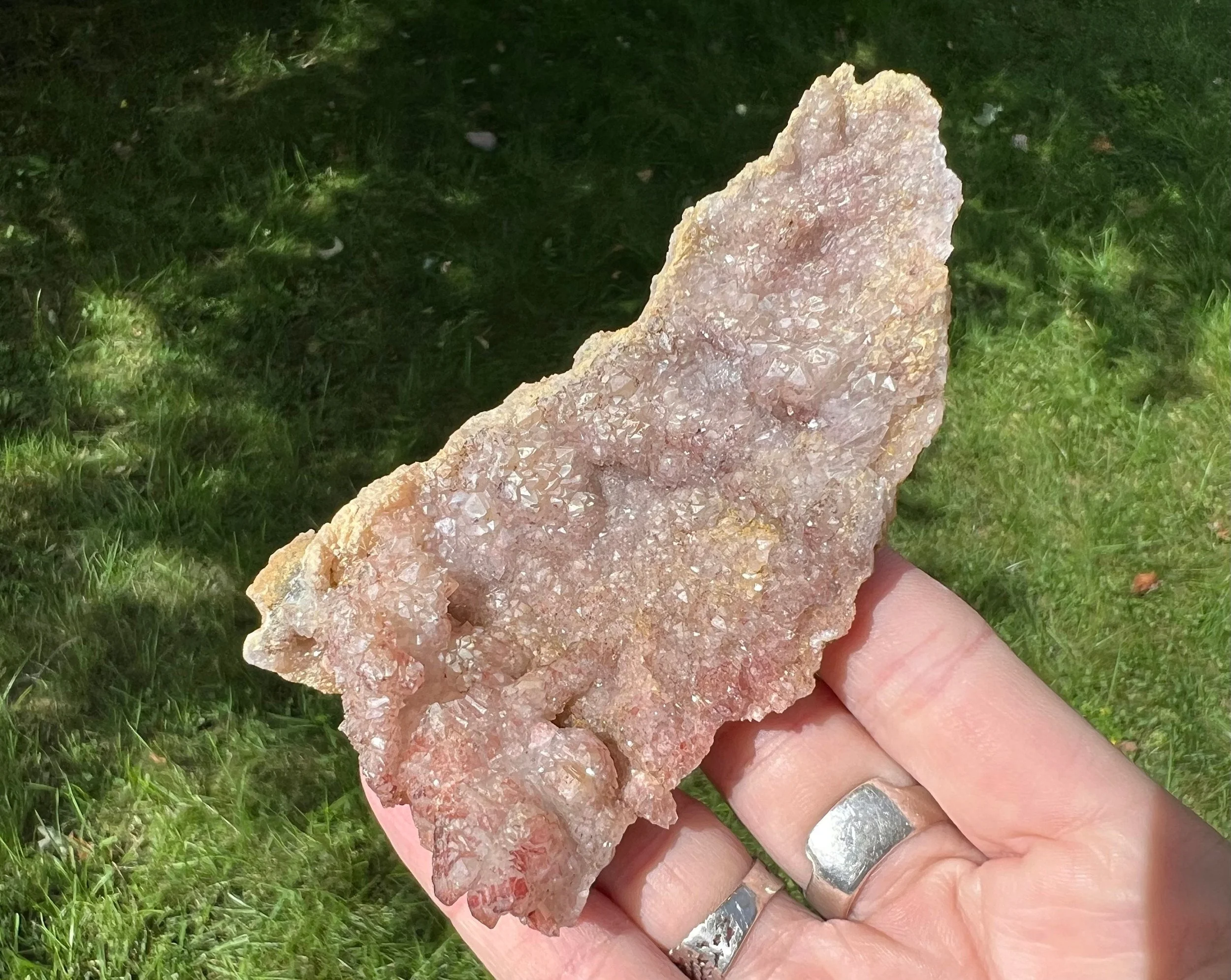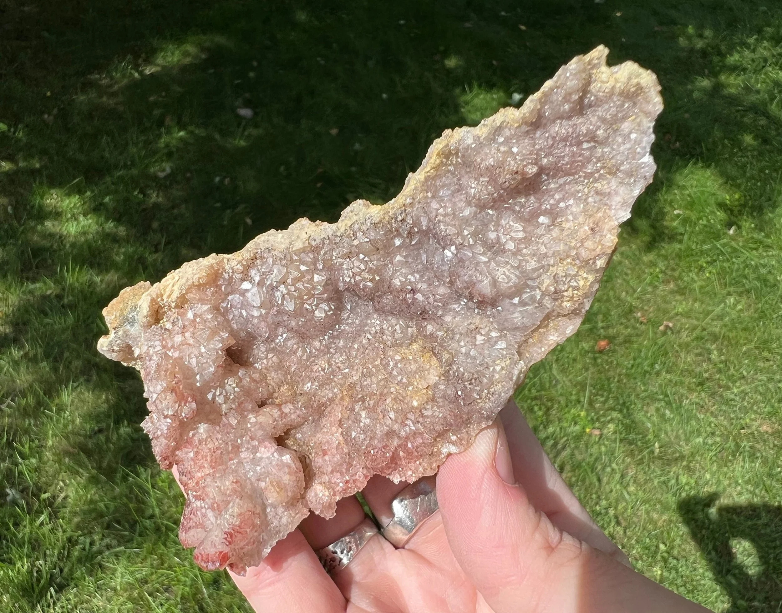 This is a very unique and awesome piece of a Moroccan Amethyst that has red Hematite coloring, a couple little Stalactite formations, and flower formations where longer, flat crystals create formations like flower petals. This piece is very pretty and sparkly! <3